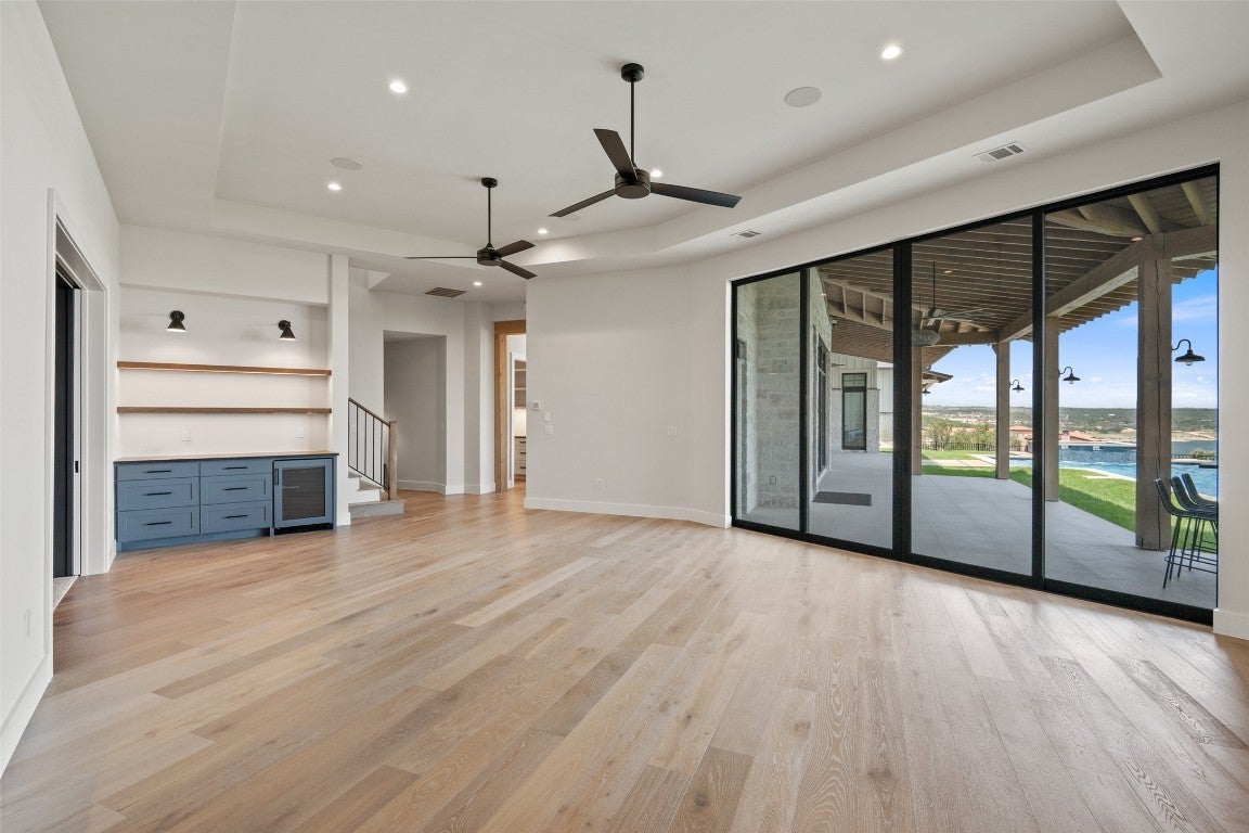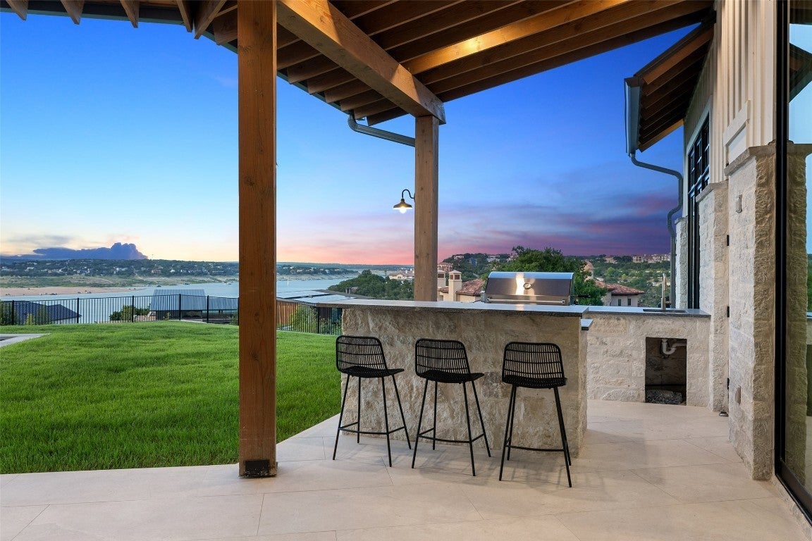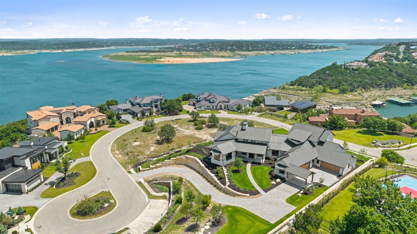 Exceptional custom estate located in the luxury gated Peninsula community within Rough Hollow, offering panoramic Lake Travis and Hill Country views from nearly every room. Set on a private drive off a cul-de-sac, this residence blends refined design with resort-style living. A grand porte-cochère entry leads to an open-concept interior with antique hand-hewn beams, expansive windows, and seamless indoor–outdoor flow. The large family room opens to a gourmet chef’s kitchen featuring top appliances, custom cabinetry, an oversized island, and a full butler’s pantry. Additional living spaces include a formal dining area, library/reading nook, game room, and dedicated home theater. The home offers 5 spacious bedroom suites, each with an ensuite bath. The luxurious primary suite includes private pool access, a spa-style bathroom with oversized walk-in shower and soaking tub, a vast closet with washer/dryer, and an adjacent sitting/exercise room. Secondary bedrooms feature lofts and stunning views. A large home office includes a private lake-view patio, plus an adjacent project room and separate storage. The home is equipped with extensive tech wiring and a full camera/security system. Outdoor living includes a resort-size pool and spa, covered lounge, and complete outdoor kitchen. The expansive yard offers room for a sport court or recreation area. A gentle path leads to private boat-slip access, with an available slip. Additional features: Oversized 4-car garage. Workshop/gym off garage. Private cul-de-sac setting. Large usable yard. A rare opportunity to own one of the premier homes in Rough Hollow's most sought-after-enclave.
