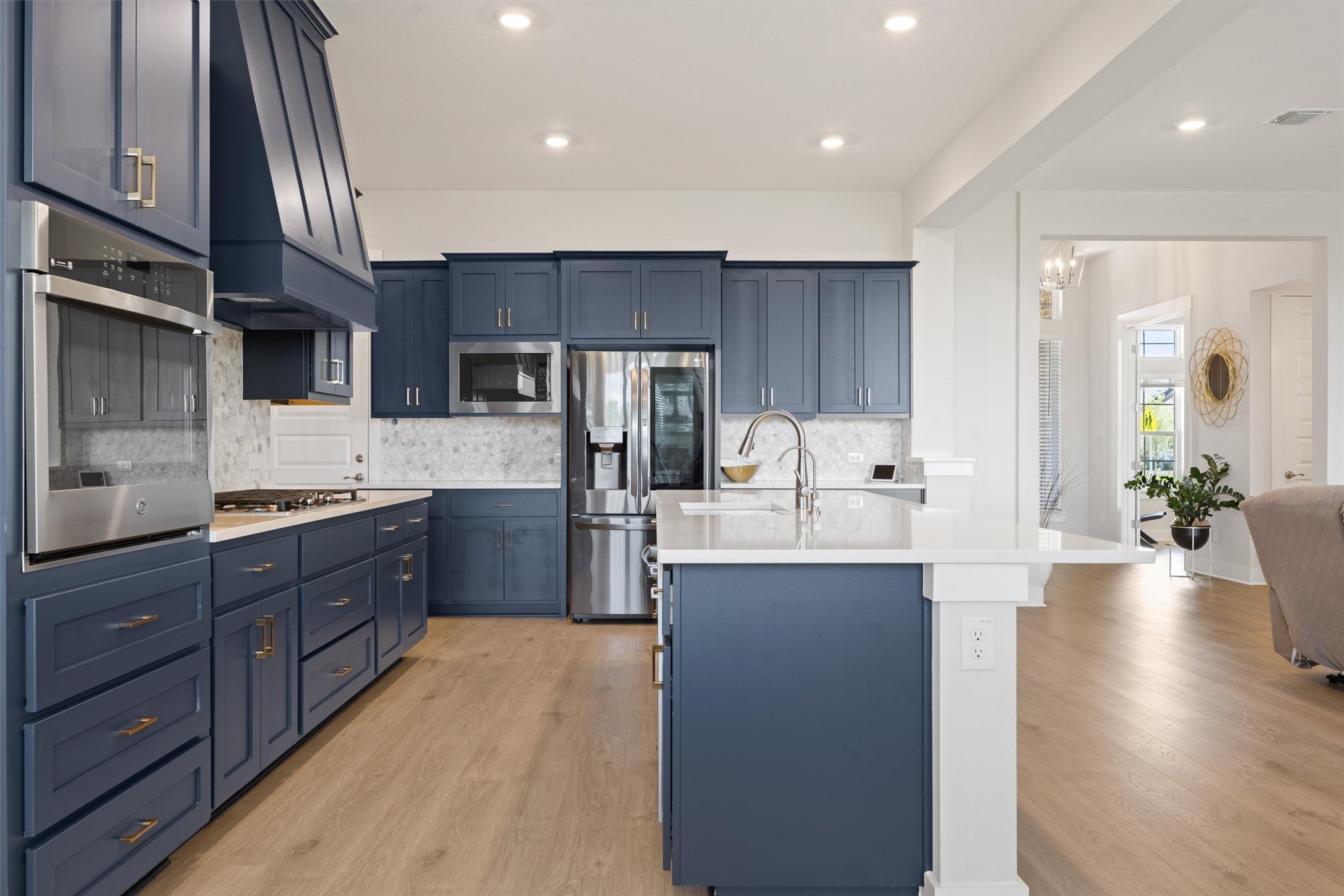 PRICE IMPROVED! Move-in ready home offering generous living space near Leander ISD's top schools. This home offers an outdoor retreat with the space and serenity to bring your vision to life. Thoughtfully designed by Chesmar Homes, this Remington floor plan home features 4 spacious bedrooms, 3.5 bathrooms, a 3-car garage and 3,600 sq ft of stylish living. Inside, discover expansive windows and wood flooring throughout the main level including the primary suite and an office space for remote work or study. The living room showcases a sleek tile accent wall and built-in glass fireplace that brings warmth and style to the open-concept layout. Natural light fills the home, creating a bright and welcoming ambiance. The kitchen is a chef's delight with elegant custom blue cabinetry, quartz countertops, a designer backsplash, soft-close drawers, an oversized island, walk-in pantry and top-of-the-line appliances. Dining and living areas overlook the lush backyard and lead to an extended covered patio perfect for morning coffee. The spacious primary suite offers greenbelt views, an ensuite bath with a Marie Antoinette French-style soaking tub, dual vanities, a walk-in shower with bench and two walk-in closets. Elegant blue cabinetry continues in all bathrooms for a luxurious touch. Upstairs includes a guest suite with private bath and walk-in closet, two bedrooms with a Jack & Jill bath, spacious game room, built-in desk for extra office space and a second patio to enjoy the stunning views. Additional features include a water softener, EV charger, gas line on the patio prepped for an outdoor kitchen, a spacious laundry room and epoxy-coated garage floors. Enjoy access to parks, ponds, trails, and two community pools, including a new one just minutes away. In Leander ISD, this home is walkable to Tarvin Elementary and near H-E-B Plus, Lakeline Park & the upcoming Northline development.