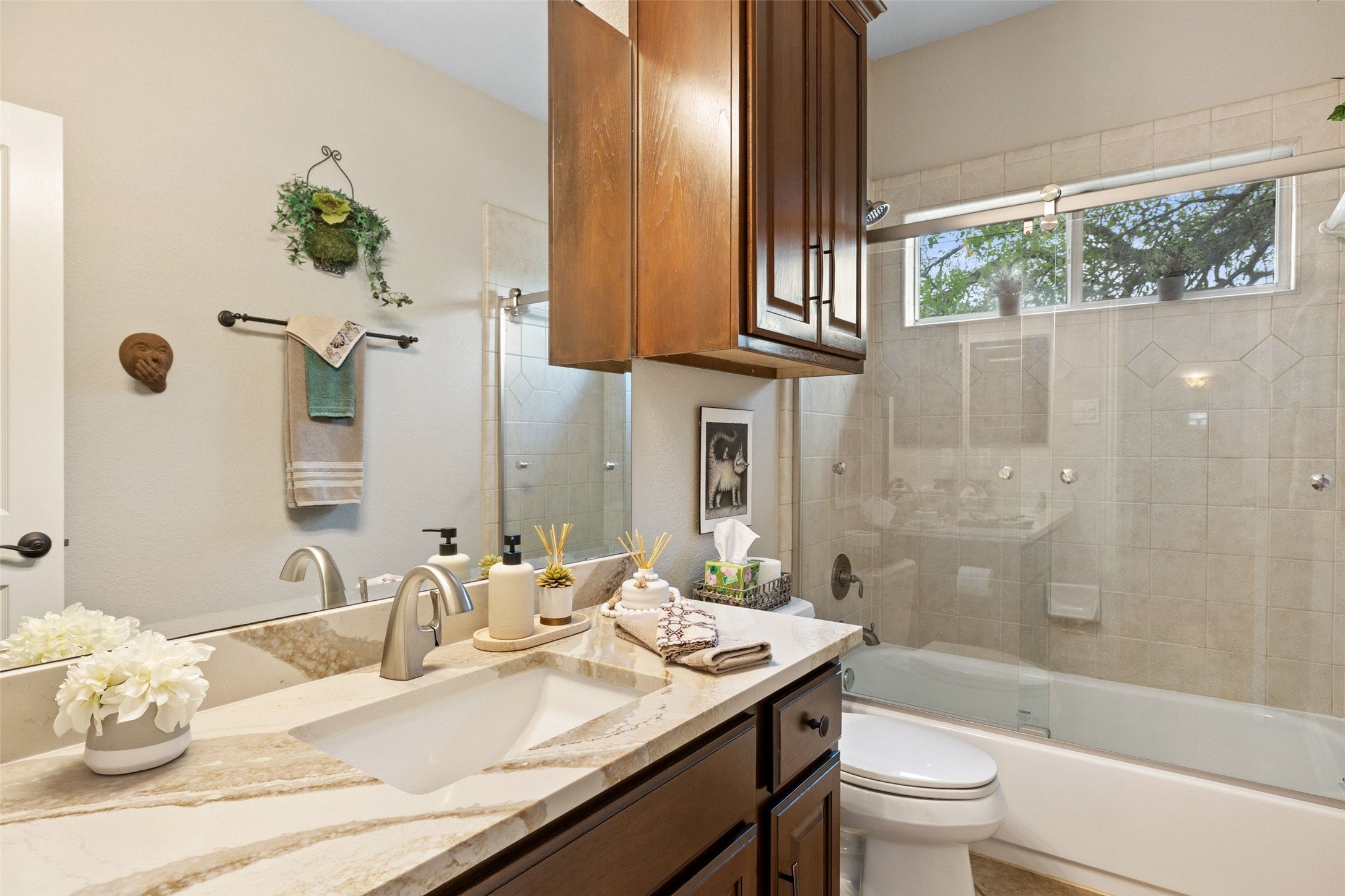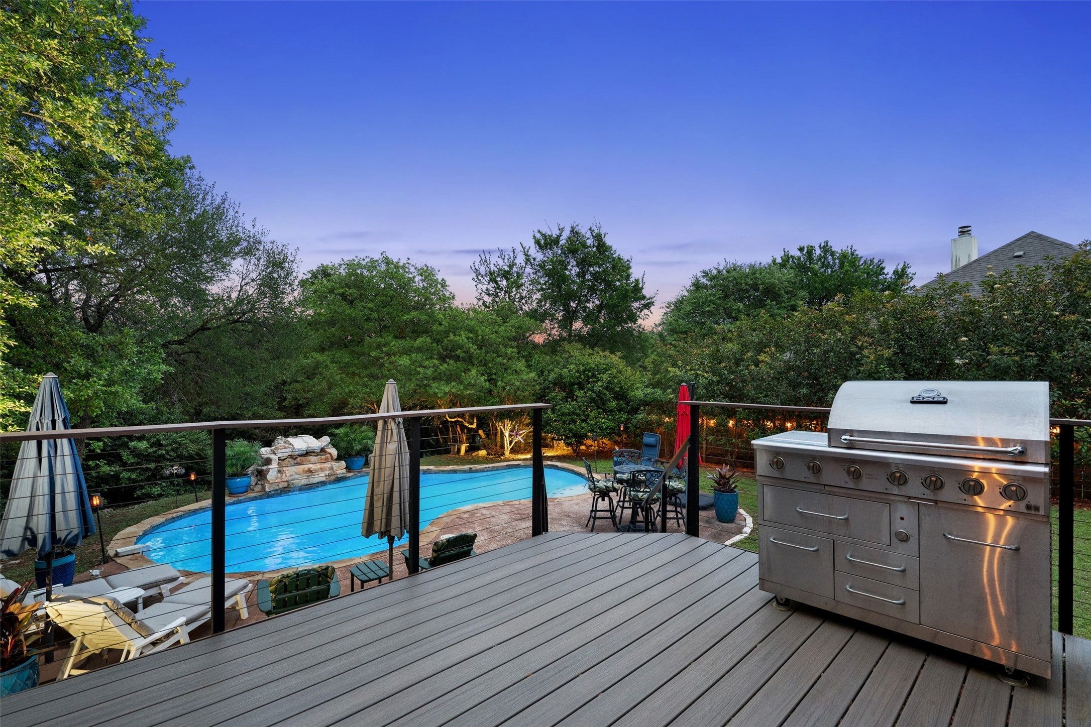 Perfectly positioned between Lake Austin & Lake Travis, two of Austin's premier lakes, meet the Nightingale Retreat, a thoughtfully curated & cherished single-story home in the Canyons of Cardinal Hills, lovingly maintained over the years of ownership & ready to welcome its next chapter. From the moment you arrive, a cozy, quaint & picturesque front porch with a seating area & a long private set-back driveway set a tone of warmth & seclusion, leading to a two-car garage. Inside, a separate front foyer, perfect for a seating area, opens into three distinct living spaces: two separate interior living rooms & a covered outdoor patio complete with flat-screen TV & ceiling fans, serving as a true third living space for those easy, cozy Hill Country evenings. 4 Bed Rm's & 3 Bath span 2,494 sqft of warm, considered living on one graceful single-story level. The primary suite is privately positioned on the left wing, a spa retreat featuring dual vanities, a glass-enclosed walk-in shower with dual shower heads, a soaking tub, spacious walk-in closet & a cozy seating area overlooking lush greenery, while three additional bedrooms offer flexibility for guests or a home office. The main living areas feature a stone floor-to-ceiling fireplace accent wall, hand-scraped hardwood floors, stained concrete, stainless steel appliances, a gas range & finishes chosen with genuine care. Outside, a grotto-style pool with natural rock water feature anchors a resort-style backyard where an expansive deck frames sweeping panoramic Hill Country views & a park-like yard provides enough space to enjoy your own private walking trail, plus a cozy fire pit area at the back perfect for s'mores & campfire stories under the oaks. Minutes from Lake Austin & Lake Travis, top-rated schools, local dining & an exceptional active lifestyle, renowned public & private golf, world-class tennis, boating & yachting & all Austin has to offer. This location is just as exceptional as the home itself. Welcome home.