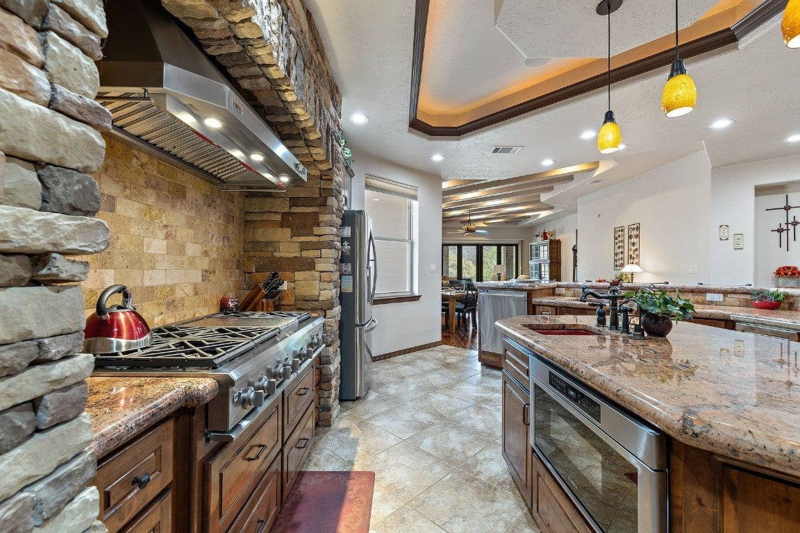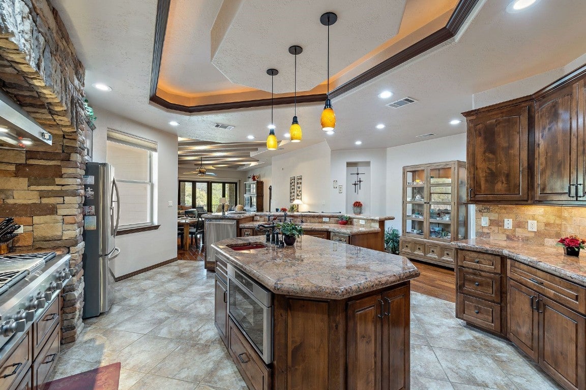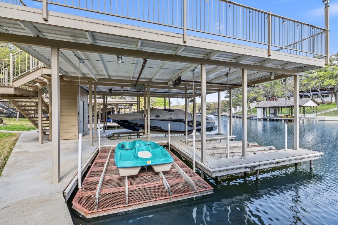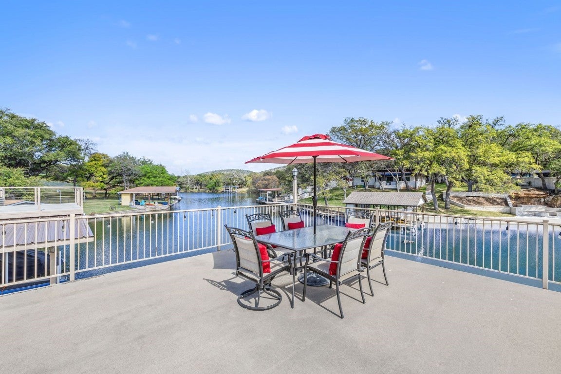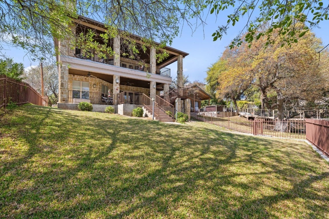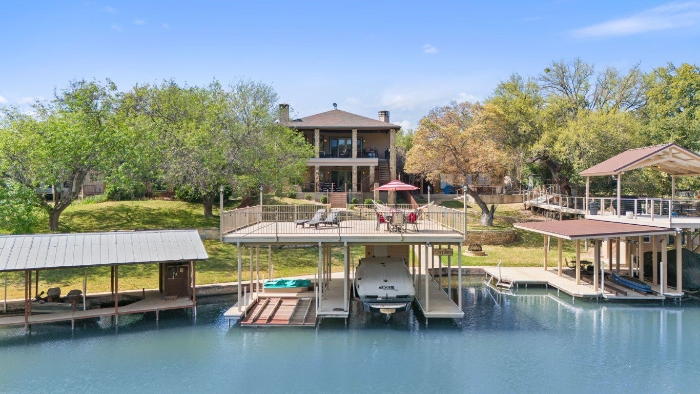 Escape to your dream lake house at 1413 County Road 132-A, an absolutely gorgeous custom-built retreat on the serene shores of stunning Lake LBJ. Nestled in a peaceful, quiet cove on a lush quarter-acre lot shaded by majestic large oak trees, this property offers 57’ of fantastic cove waterfront in a truly idyllic setting—perfect for those seeking tranquility and timeless lake charm. This quality-crafted 5-bedroom, 5-full-bath masterpiece is priced to sell and designed for luxurious lake living. Step into a grand open-concept living room featuring a magnificent stone fireplace and seamless flow to the chef’s kitchen, complete with custom cabinetry, a gas cooktop, expansive breakfast bar, and gleaming granite countertops. Downstairs, a spacious media/game room provides endless entertainmentoptions.Indulge in seamless indoor-outdoor living with upper and lower level patios, each offering breathtaking Lake LBJ views and ample space for al fresco dining and gatherings. The quiet cove is a water lover’s paradise, ideal for swimming, fishing, paddleboarding, kayaking, water sports, sunning on the deck, or simply feeding the ducks. The boathouse features an electric boat lift, four jet ski lifts and a large upper deck entertaining area for sunset soirées. LIFE IS SHORT! BUY THE LAKE HOUSE!