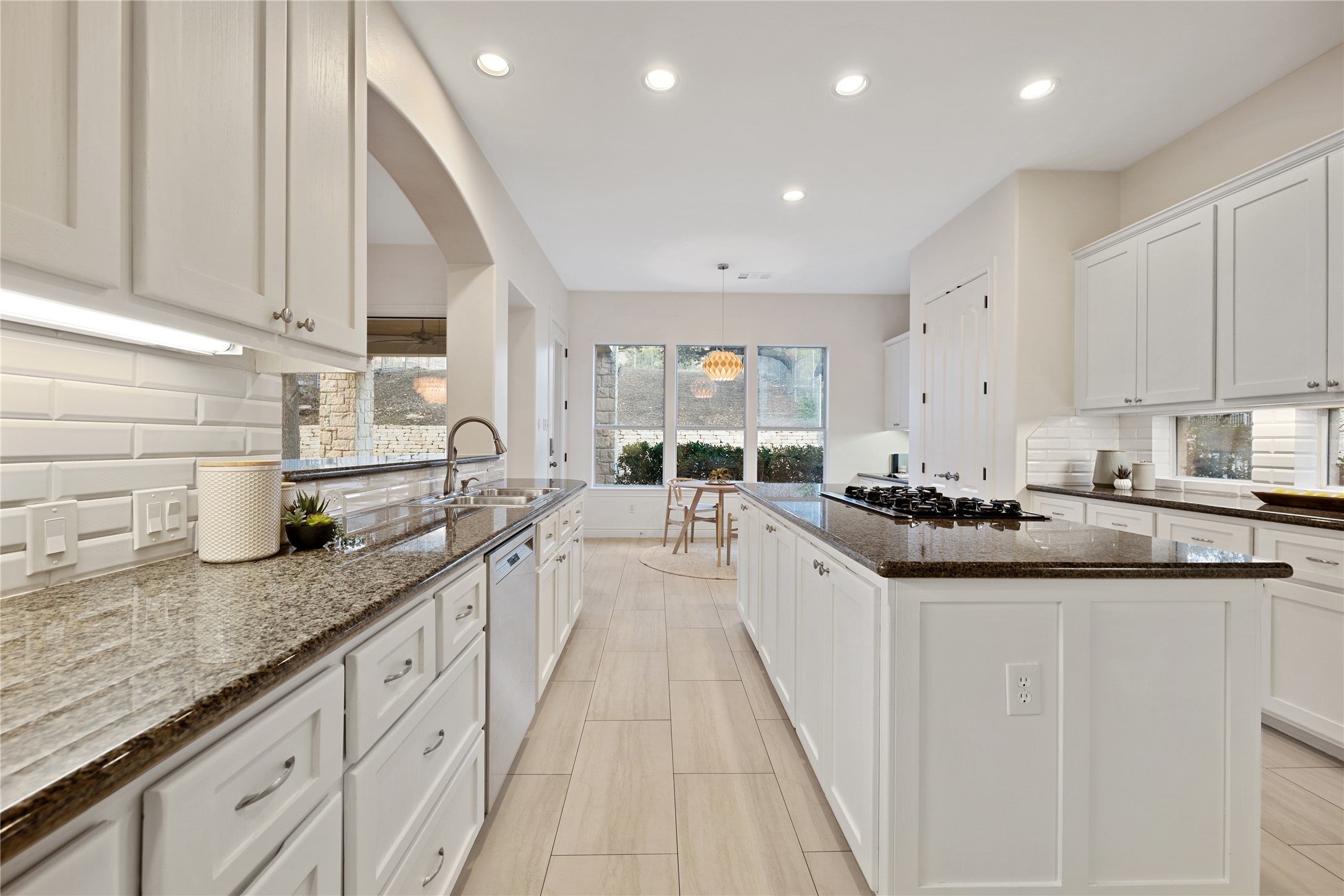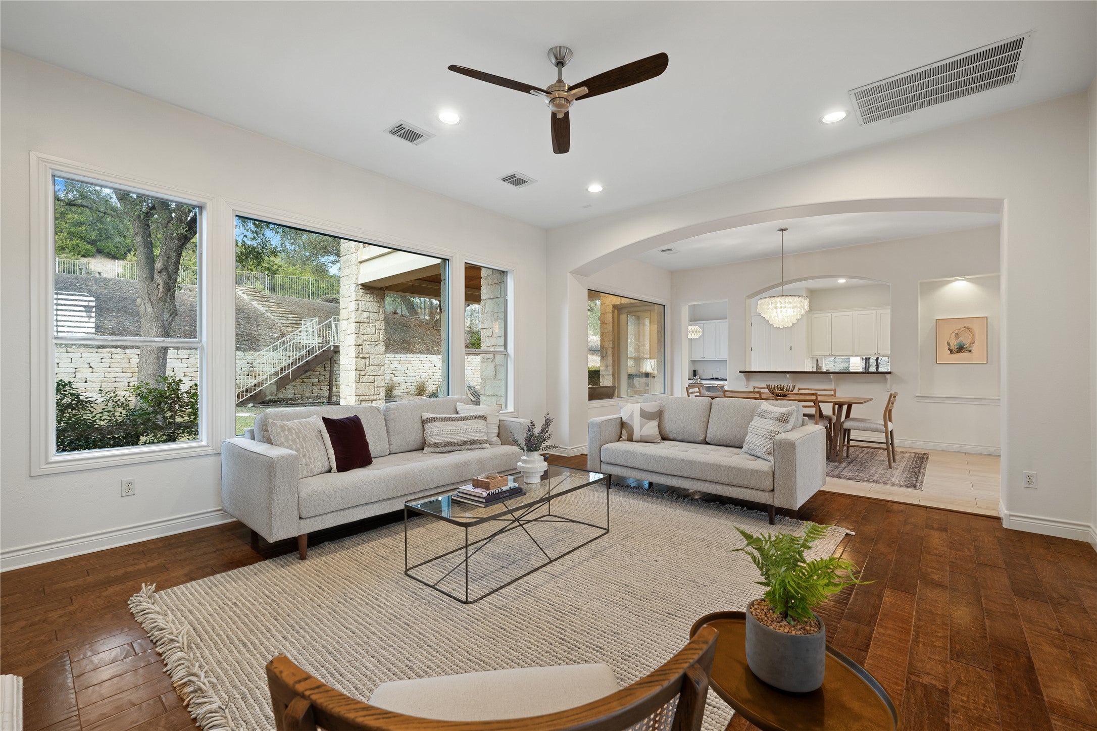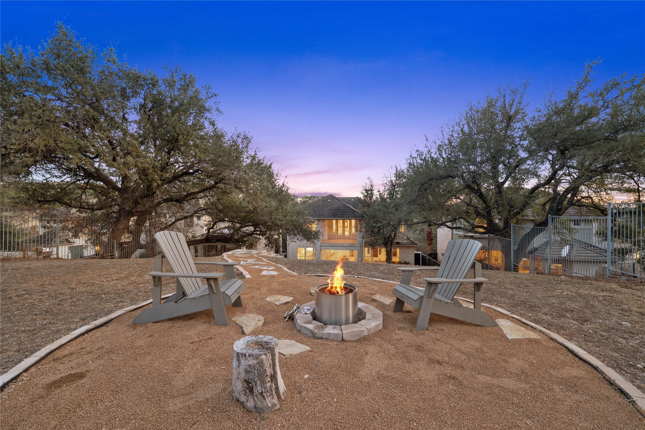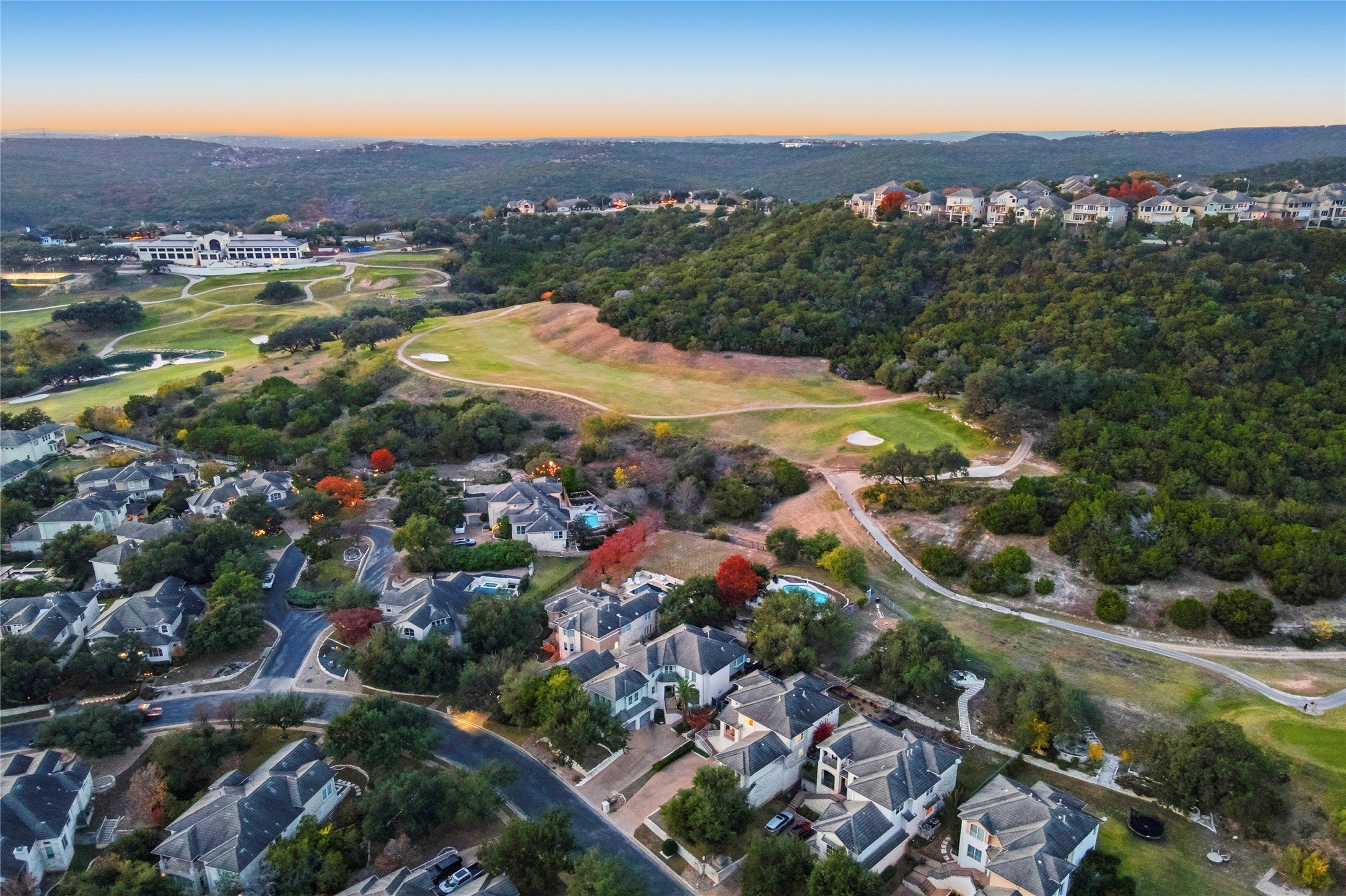 Nestled within the exclusive gated enclave of The Greens of River Place, this exceptional residence offers a sophisticated lifestyle surrounded by the lush landscapes of the River Place Golf Course. Spanning 3,506 square feet, the home is defined by an abundance of oversized windows that flood every room with natural light. The heart of the home is a spacious kitchen equipped with granite countertops and stainless steel appliances, flowing effortlessly into both breakfast, formal dining, and the outdoor covered patio. Enjoy sitting by the fireplace in the open living and looking out the huge windows to the backyard. The main level also offers a massive flex space currently configured as a media room, but its generous proportions make it equally suited for a high-end home gym, a secondary home office, or a spacious playroom. The second level serves as a private retreat, anchored by a primary suite featuring high ceilings, a beautifully updated bathroom with Kohler soaking tub, huge closet, and a private walk-out covered patio, perfect for a morning coffee. Two additional bedrooms and a dedicated office nook provide ample space for family or remote work. Functional details are integrated throughout the home, including a generous laundry room with built-in cabinetry and a two-car garage with extensive storage capacity, tile roof, and lots of storage closet space. Outdoor living is a focal point of the property, featuring a two stories of covered along with a two flat areas in the tiered backyard. Enjoy the relaxing evenings around the outdoor fire pit while taking in the sunsets. Located within the Leander ISD with bus service and feeding into award-winning schools like Vandegrift High (won state in academics and multiple sports), the home is just steps from Suntree Park and miles of nature trails. With the Domain only 9 miles away and downtown Austin within 12 miles, this home perfectly balances secluded community living with urban convenience.