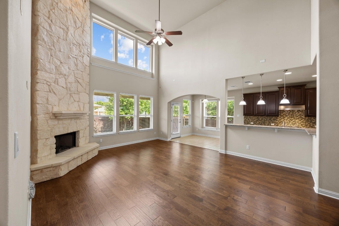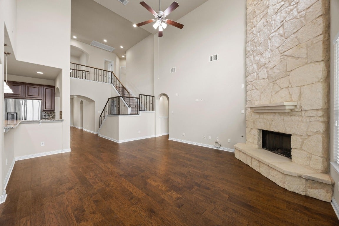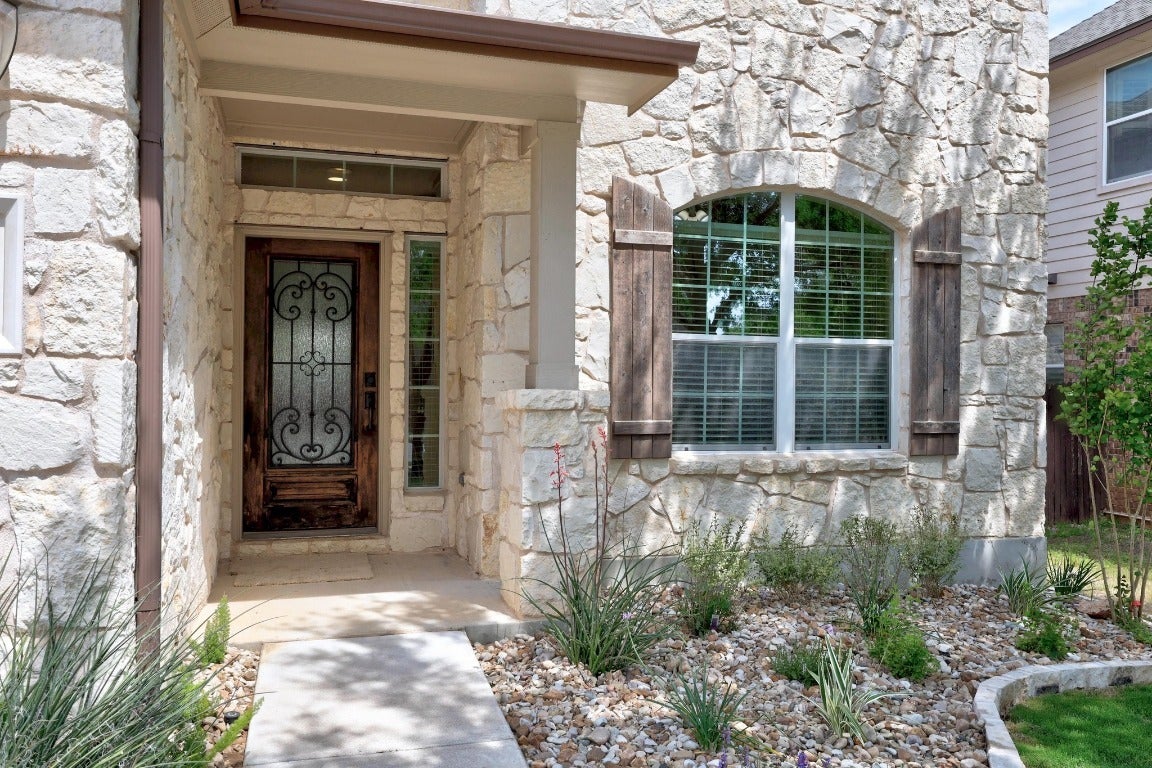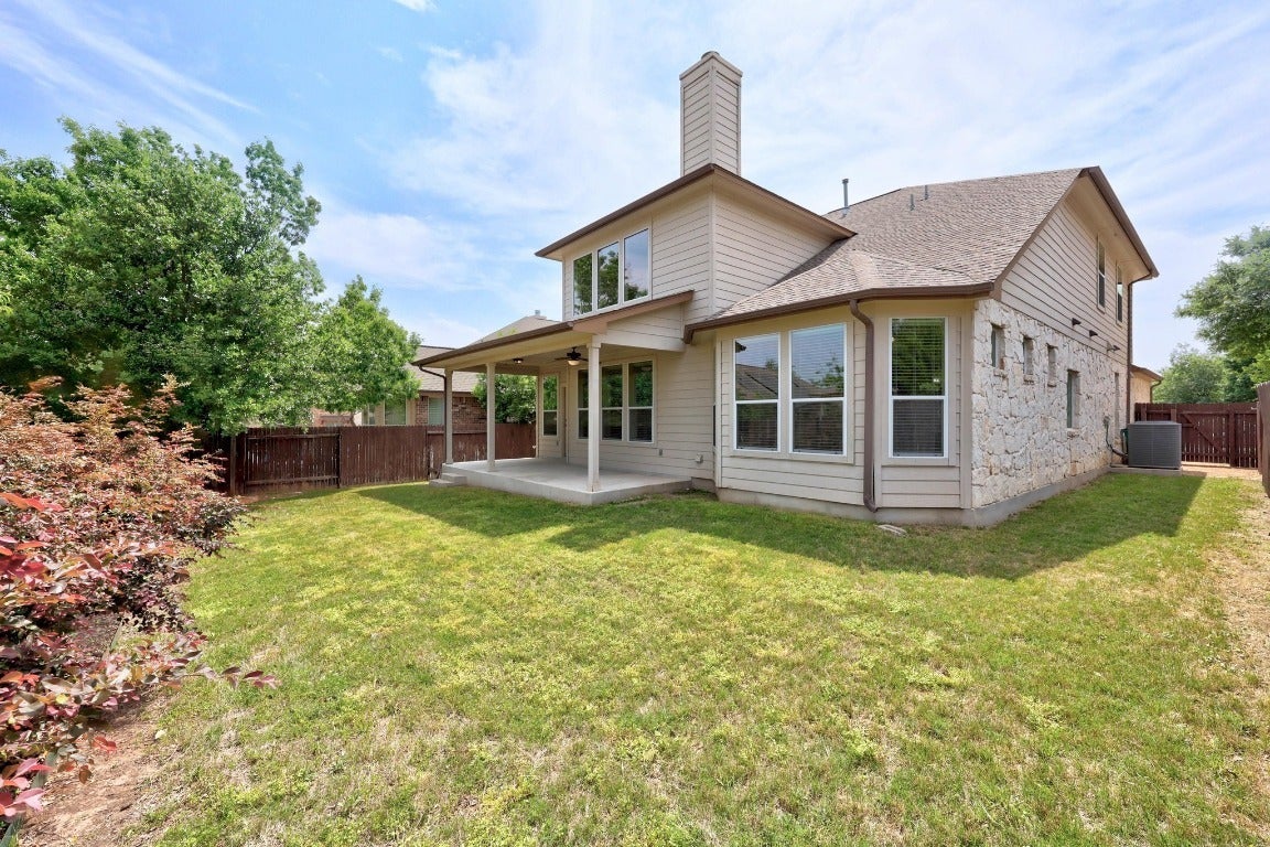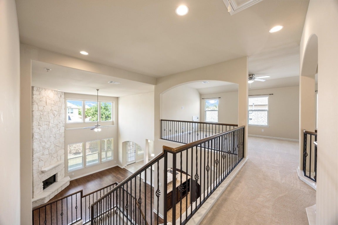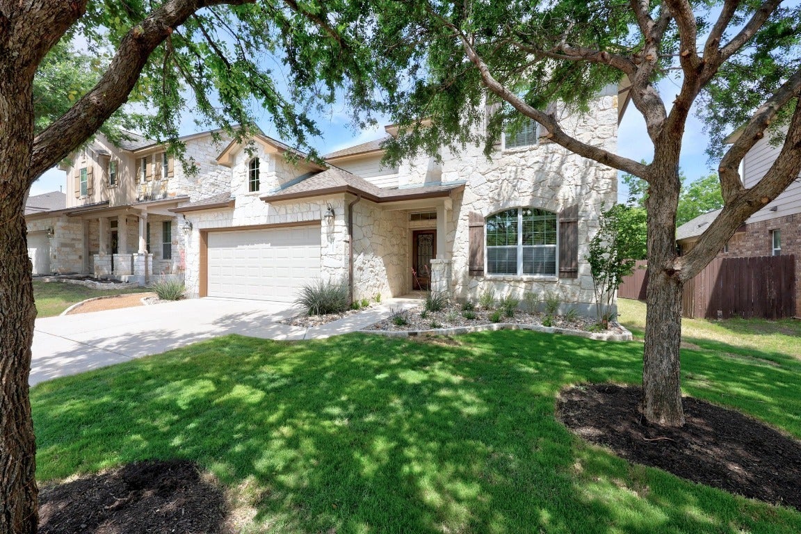 NEW PRICE! (30 year dimensional shingle roof installed May 2025) Step into this beautifully updated, light-filled home and prepare to be impressed. Gleaming hardwood floors and plush carpet throughout (2025), soaring ceilings, and a stunning floor-to-ceiling stone fireplace make a striking first impression. Bathed in natural light from abundant windows, the open-concept living room flows effortlessly into a sunlit breakfast nook and dream kitchen—expansive granite countertops, stainless appliances (including a newer refrigerator), a large bar for casual dining, and a generous amount of cabinetry that extends into a butler’s pantry connecting the formal dining room. ***With 5 bedrooms and 4 full baths and an office, this home offers flexibility for any lifestyle. Downstairs, the spacious primary suite features a spa-like bath with soaking tub, walk-in shower, double vanities, and a walk-in closet. A second downstairs bedroom and full bath steps away make an ideal guest suite.***Upstairs, the soft new carpet welcomes you to three additional bedrooms—including one with its own private full bath—plus a versatile media room or casual living area that overlooks the grand living space below.***The freshly landscaped front yard with new rock beds of native Texas plants. The young Crepe Myrtle promises years of beauty against the home’s Austin stone exterior. New sod has been added and a decomposed granite path leads to the backyard, where you’ll find another charming rock garden beside the garage. ***Located in the highly desirable Ranch at Brushy Creek and zoned to acclaimed Round Rock ISD schools, this home is minutes from major employers & shopping and is surrounded by family-friendly amenities. Explore the nearby 90-acre Brushy Creek Lake Park with nature trails, kayaking, fishing, dog pond and more —or enjoy the community pool just blocks away.