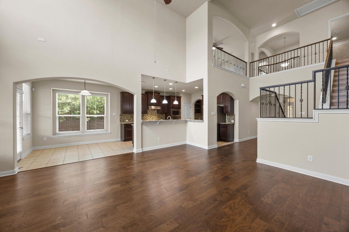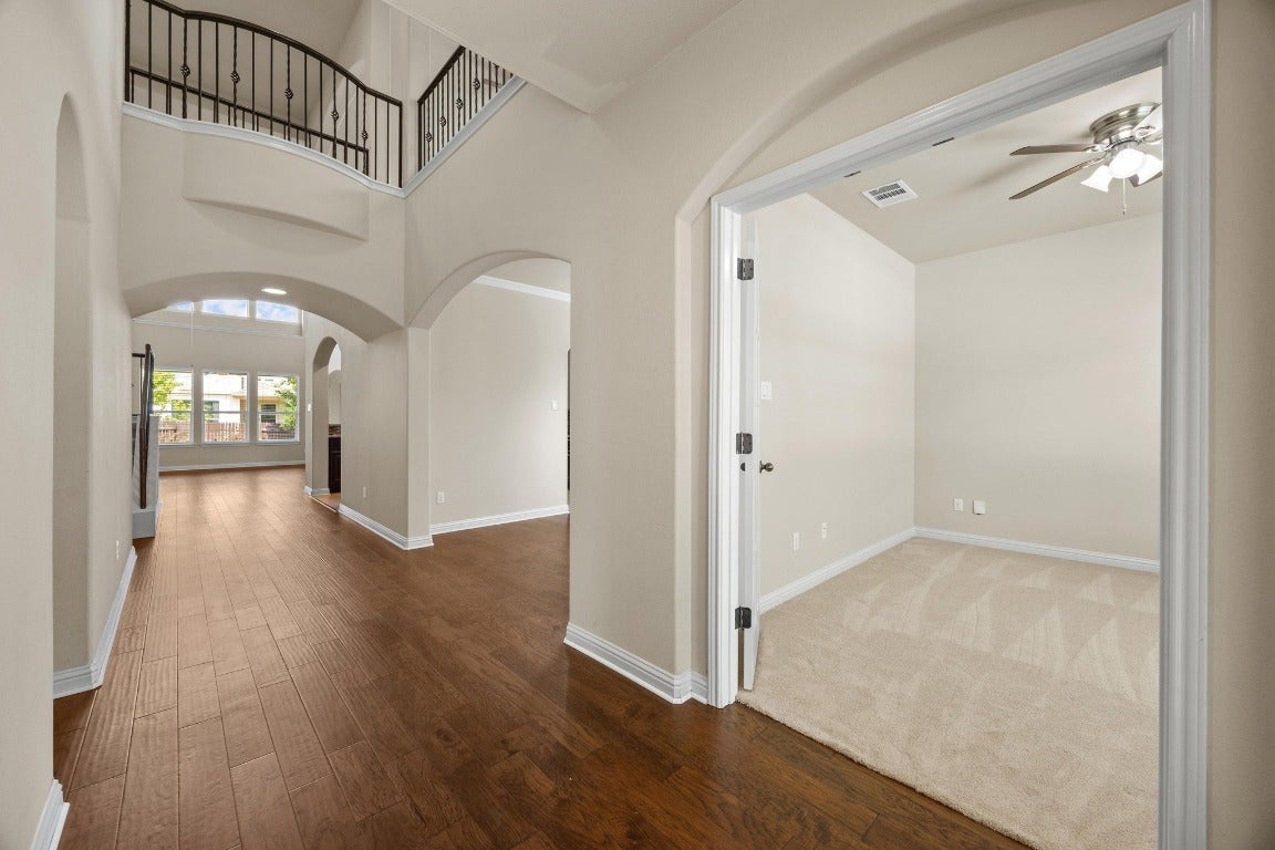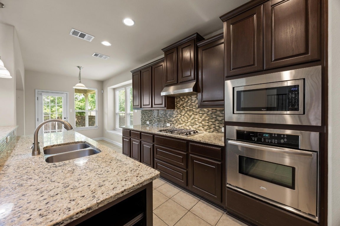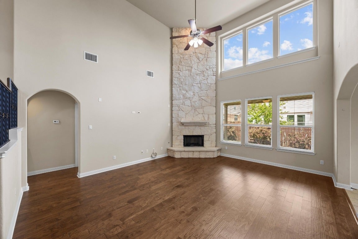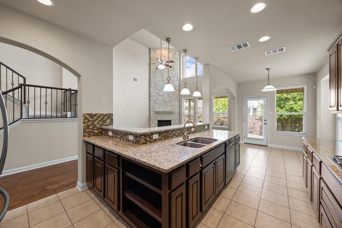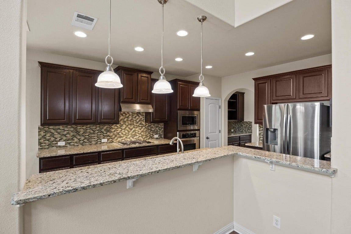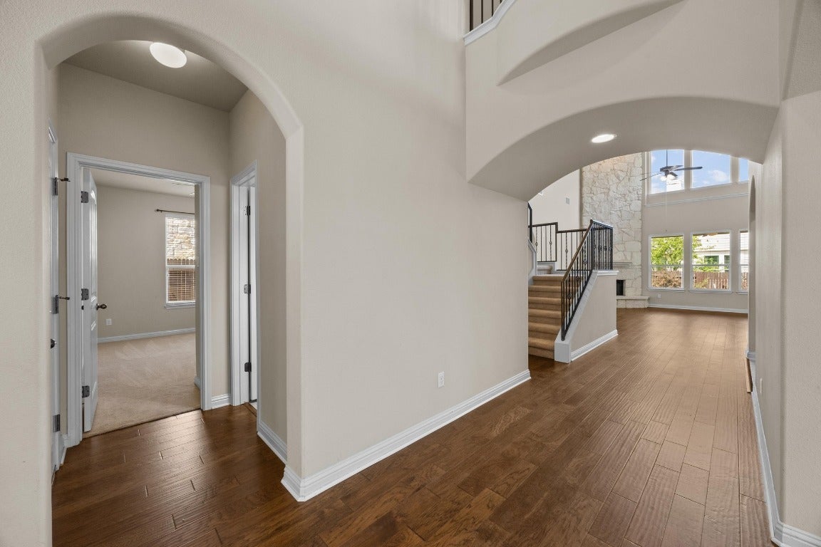 NEW PRICE! (30 year dimensional shingle roof installed May 2025) Step into this beautifully updated, light-filled home and prepare to be impressed. Gleaming hardwood floors and plush carpet throughout (2025), soaring ceilings, and a stunning floor-to-ceiling stone fireplace make a striking first impression. Bathed in natural light from abundant windows, the open-concept living room flows effortlessly into a sunlit breakfast nook and dream kitchen—expansive granite countertops, stainless appliances (including a newer refrigerator), a large bar for casual dining, and a generous amount of cabinetry that extends into a butler’s pantry connecting the formal dining room. ***With 5 bedrooms and 4 full baths and an office, this home offers flexibility for any lifestyle. Downstairs, the spacious primary suite features a spa-like bath with soaking tub, walk-in shower, double vanities, and a walk-in closet. A second downstairs bedroom and full bath steps away make an ideal guest suite.***Upstairs, the soft new carpet welcomes you to three additional bedrooms—including one with its own private full bath—plus a versatile media room or casual living area that overlooks the grand living space below.***The freshly landscaped front yard with new rock beds of native Texas plants. The young Crepe Myrtle promises years of beauty against the home’s Austin stone exterior. New sod has been added and a decomposed granite path leads to the backyard, where you’ll find another charming rock garden beside the garage. ***Located in the highly desirable Ranch at Brushy Creek and zoned to acclaimed Round Rock ISD schools, this home is minutes from major employers & shopping and is surrounded by family-friendly amenities. Explore the nearby 90-acre Brushy Creek Lake Park with nature trails, kayaking, fishing, dog pond and more —or enjoy the community pool just blocks away.