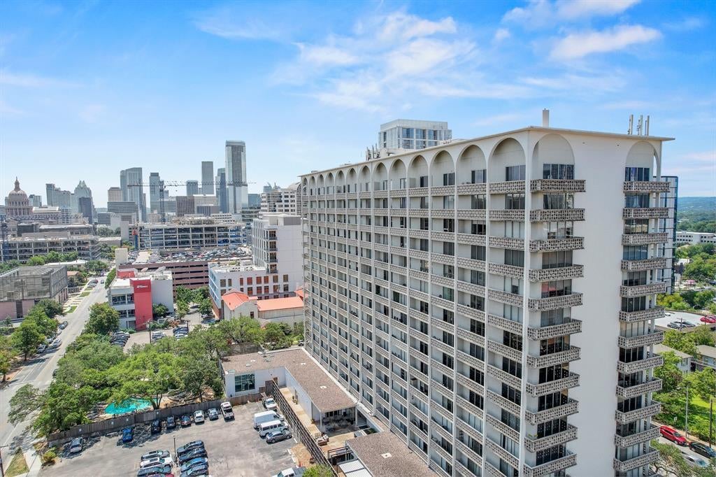 Welcome to Unit 5F at Cambridge Tower, Austin’s first landmark luxury high-rise condominium, proudly listed on the National Register of Historic Places. Built in 1964, Cambridge Tower blends timeless mid-century design with modern convenience, all in a prime location near Downtown, the University of Texas, Dell Medical School, and the Texas State Capitol. This spacious 2-bedroom, 2-bath residence offers 1,294 sq. ft. of thoughtfully designed living space. The open-concept floor plan is filled with natural light from floor-to-ceiling windows, while the renovated kitchen has been opened to create seamless flow for entertaining. A full-length balcony offers city views. The primary suite easily accommodates a king-sized bed and seating area. It features an ensuite bath with dual vanities and a walk-in, cedar-lined closet. The secondary bedroom and bath offer flexibility for guests, a home office, or creative space. Residents enjoy all-inclusive HOA benefits, covering electricity, water, internet, TV/basic cable, and trash. The amenities include: 24-hour concierge, sparkling pool & spa, gazebo, rooftop deck with sweeping city views, fitness center, conference & business center, BBQ area and an inviting lobby. A reserved parking space with storage in the secured underground garage completes this exceptional offering.