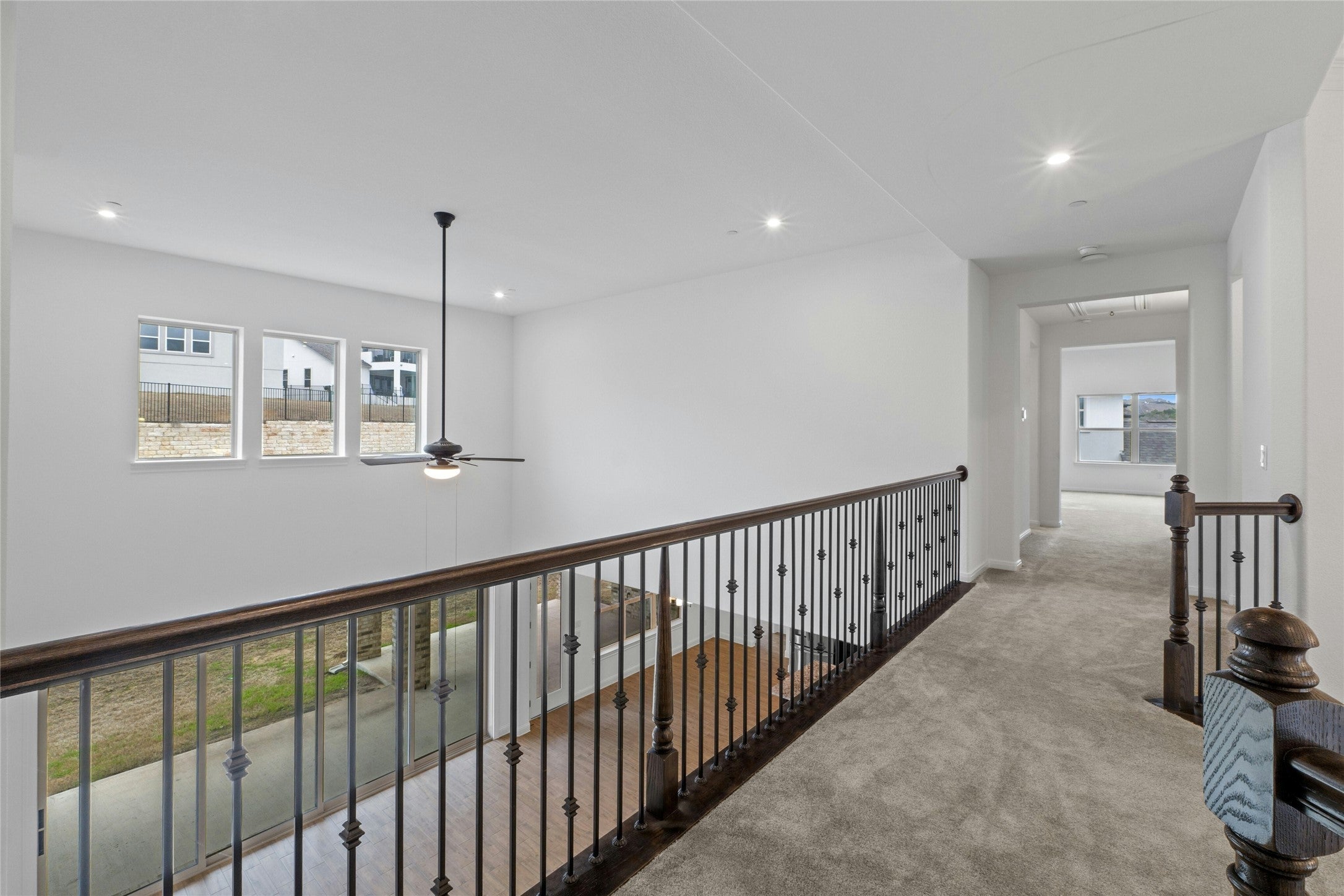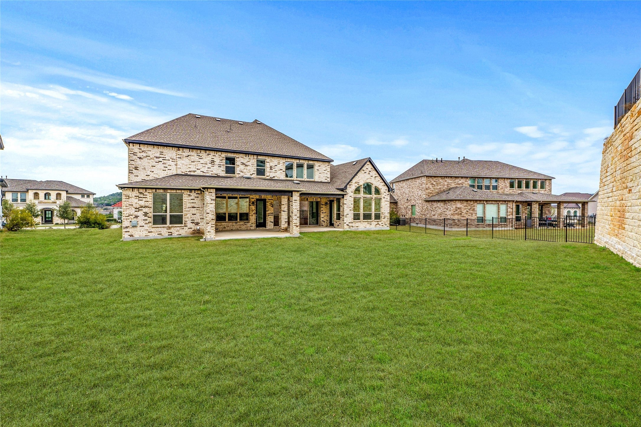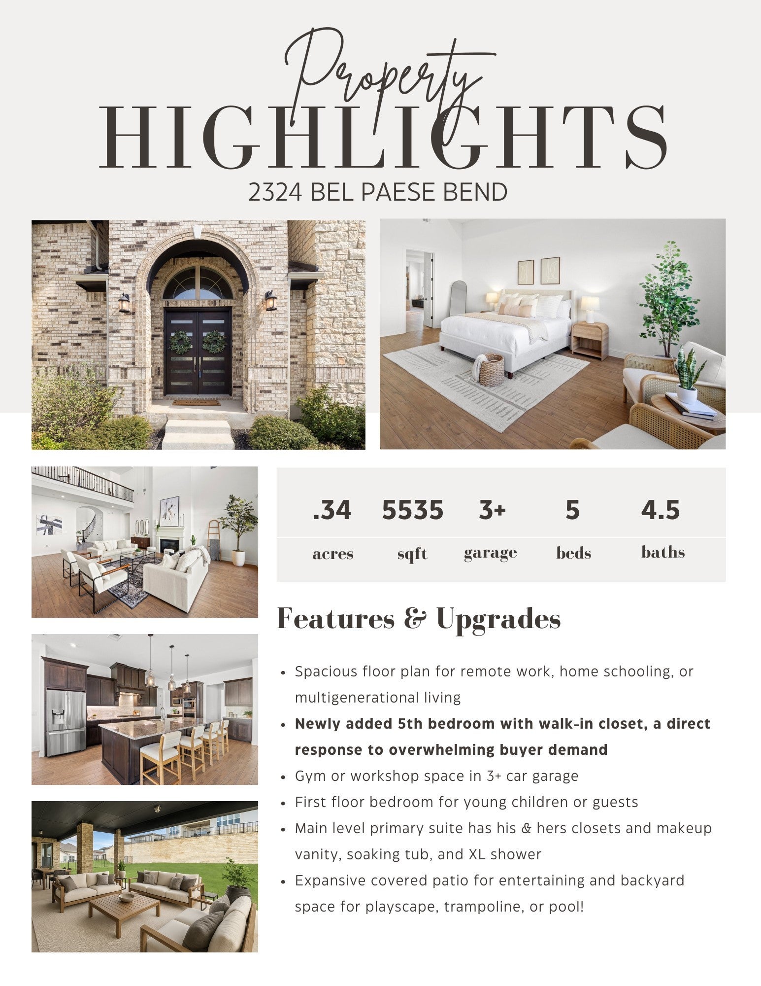 Light-filled, 5,500+ sq ft Toll Brothers home on a rare .34-acre lot, tucked away on a quiet street in Travisso and still feeling nearly new—now featuring a newly added 5th bedroom with walk-in closet, a direct response to overwhelming buyer demand. The Sandhaven plan with Berkshire stone exterior pairs Italian-inspired architecture with Texas Hill Country ease. A grand double stairwell foyer opens to a sunlit office, open-concept living with soaring ceilings and gas fireplace, and a gourmet kitchen with walk-in pantry, butler's pantry, and island seating made for gathering. The primary suite is a true retreat with 2 oversized walk-in closets and a stunning spa-style bathroom featuring a large soaking tub and dual walk-in shower. A lower-level suite with full bath provides private guest quarters. Upstairs brings three bedrooms, two full baths, a second living area, and a fully prewired media room. An oversized, multipane sliding door opens from the living room to a large covered patio and expansive yard with in-ground sprinklers—all secured by a limestone retaining wall with plenty of room to add a pool, trampoline, or playscape. Unique 3+ car garage offers additional space for workshop or home gym space. Travisso amenities include the Palazzo Clubhouse, pool, tennis and pickleball courts, trails, and easy access to top-rated Cedar Park High School. A spacious, well-appointed home built for the way you actually live.