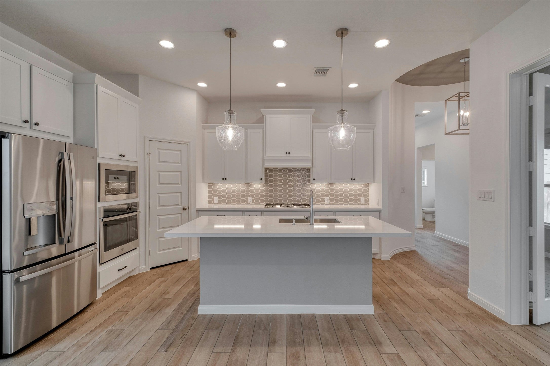 This previous model home is a show stopper and full of upgrades! The grand front entry leads past the utility room and mudroom into the open concept floor plan. On the left will be the home office with a French door entry that flows into the large family room and dining area. Kitchen hosts a corner walk-in pantry complete with refrigerator, gas stove, wall mounted oven, quartz counters and plenty of cabinet space. At the rear of the home is the secluded primary suite which includes oversized windows, en-suite bath with dual vanities, a walk-in closet, linen closet, and a large glass enclosed shower with stunning tile. Secondary bedrooms come with walk-in closets and towering ceilings. Complete with a covered backyard patio, tasteful landscaping for comfort for elevating living, and full irrigation systems included. Don't miss out on the opportunity to call this masterpiece your home!