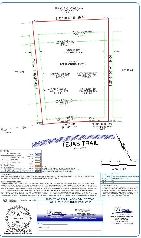Don't miss this exceptional opportunity to own two adjacent lots in the heart of Lago Vista (20802 and 20804 Tejas Trl), offered at $18,500 and $19k each. Whether you're looking to build now or invest for the future, these lots offer incredible flexibility. Purchase individually or combine both for an expansive homesite with added privacy, space, and design potential. Nestled among the scenic Hill Country landscape, these lots provide plenty of buildable area and potential for wooded views and peaceful surroundings, just minutes from Lake Travis. With lot ownership, you'll enjoy unmatched access to Lago Vista POA’s lakeside lifestyle and amenities, including Lake Travis waterfront parks, private boat ramps, community pools, fishing areas, playgrounds, tennis courts, golf courses, three marinas, & Lago Vista private airport. Outdoor enthusiasts will love the proximity to nearby hiking/biking trails at Balcones Canyonlands and Jonestown’s Canyonlands Trail Park. Close proximity to restaurants and shopping including The Lucky Rabbit, Baker’s Brisket Co., Bella Vista, Copperhead Grill, and Lago Vista Brewing, Brookshire Brothers, Lowe’s Market. Just 15 minutes from Cedar Park, and a straight route to Northwest Austin and major commuting corridors. This is a rare chance to build your dream home, invest in appreciating land, or create a custom retreat in one of Lake Travis' most sought-after lakeside communities. Survey available. Buyer to verify utilities, building requirements, and availability with the City of Lago Vista.