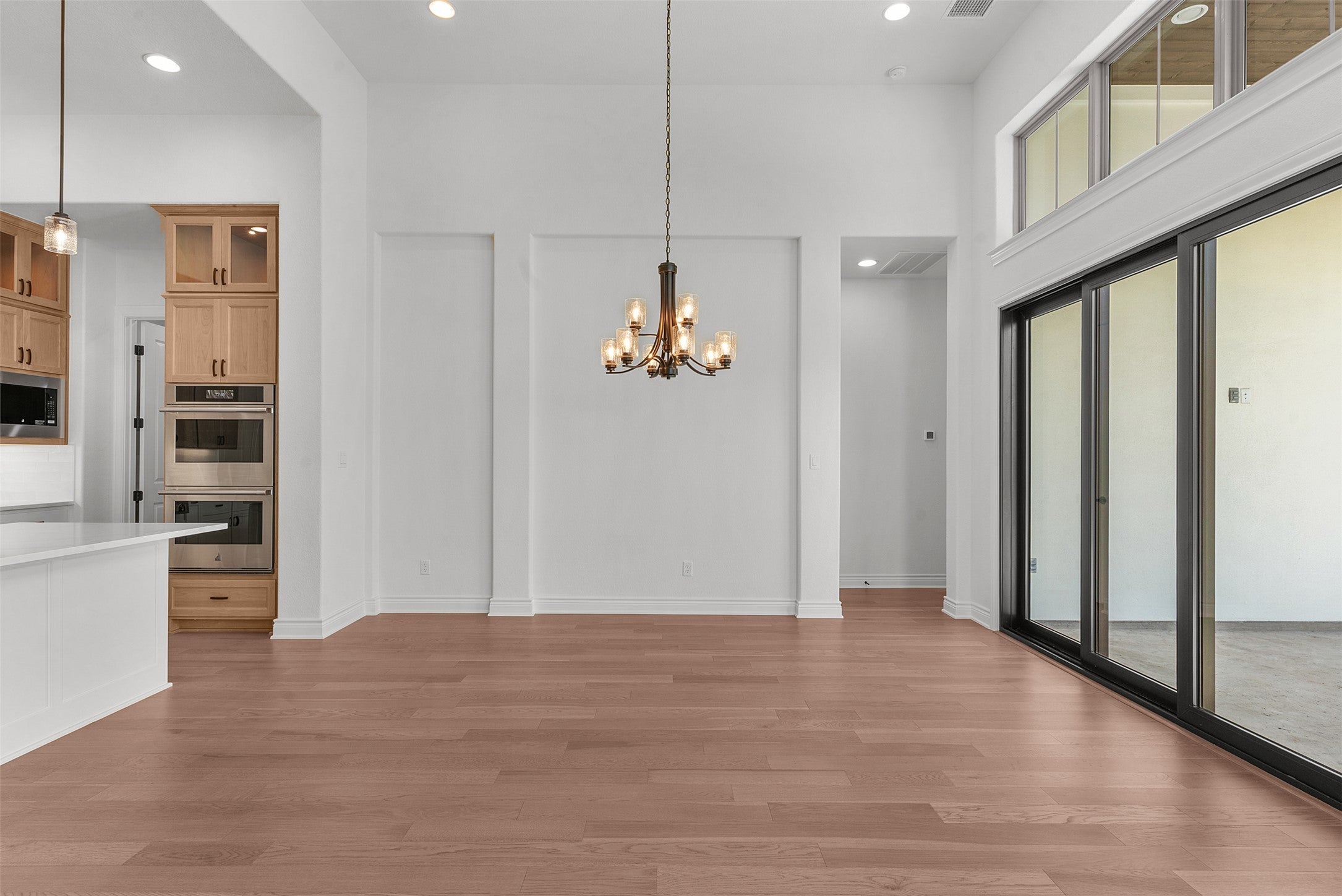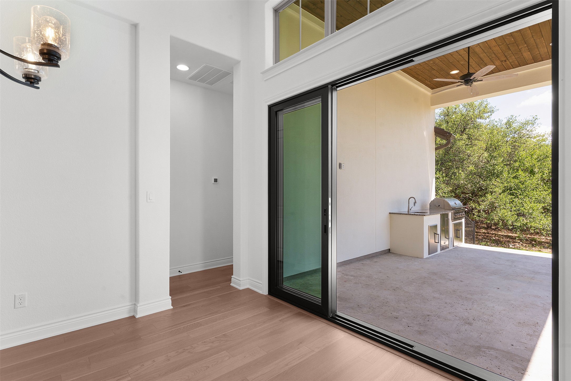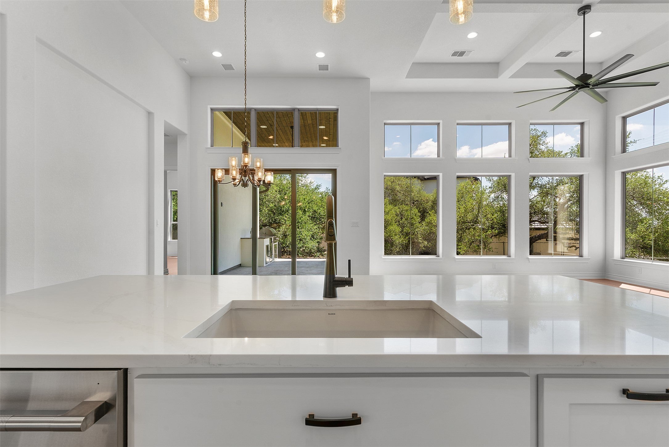 Introducing the final opportunity to own a new Sitterle Home in the prestigious Cimarron Hills Country Club—an extraordinary residence on a coveted corner lot with sweeping Hill Country views and space for a future pool. Designed with distinction and artistic vision, this one-of-a-kind floor plan impresses from the moment you step inside. A stunning 14' groin vault foyer ceiling transitions seamlessly into a 12' gallery hallway, culminating in a show-stopping 14'–15' coffered ceiling in the great room. Perfect for entertaining, the great room features an elegant full cocktail and wine bar—bringing a touch of glamour and fun to every gathering. The adjacent dining room opens to a covered outdoor living space complete with a second outdoor kitchen, ideal for Hill Country evenings. The gourmet interior kitchen is a chef’s dream with JennAir appliances, built-in fridge and freezer, ceiling-height cabinetry with glass accents, interior lighting, and a pot filler for added luxury. The layout is as functional as it is beautiful—an oversized utility room connects directly to both the kitchen and the primary suite’s bath for maximum convenience. Vaulted ceilings grace the primary bedroom and bathroom, where a freestanding soaking tub sits beneath a dazzling chandelier. Two spacious walk-in closets—one with a pocket door to the laundry room—enhance everyday living. The en suite guest room offers the best sunset views in the home, capturing the magic of the Hill Country. Every inch of this home has been thoughtfully curated, from the oversized mud-set shower with frameless glass to the interior palette—a breezy blend of cool creams and warm tones, evoking a refined Palm Springs vibe. Complete with a dedicated golf cart garage, this home is both luxurious and lifestyle-ready. Don’t miss your chance to own this final masterpiece in Cimarron Hills.