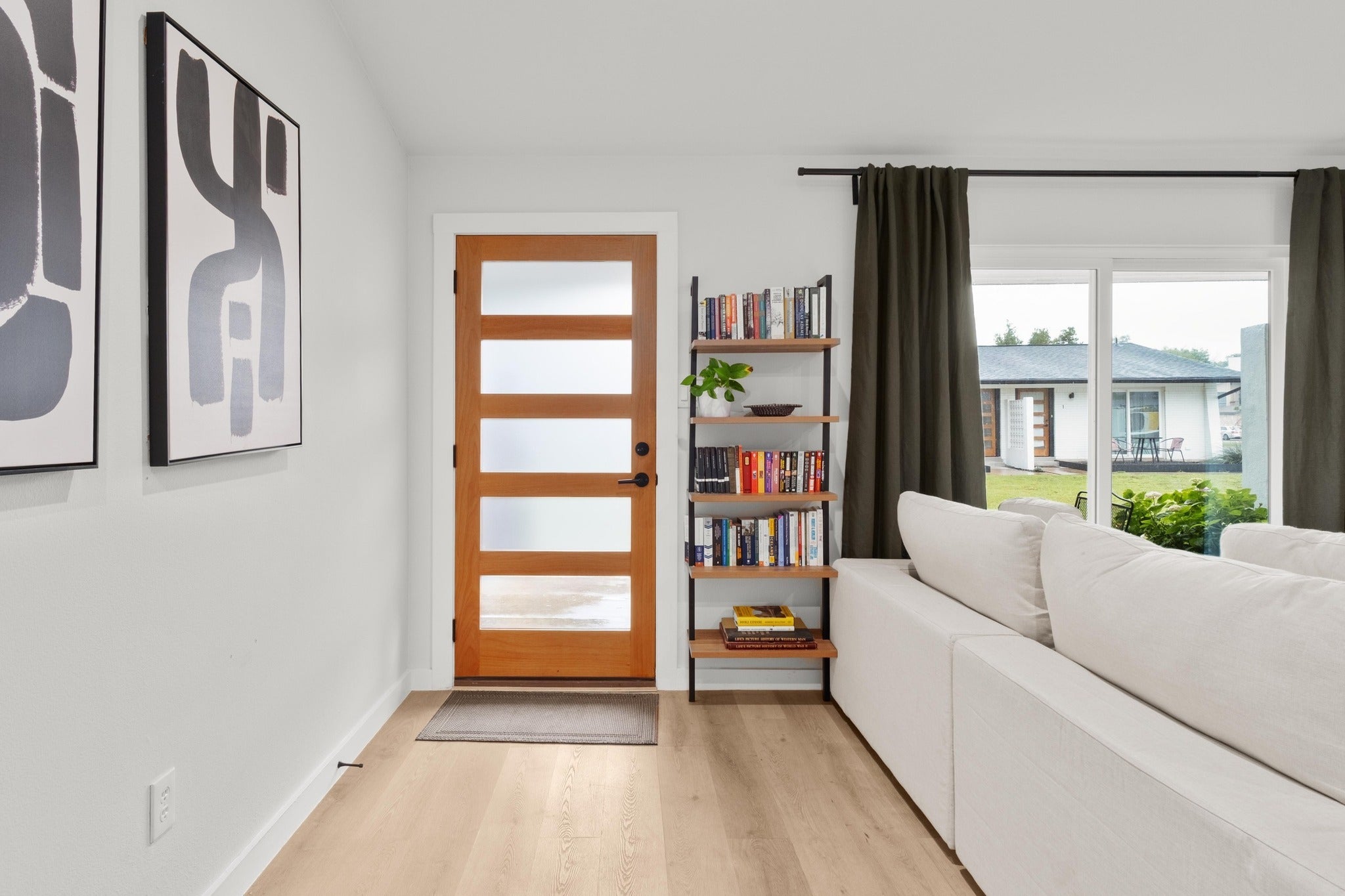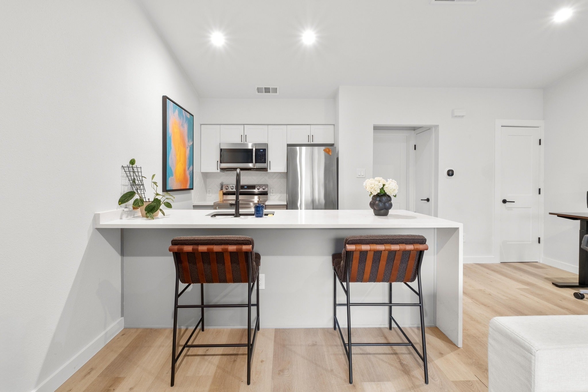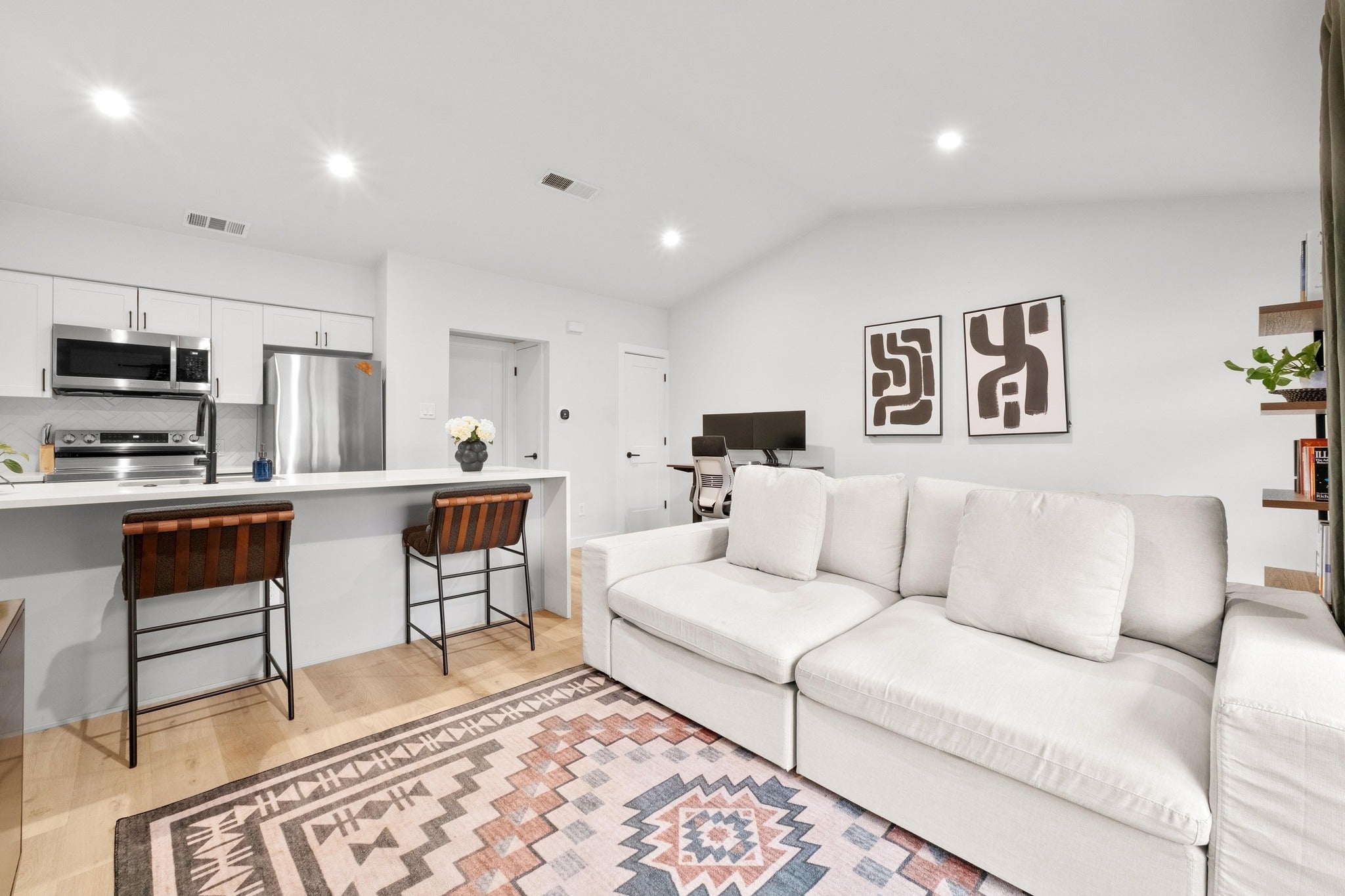 This fully renovated 1BD/1BA condo offers a stylish, low-maintenance lifestyle in the heart of Zilker, just blocks from Barton Springs, Lady Bird Lake, and some of Austin’s best dining and green spaces. Inside, vaulted ceilings and clean white walls create an airy backdrop for natural light to pour in through large sliding glass doors. The open-concept living area includes a modern kitchen with quartz countertops, custom cabinetry, herringbone backsplash, and stainless steel appliances—all opening to a flexible living + work space. The spacious bedroom features a walk-in closet, an ensuite bath with striking patterned tile, and with new french doors offering direct access to your own private fenced backyard with turf. Highlights include: Private front porch with midcentury block wall + garden beds Open-concept living with vaulted ceilings and natural light Fully updated kitchen with quartz counters + Samsung appliances Dedicated office nook for remote work Spacious walk-in closet Private fenced backyard with low-maintenance turf and string lights Full-size washer/dryer included Reserved parking Incredible walkability to Zilker Park, Barton Springs, and South Lamar