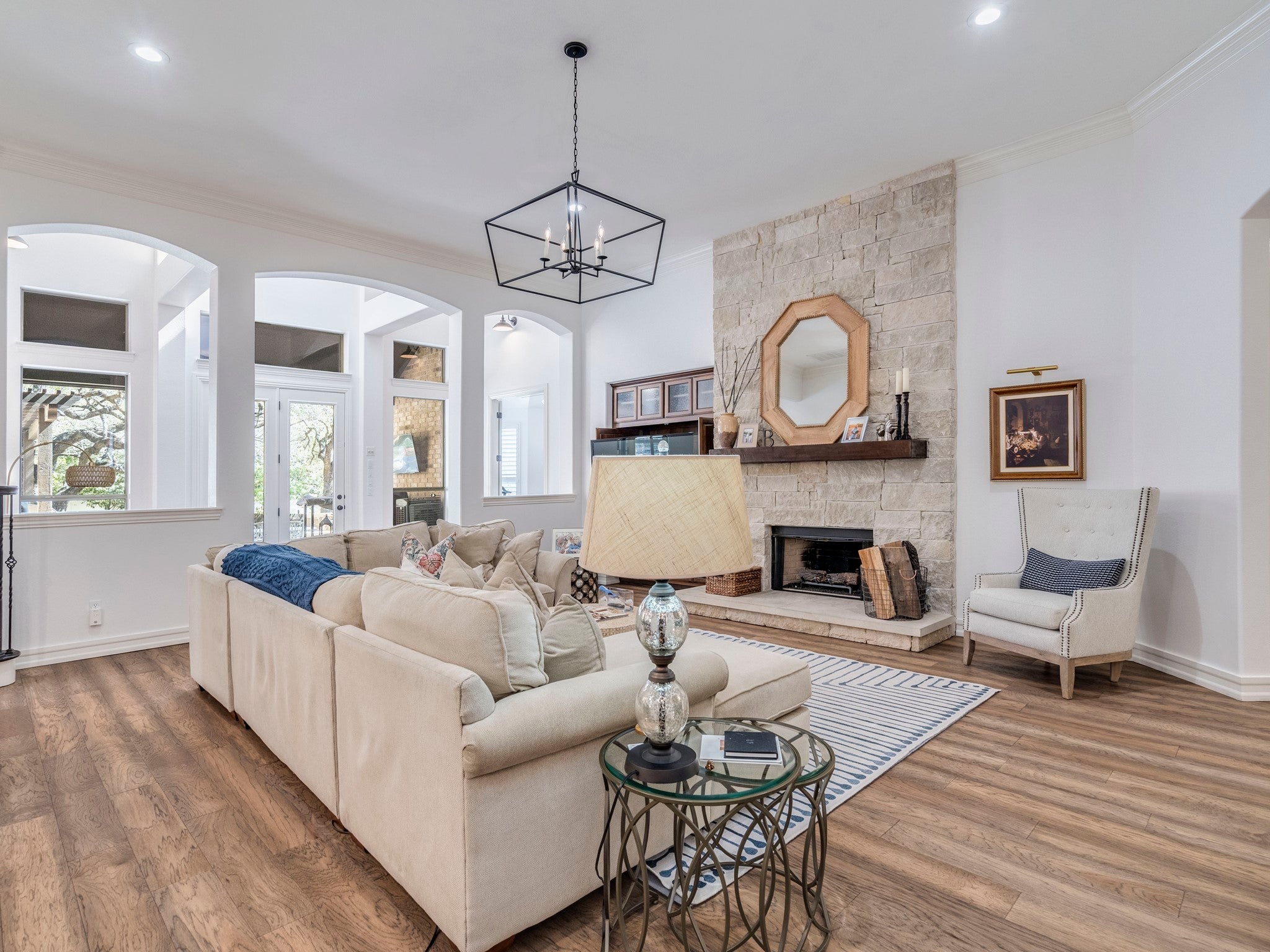 Welcome to this stunning home in Emerald Ridge,Steiner Ranch,on a private corner lot with extensive landscaping.This former model with side-entry garage offers a rare,mostly single-story floor plan.The main level features four beds,four baths plus a dedicated home office,while the upper level includes a fifth bedroom and bath,media room,and game room,with wet bar,perfect for entertaining or hosting guests.A spacious dining room and bright private office greet you upon entry.The home then opens into the inviting family room,highlighted by a floor-to-ceiling stone gas fireplace with custom mantle.At the heart of the home is the beautifully elevated chef’s kitchen,featuring an expansive center island with quartz countertops, built-in refrigerator,8-burner gas cooktop,three ovens plus a warming drawer,and generous eat-in bar seating.Adjacent to the kitchen is a spacious breakfast area,often referred to as a “keeping room,” designed as a comfortable space where family and friends naturally gather.The primary suite offers a peaceful retreat with French doors overlooking the outdoor living area and pool.The spa-like primary bath features wood tile flooring,updated fixtures and mirrors,granite countertops,soaking tub,and a separate shower with dramatic verticle tile surround and mosaic flooring. Custom walk-in closet system provides exceptional organization and storage.Each additional bedroom on the main level has its own bath,including two en-suite and one with an adjacent hall bath.Upstairs,the game room with wet bar serves as a versatile flex space for billiards,workouts,or play,while the media room provides a dark,immersive movie experience.A private fifth bedroom and bath create an ideal guest retreat.The backyard offers a covered stone patio,outdoor kitchen with rebuilt gas grill and Green Egg,and a fully automated pool and spa with waterfall.Additional features include Sonos speakers,full landscape lighting,and a three-car side-entry garage with elevated storage.