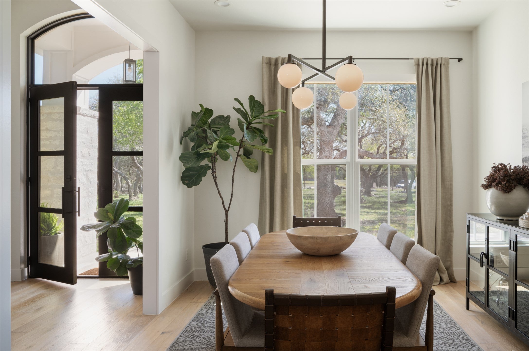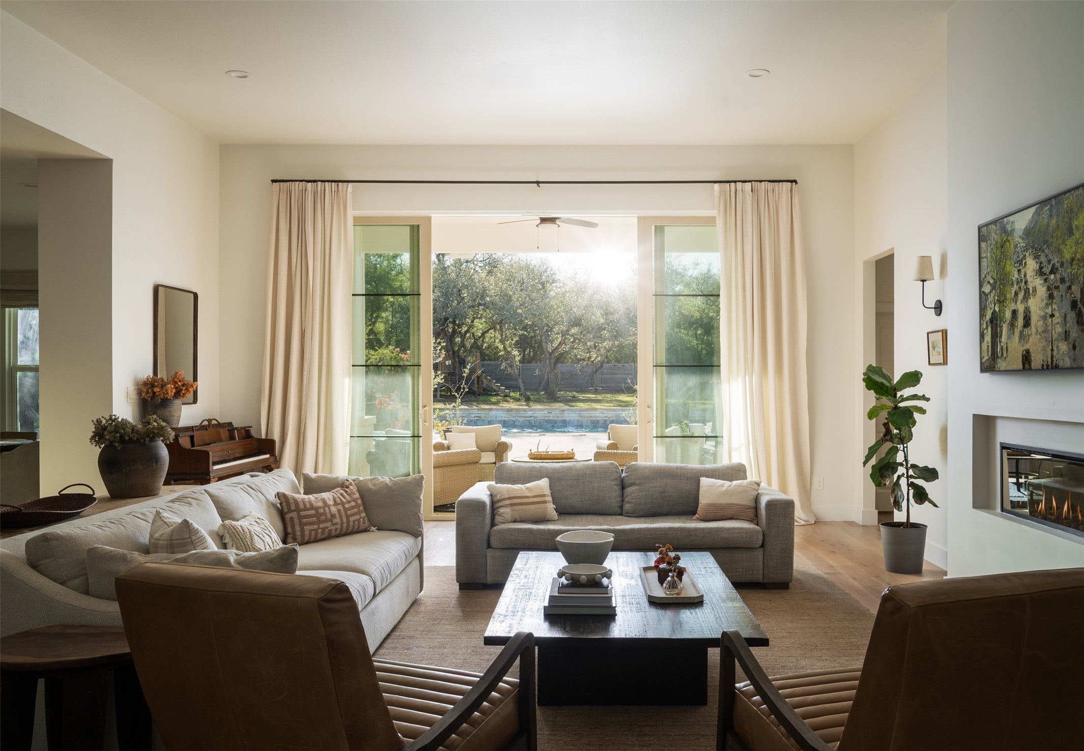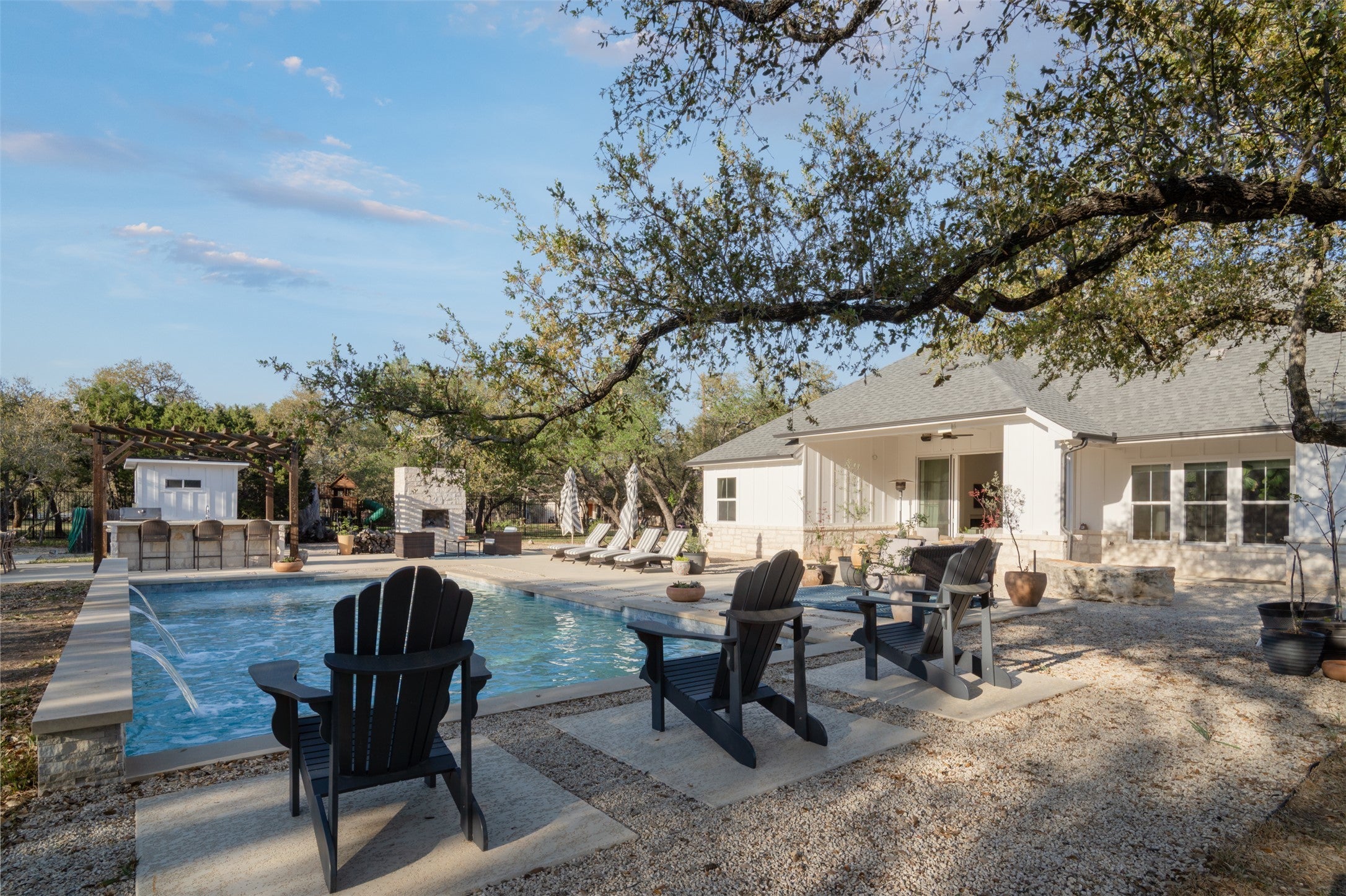 Experience the essence of sophisticated living at 120 Mourning Dove Lane, where Hill Country Minimalism meets modern luxury. Custom-built in 2021 and curated by a professional interior designer, this 3,544 sq ft masterpiece is functional design at its best. Situated on two sprawling acres under a canopy of mature oaks, the residence offers rare seclusion just five minutes from Austin city limits. You are perfectly positioned near the legendary Salt Lick, renowned wineries, golf courses, and upscale dining—offering country quiet with every city convenience at your fingertips. The interior features effortless hosting circulation and an open floor plan that feels both grand and intimate. Engineered white oak floors flow throughout the entire home, with no carpet in sight, leading to a gourmet kitchen designed for the culinary enthusiast. This heart of the home boasts a 48-inch propane range, an expansive social island, and a light-filled breakfast room, complemented by a formal dining space for celebrated gatherings. The layout includes 4 spacious bedrooms and 4 full bathrooms, headlined by a serene primary ensuite. Guest rooms are positioned for privacy, including one with direct bath access and two joined by a smart Jack-and-Jill setup. For the modern professional, a dedicated office with custom built-ins provides a serene workspace, while the oversized upstairs flex loft with a full bath offers endless possibilities as a media room or private retreat. The transition to the outdoor paradise is where this property truly shines. Designed for entertaining, the backyard features a sparkling pool, a dedicated outdoor half-bath, and a refreshing outdoor shower. Enjoy morning coffee on the expansive covered patio and evenings stargazing by the massive stone fireplace. This residence is further enhanced by an RV pad with full hookups. Located just 26 minutes from the Austin airport, your gateway to the rest of the country, or the world, is always within effortless reach.