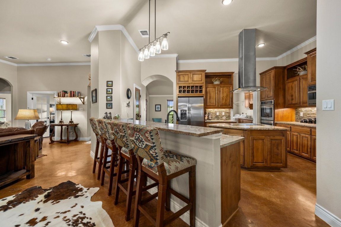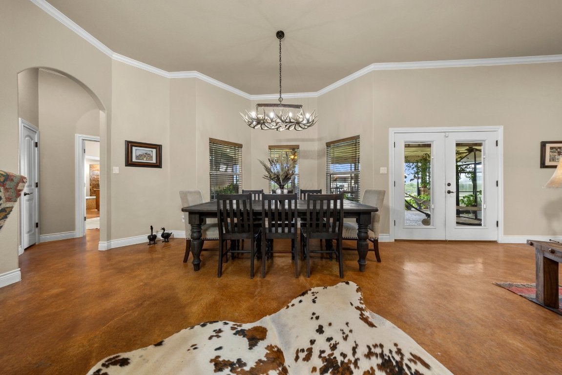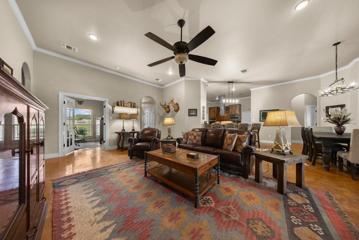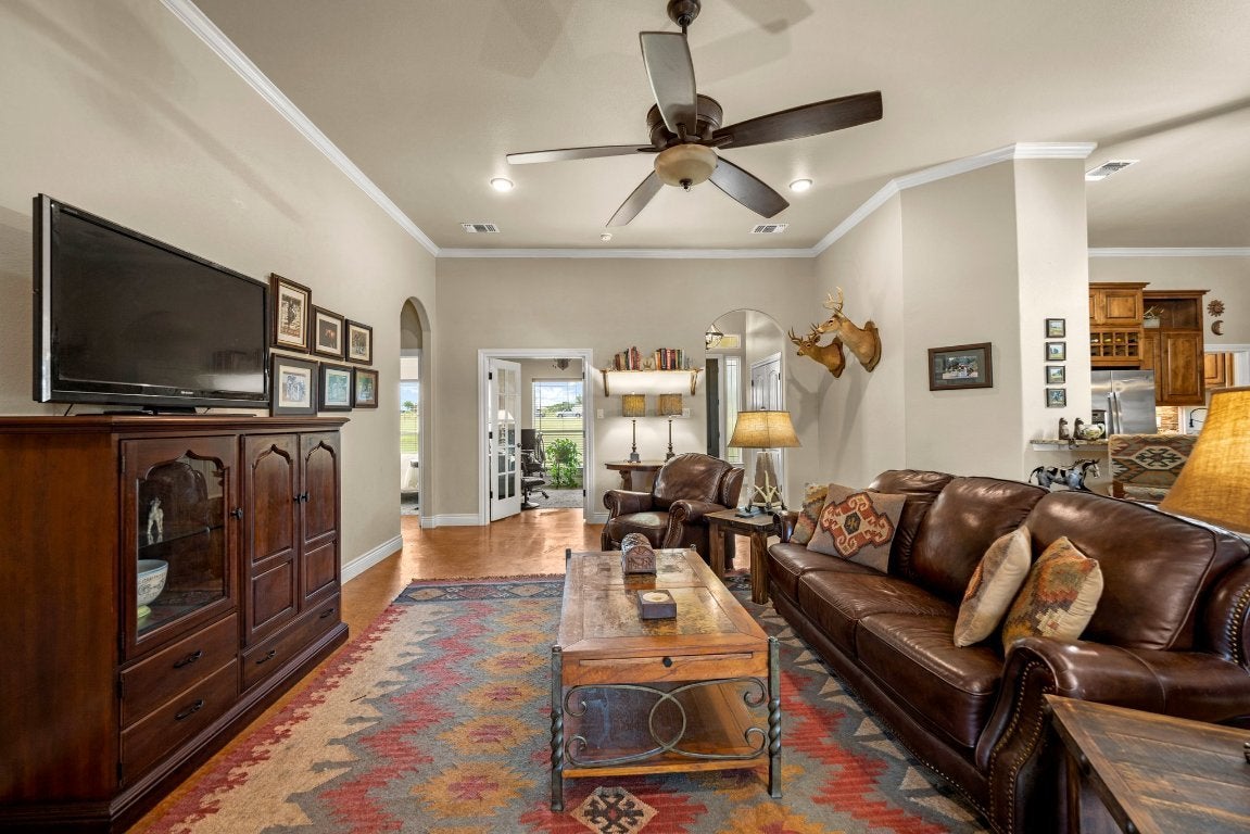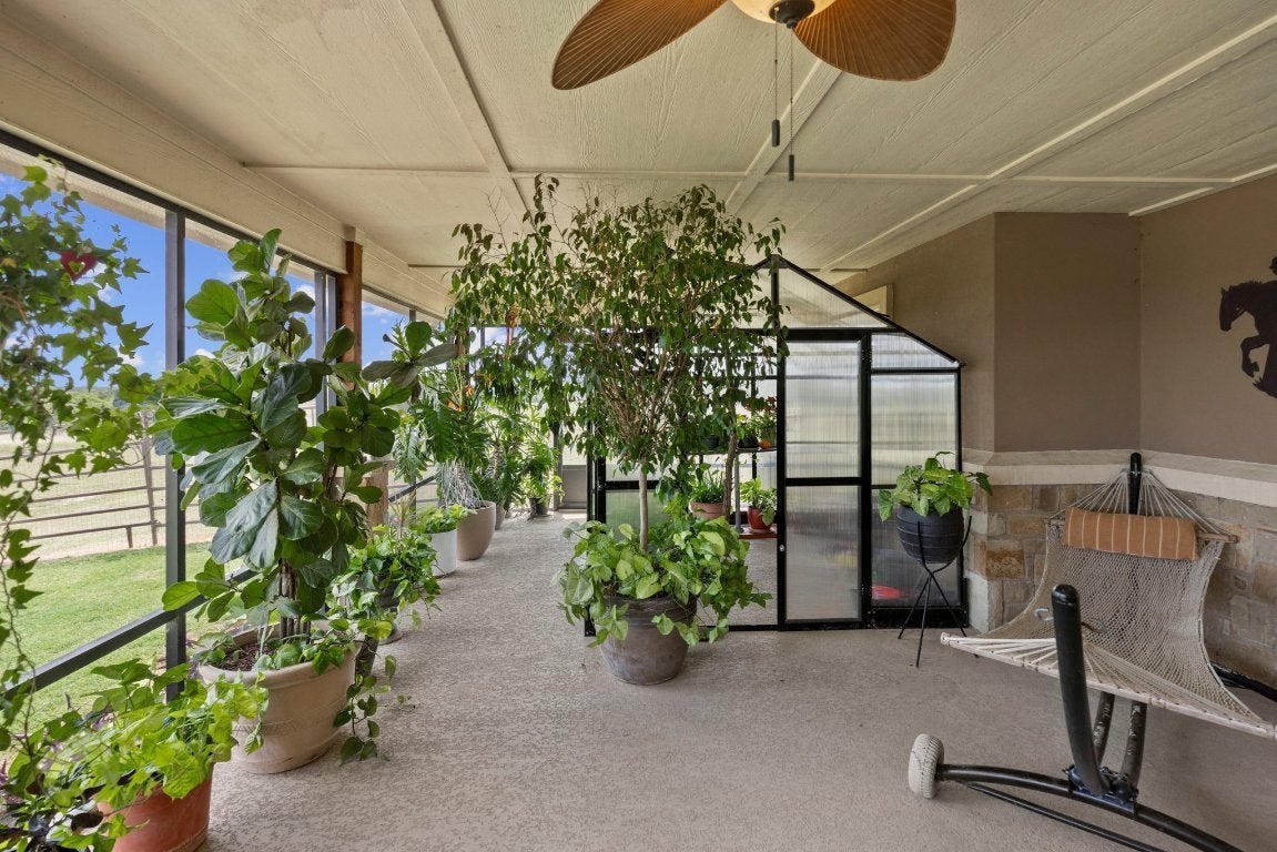 Truly a one of a kind property! Turnkey horse property. This one is fully fenced and comes equipped with a 3 stall horse barn, hay barn, run in barn, RV storage and pond. The 2,550 square foot home was built in 2018 and has 3 bedrooms, 2.5 bathrooms, a separate office, and a flex room that could be used as a dining room or formal living. Stained concrete floors run throughout the home, perfect for country living. A neutral color palette, chiseled edge granite countertops, copper farmhouse sink, and upgraded fixtures add to the charm and rustic elegance of this home. Relax on the screened-in back porch as you take in the view of the pond. This property is already set up for animals with perimeter and cross fencing, along with a brand new fenced in yard for small animals. Along with the three stalls, the horse barn has a tack room and a wash room, hot and cold water, timed lights and a guard light. RV storage area off the barn is 42'x20' and horse trailer storage area is 36'x12'. The run in barn is 12'x24'. The hay barn is on a concrete slab and also has space for additional storage. There are 2 RV hook-ups on the property, one on the right side of the home and one in the RV storage area. Country living close to town. Minimal restrictions make this property even more desirable. Schedule a showing today!