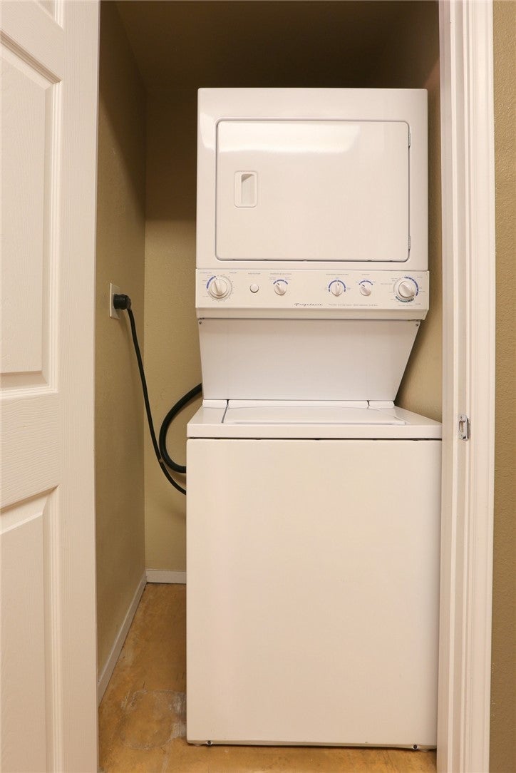 - Washer/Dryer Stacked, Dishwasher, Electric Range, Free-Standing Range, Disposal, Refrigerator