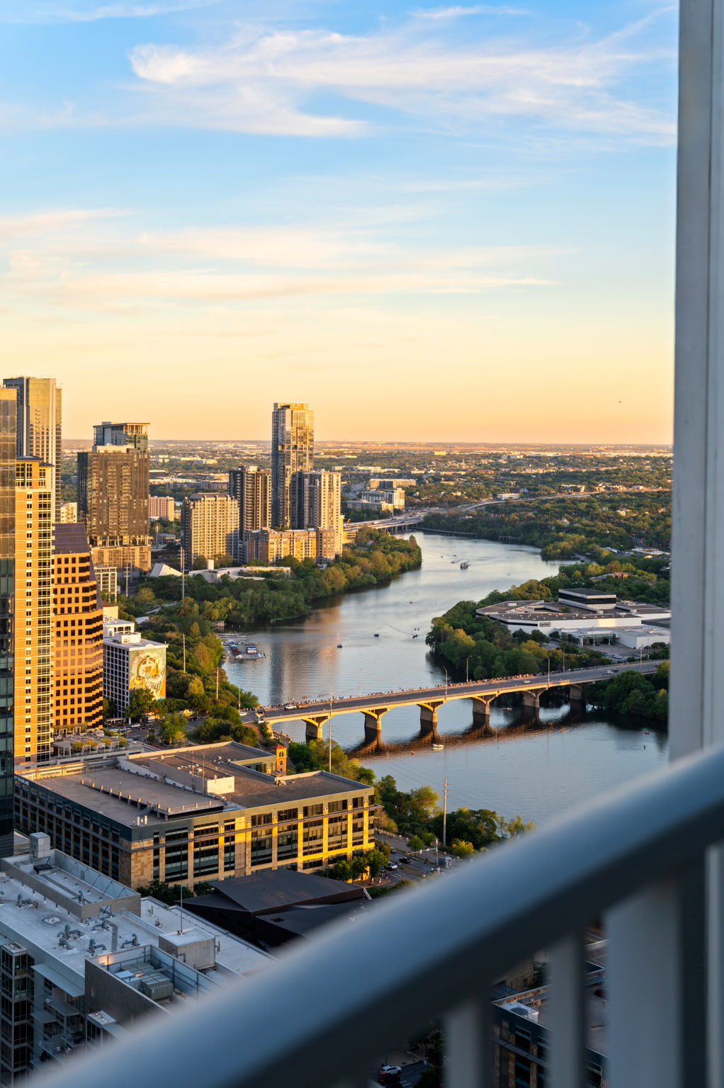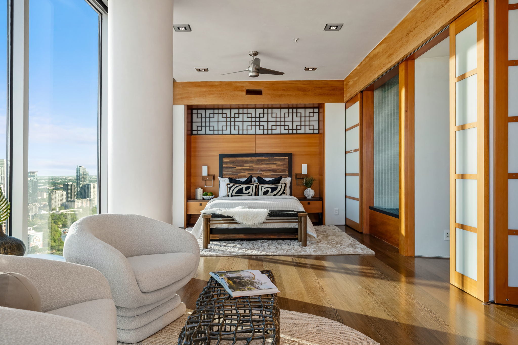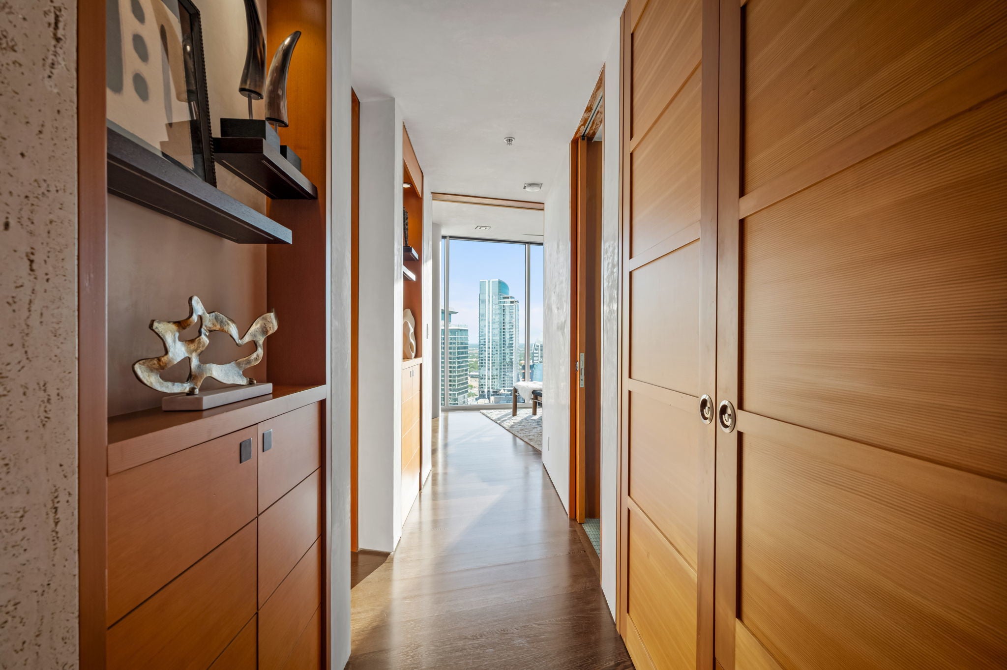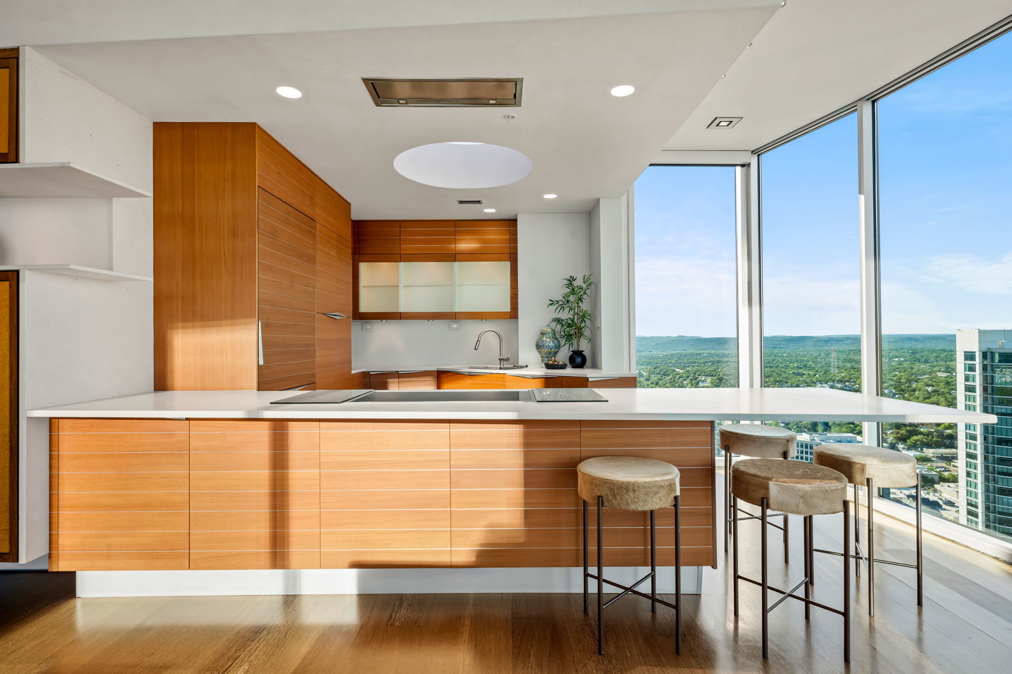 Just one floor below Penthouse level, epic views, and a luxury renovation of the highest measure and you have a downtown condo that is simply unmatched. The spectacular 300 degree panoramic vista showcases Ladybird Lake, the Frost Tower, the Capital, the UT Tower, and the surrounding hills of Austin. The current owners created a highly designed, bespoke residence that is both original and incomparable. Lavish finishes comprise of Venetian plaster, Wenge hardwoods, Lacewood cabinetry, Italian Snaidero custom kitchen cabinetry, soapstone countertops, and translucent Japanese inspired pocket doors & sliders. Luxury continues with Gaggenau appliances and two SubZero wine coolers tucked in a hidden door. Elevated details in the bathrooms include a Japanese soaking tub and a raised shower to capitalize on the views. From first arrival, you are captivated with the feel and the breathtaking views. The residence is awash with natural light thanks to the floor to ceiling glass walls throughout. In the primary, an expansive sitting area has a dual role – it can be split with clever sliding wall panels that allows the space to be divided into two private suites each with entrances, separate full baths and individual closets. The murphy bed is both genius and practical. The versatility of the space allows for an expansive primary suite and a space for guests. In one of the most walkable parts of downtown, enjoy award-winning restaurants, buzzy coffee shops and bars, Republic Square Park w/ weekend farmers markets, and Austin’s beloved Hike and Bike Trail all just steps away. “The 360” as locals call it, provides its residents with 24-hour concierge, a stunning rooftop pool and cabanas, a clubroom & meetings spaces, a fitness center and pet park. Behind the gated entry, come two dedicated parking spots, located right next to the elevators, offering convenience and security. This is the pinnacle of downtown luxury living and the ultimate Austin lifestyle.