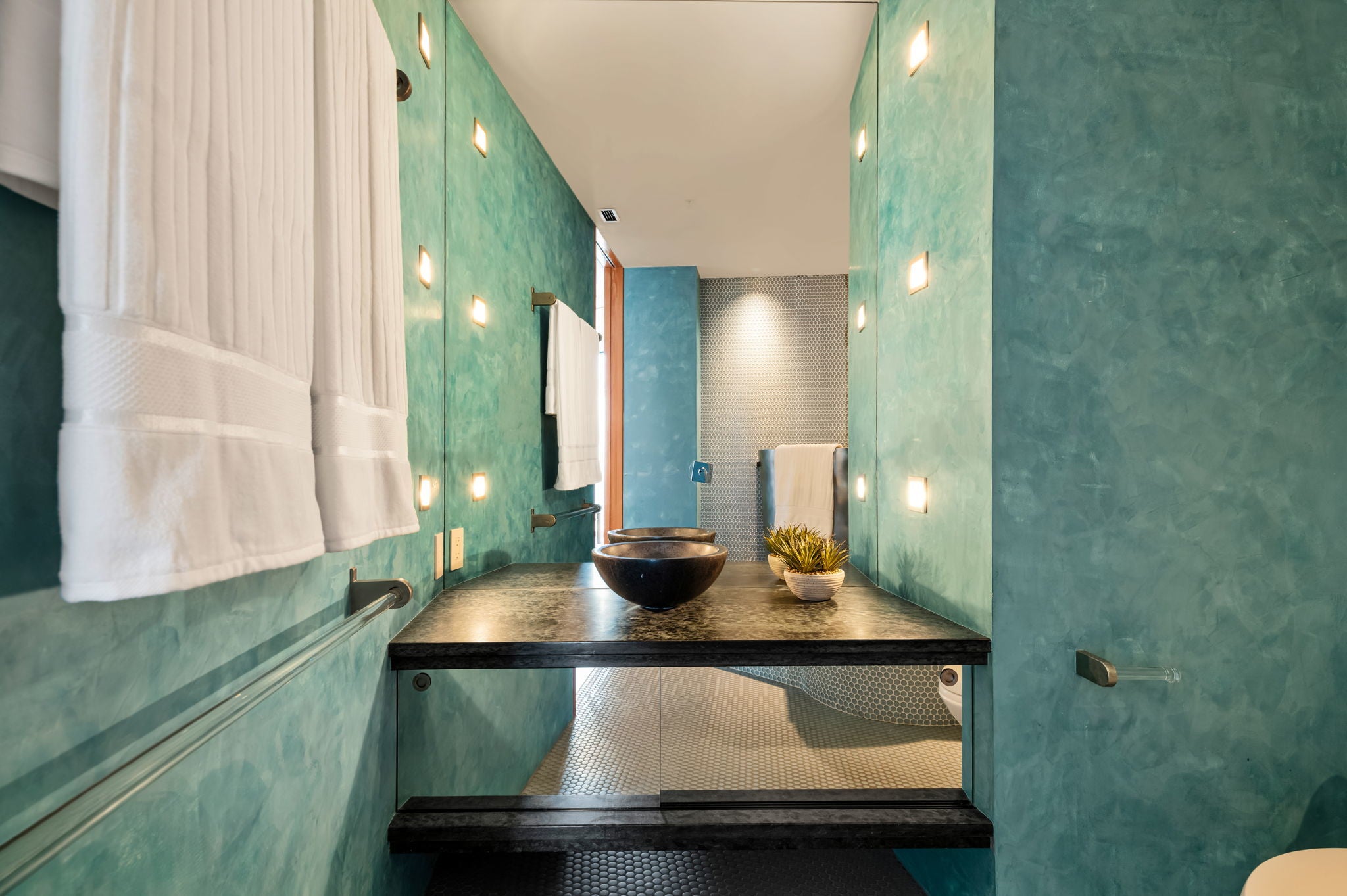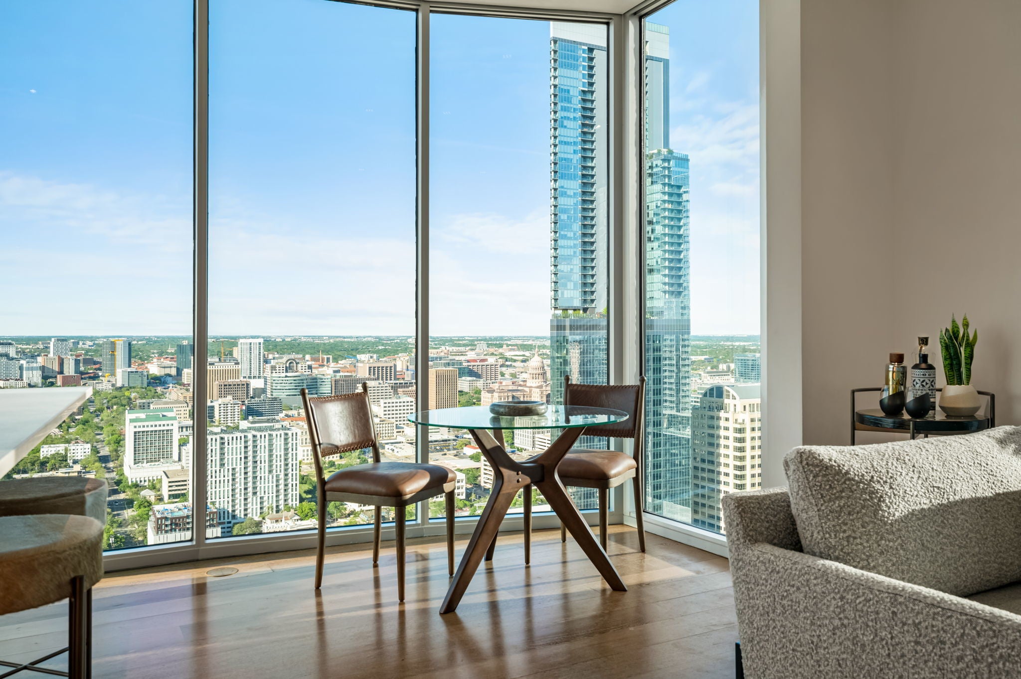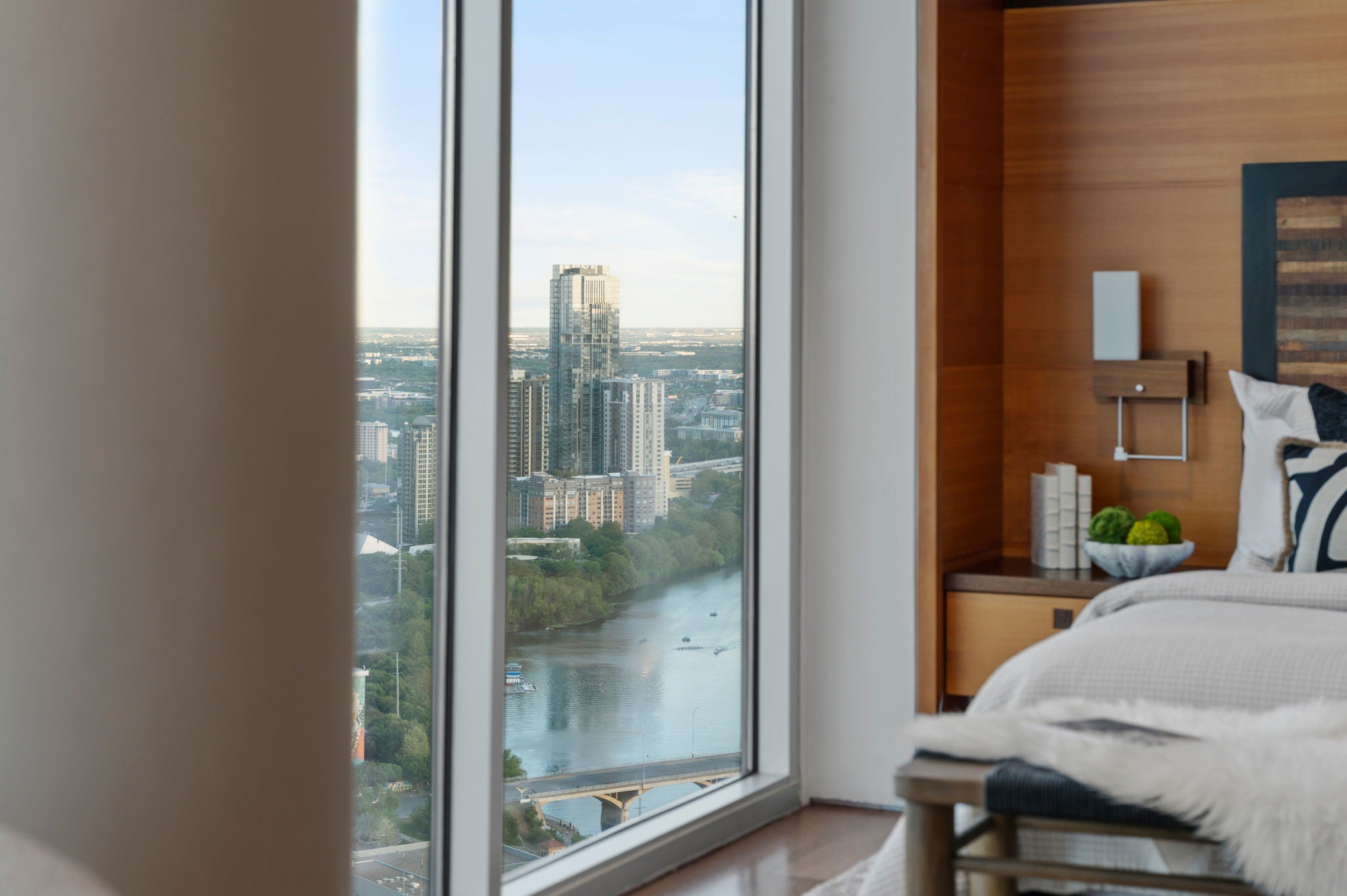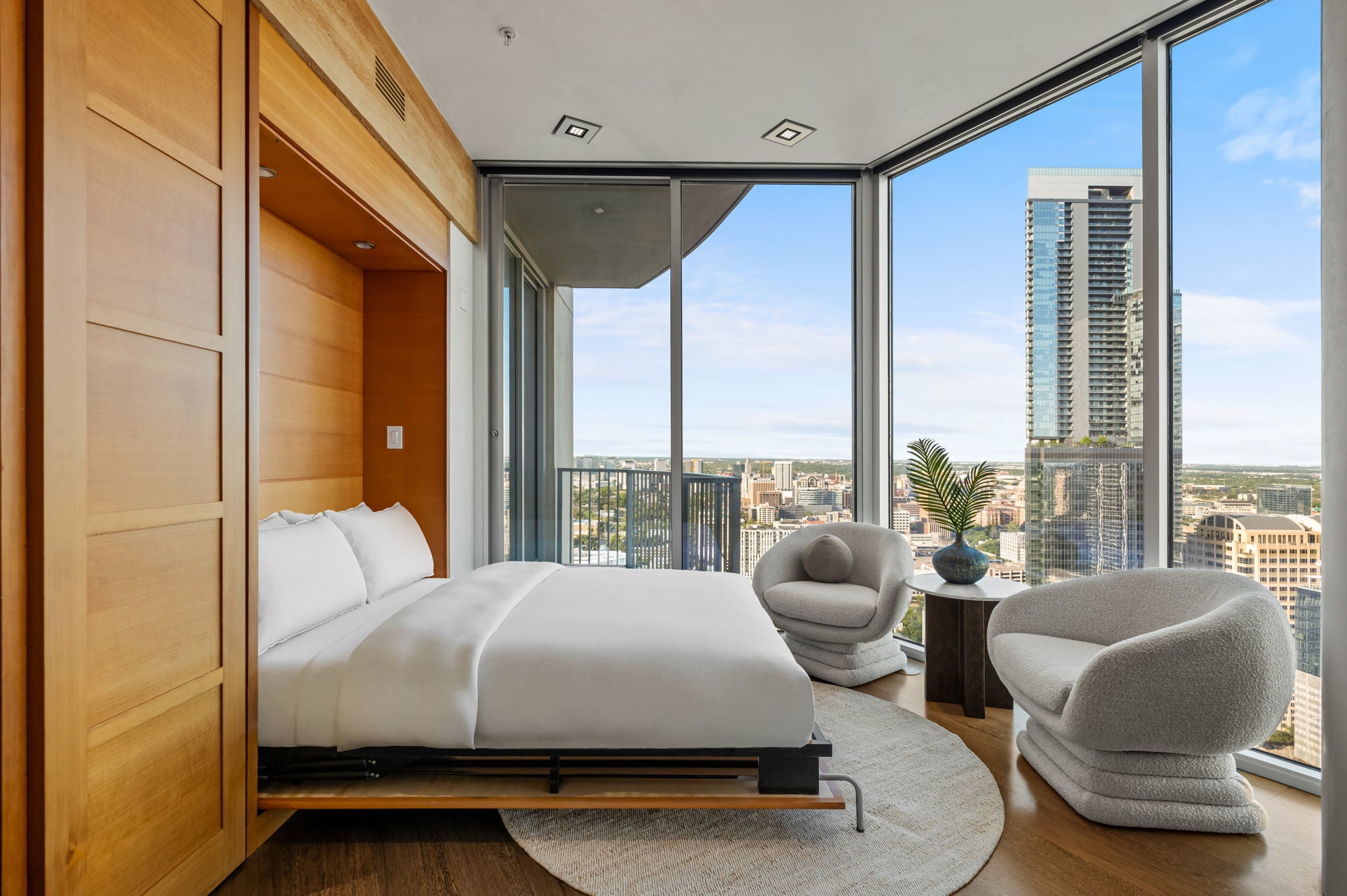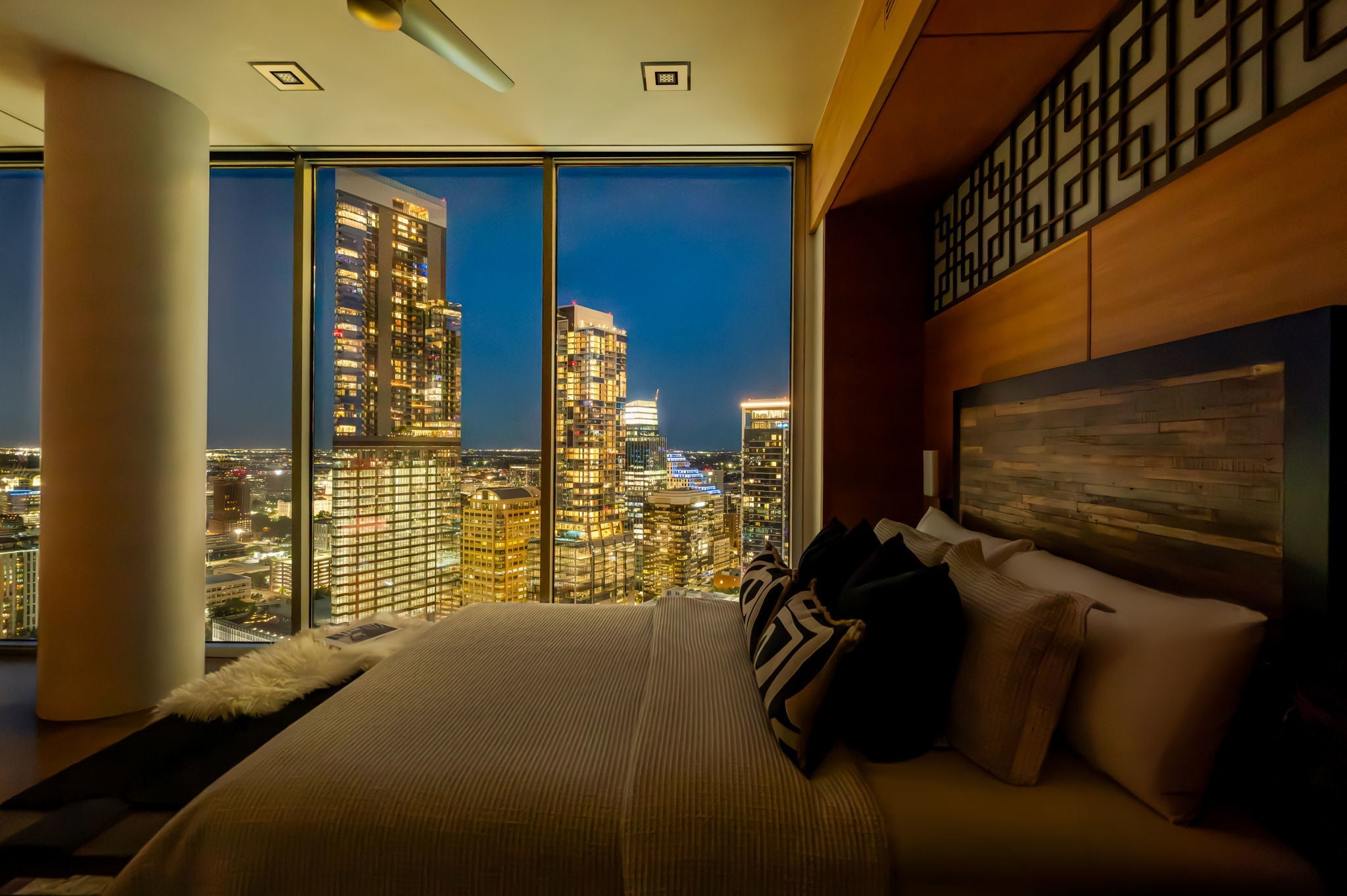 Just one floor below Penthouse level, epic views, and a luxury renovation of the highest measure and you have a downtown condo that is simply unmatched. The spectacular 300 degree panoramic vista showcases Ladybird Lake, the Frost Tower, the Capital, the UT Tower, and the surrounding hills of Austin. The current owners created a highly designed, bespoke residence that is both original and incomparable. Lavish finishes comprise of Venetian plaster, Wenge hardwoods, Lacewood cabinetry, Italian Snaidero custom kitchen cabinetry, soapstone countertops, and translucent Japanese inspired pocket doors & sliders. Luxury continues with Gaggenau appliances and two SubZero wine coolers tucked in a hidden door. Elevated details in the bathrooms include a Japanese soaking tub and a raised shower to capitalize on the views. From first arrival, you are captivated with the feel and the breathtaking views. The residence is awash with natural light thanks to the floor to ceiling glass walls throughout. In the primary, an expansive sitting area has a dual role – it can be split with clever sliding wall panels that allows the space to be divided into two private suites each with entrances, separate full baths and individual closets. The murphy bed is both genius and practical. The versatility of the space allows for an expansive primary suite and a space for guests. In one of the most walkable parts of downtown, enjoy award-winning restaurants, buzzy coffee shops and bars, Republic Square Park w/ weekend farmers markets, and Austin’s beloved Hike and Bike Trail all just steps away. “The 360” as locals call it, provides its residents with 24-hour concierge, a stunning rooftop pool and cabanas, a clubroom & meetings spaces, a fitness center and pet park. Behind the gated entry, come two dedicated parking spots, located right next to the elevators, offering convenience and security. This is the pinnacle of downtown luxury living and the ultimate Austin lifestyle.