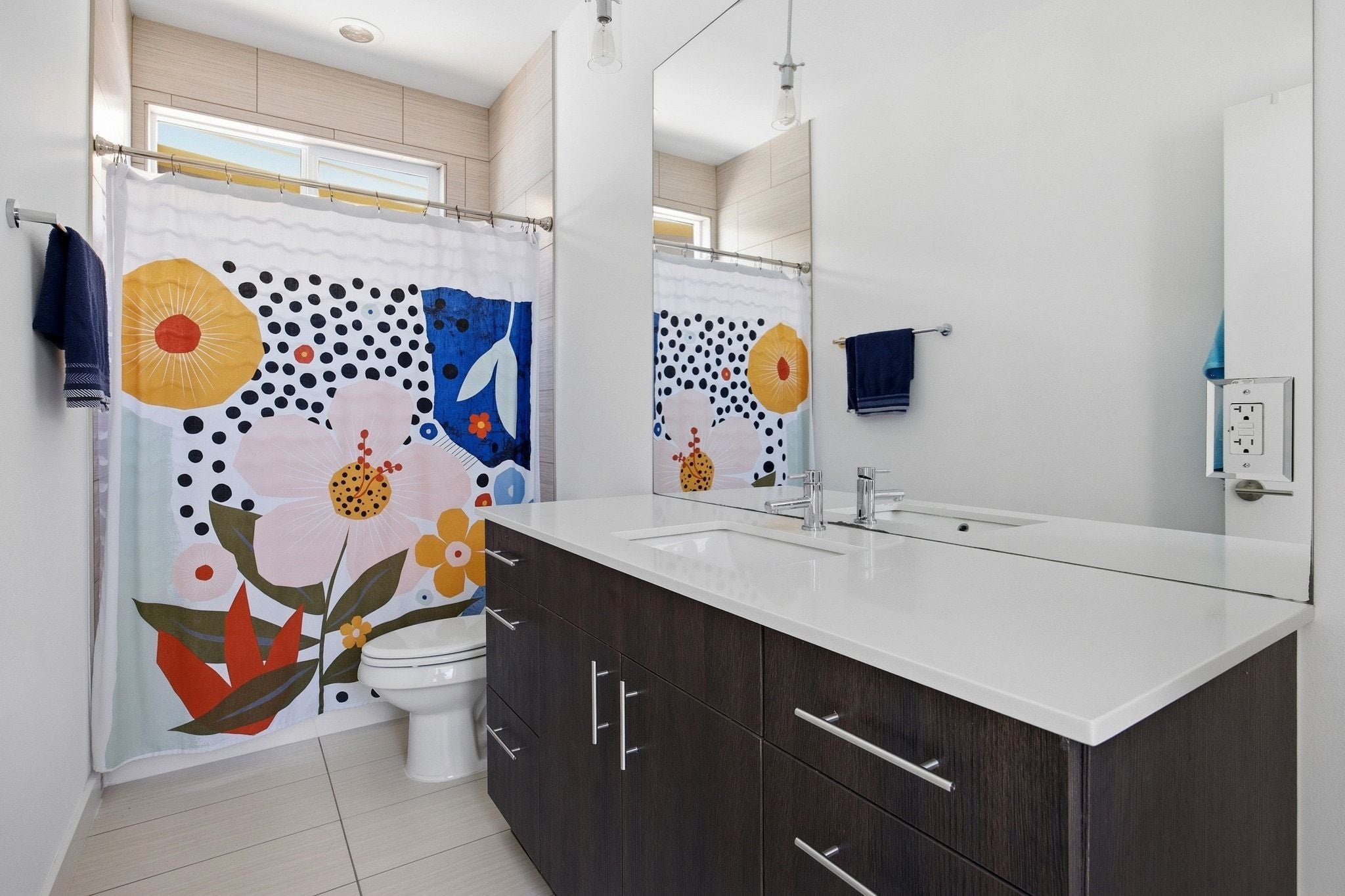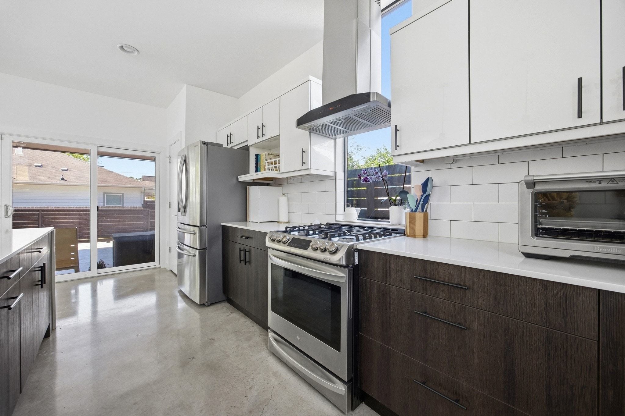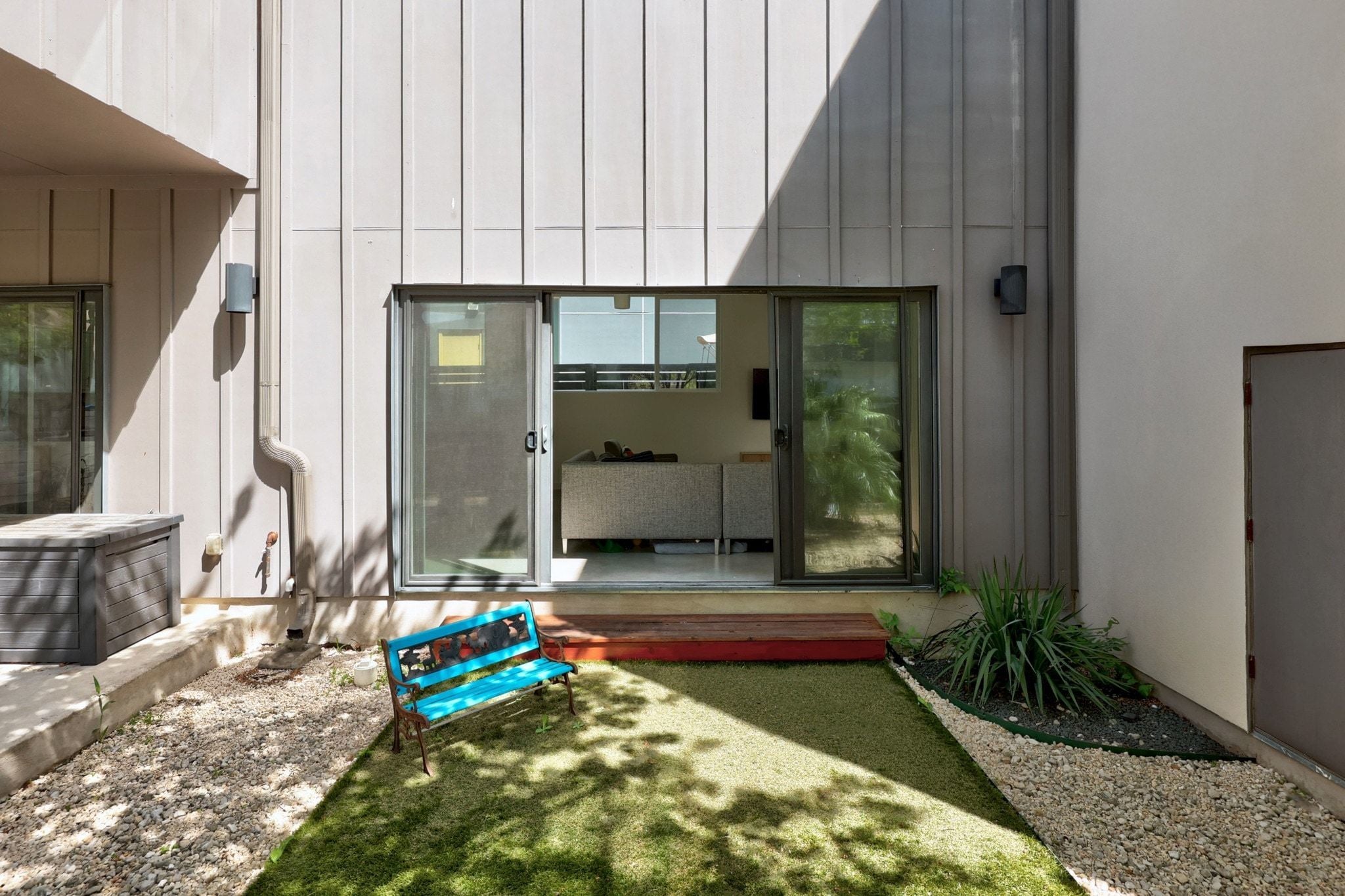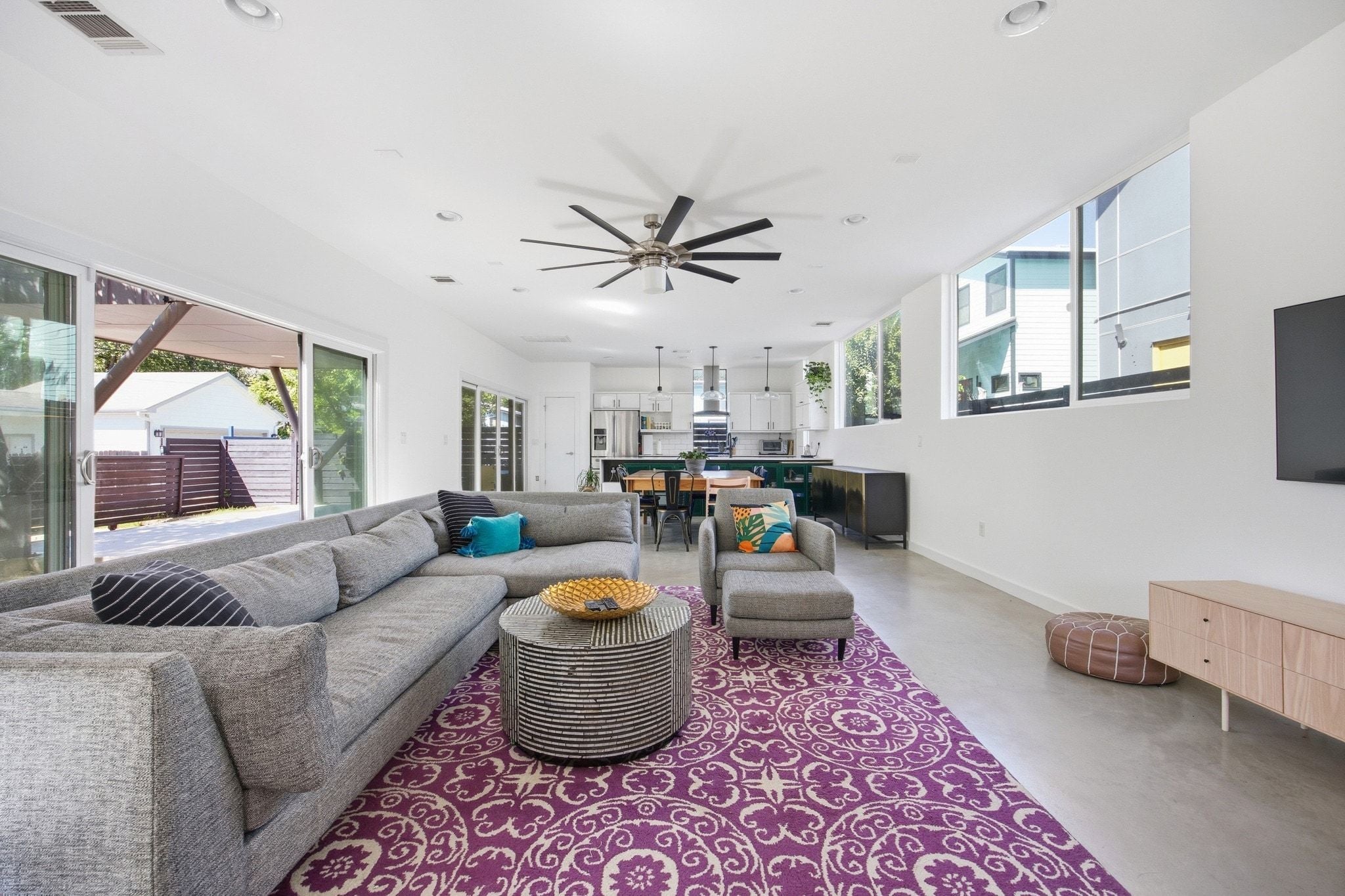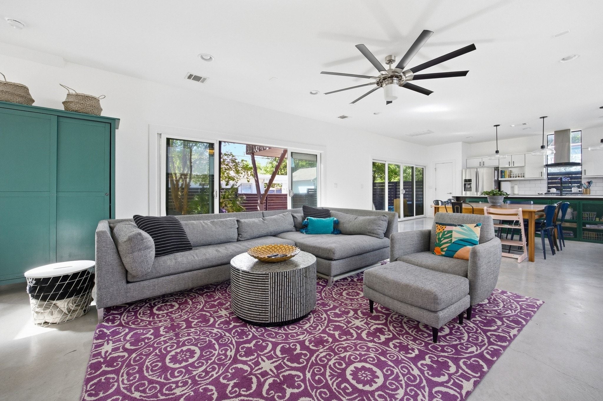 Discover innovative design and elevated finishes in this thoughtfully crafted modern residence, ideally positioned in the heart of vibrant East Austin. Built with sustainability in mind, the home seamlessly blends eco-conscious features with sophisticated style and everyday functionality. Inside, a fully integrated smart home system pairs with custom cabinetry, sleek quartz countertops, and a striking mix of concrete and eucalyptus flooring. Designer lighting and curated tile selections elevate each space, while expansive windows and frameless glass elements enhance the home’s clean, modern aesthetic. The private primary suite offers a serene retreat, complemented by a flexible media room or office to suit a variety of lifestyles. Open-concept living areas create effortless flow for both daily living and entertaining. Step outside to seamless indoor-outdoor connectivity. The fenced, xeriscaped yard is designed for low maintenance and high impact, featuring turf accents, an electric gate, and ample space to gather, lounge, or expand. Situated on a desirable corner lot with alley access, the property is fully gated with perimeter fencing, offering both privacy and presence—just minutes from downtown Austin and the best dining, coffee, and culture the East Side has to offer.