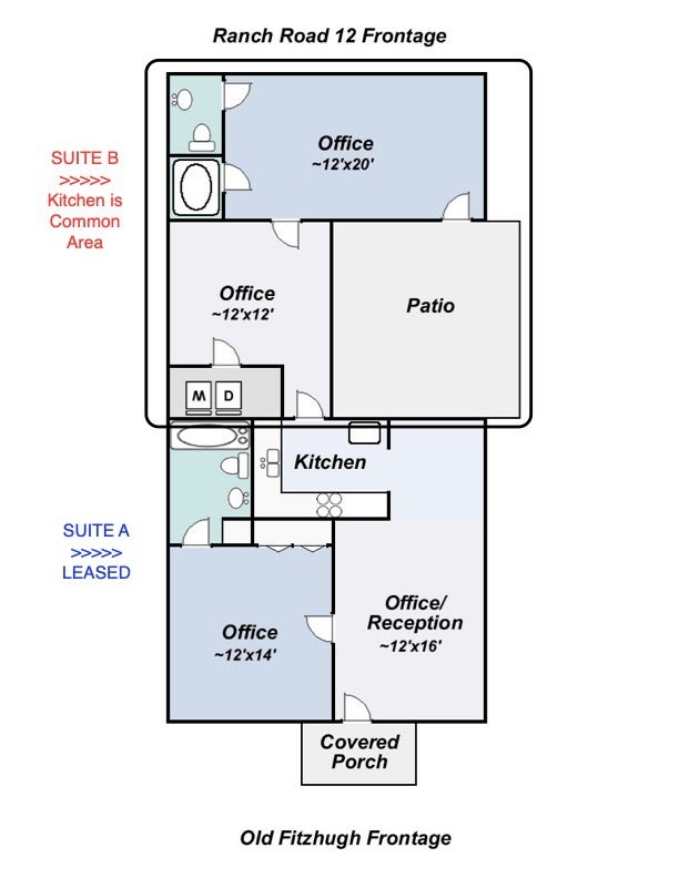 Historic 1950's house with addition, approx 1080 SF total on .52 acre lot with large oaks that stretches across from Old Fitzhugh Rd to RR 12 making it easily accessed by both sides. Old Fitzhugh Road is in a historical district in the heart of Dripping Springs. Major infrastructure improvements are slated to begin 2026 including a new road, sidewalk/lighting for pedestrian access, as well as street parking, similar to Mercer Street in downtown Dripping Springs. This charming property would be a fit for a professional office setting, light medical/med-spa, therapist office, tech or design firm. Suite B is approx 500SF with private access through patio door, bathroom/shower.