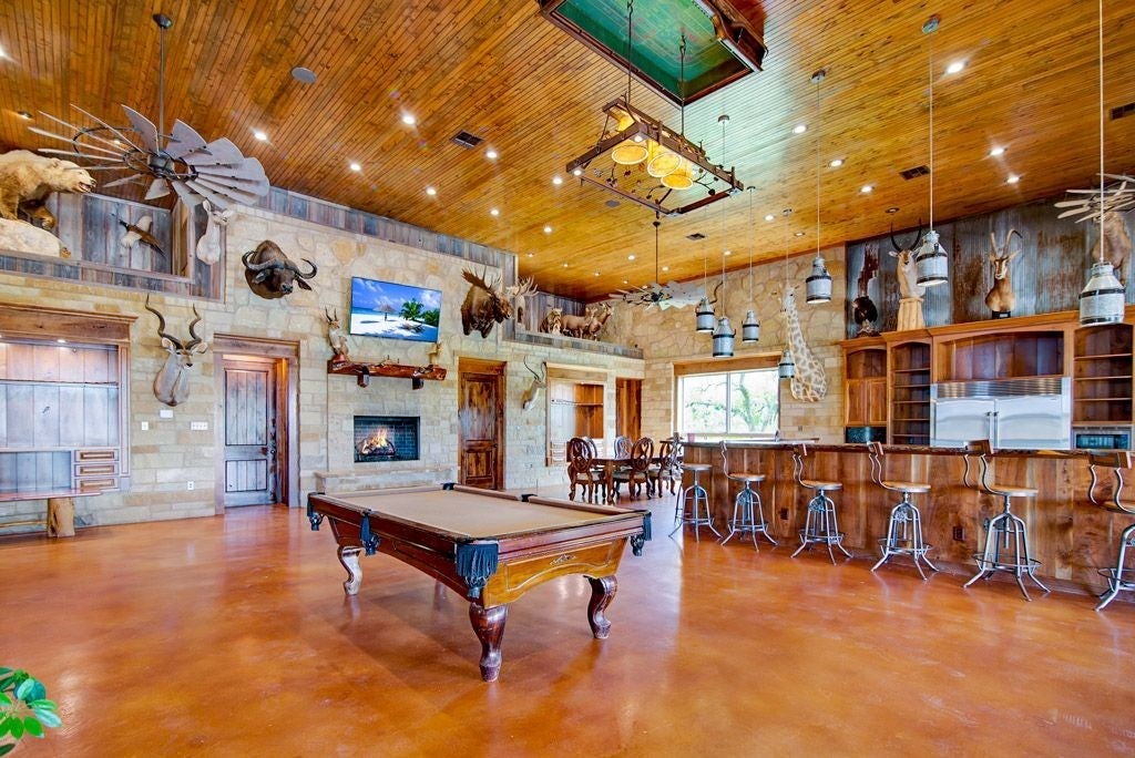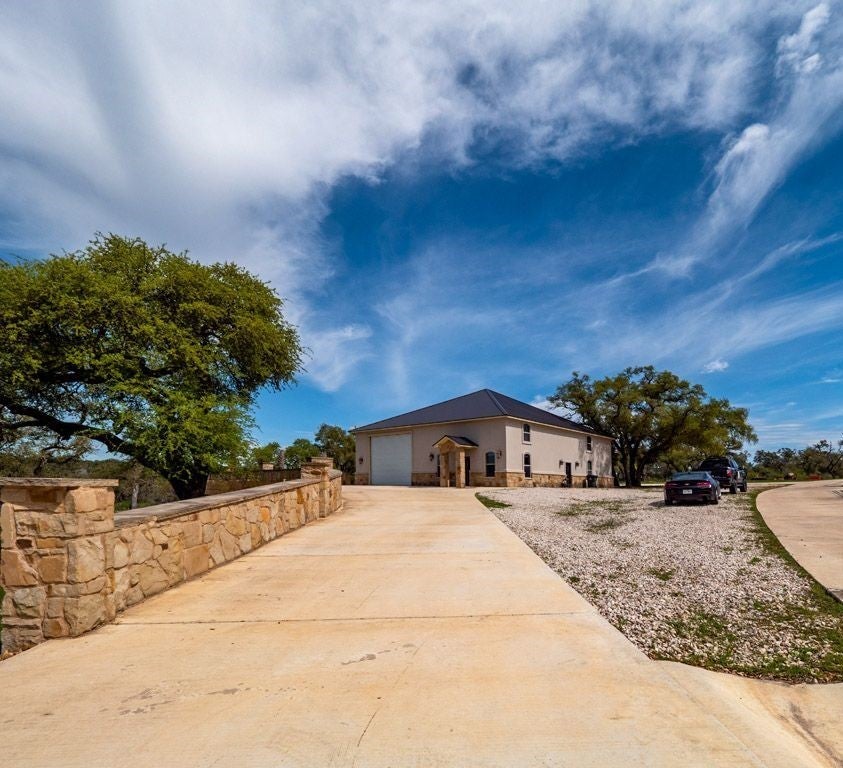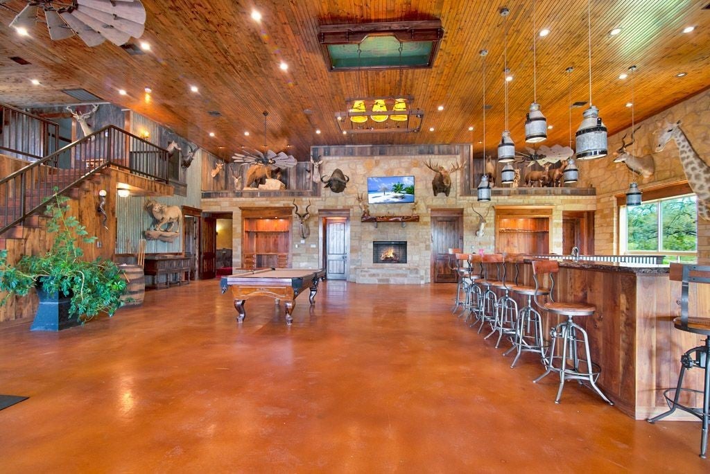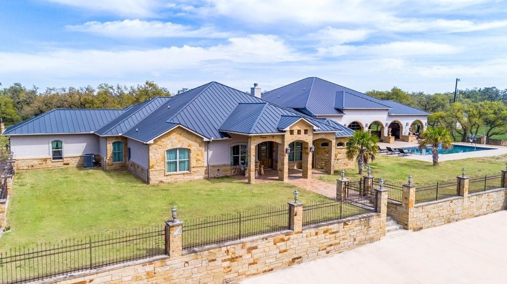 Large estate on 38.9 acres. Completely fenced with a 12-foot game fence and grand rock entrance. Live the life of luxury in this almost 9,000 sqft of living space with 8 bedrooms 8 full baths and 3 half baths. Custom built in every nook and cranny with Texas stone, hardwood, and granite cabinetry. Two large fireplaces, swimming pool, outdoor basketball court, indoor RV parking garage, indoor and an outdoor bar with complete catering setup, or just relax in your own private movie theatre. Other outdoor amenities include dog kennels, livestock pens, barns, and sheds. Large backyard area - fully fenced with wrought iron fencing. Gorgeous Views and beautiful sunsets right from your oversized covered porch. Super unique feature - your own private natural cave that you can explore! Centrally located in the heart of Texas Hill Country right next to the Wimberley Junction on R12 and FM 32. Estate is at the end of the gated subdivision of Trails End Ranch. Less than 30 minutes to Canyon Lake, Wimberley, San Marcos, or New Braunfels. Looking for country living near the big cities? You are less than an hour away from Austin or San Antonio! This is the Texas Hill Country Ranchette you have been waiting for!