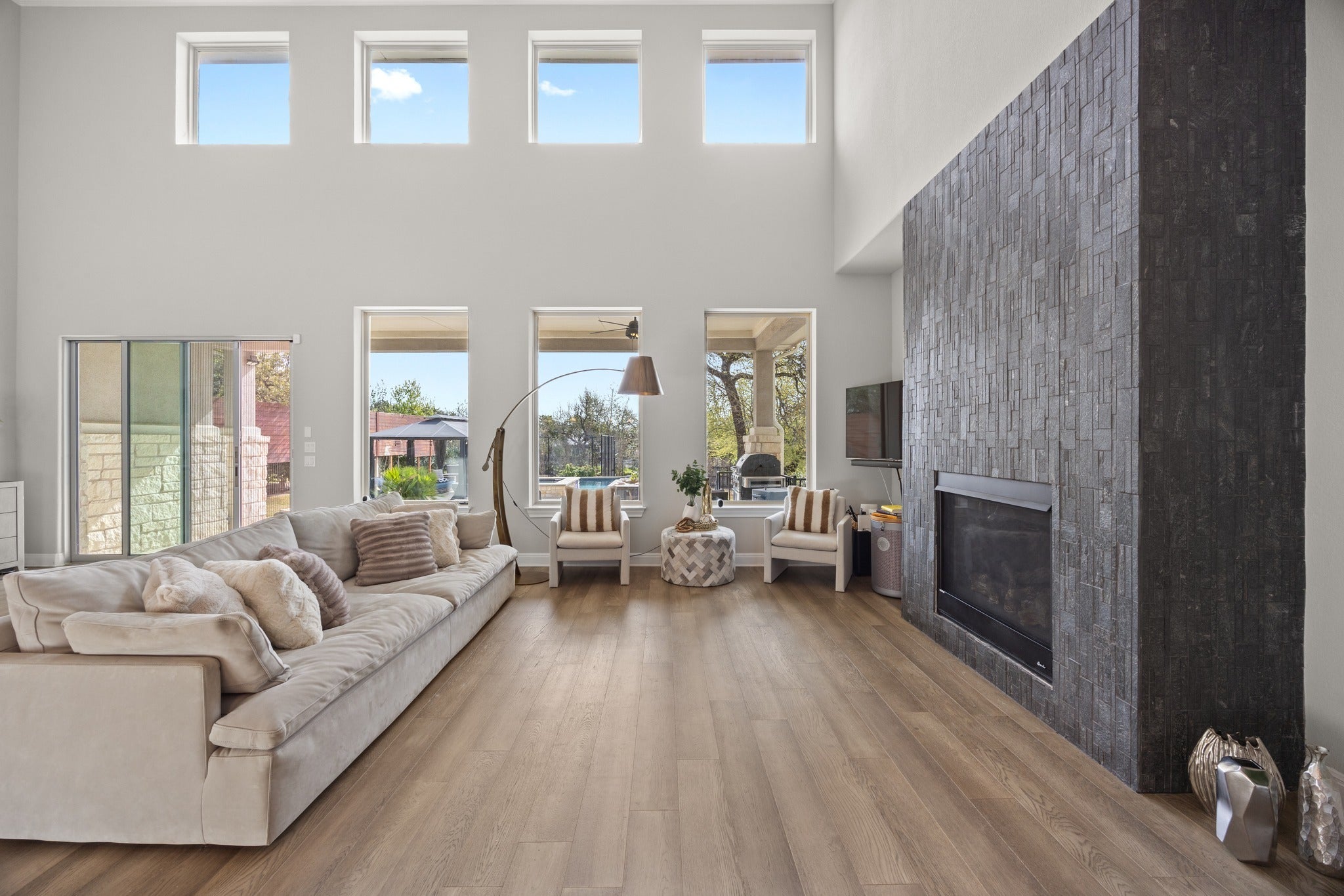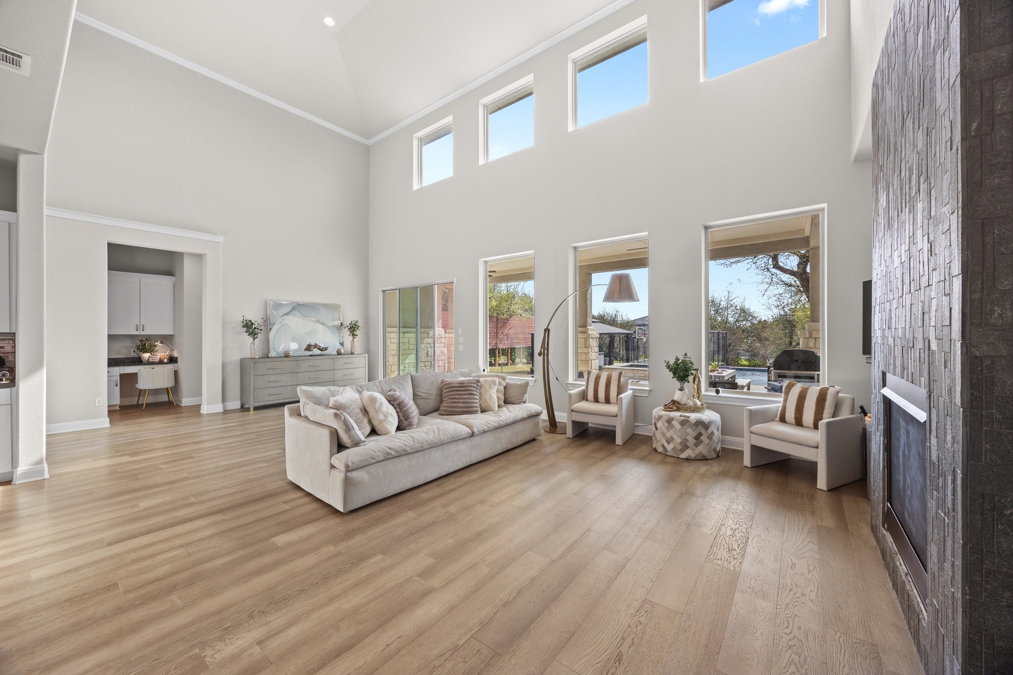Luxury Living on 0.39 Acres with Resort-Style Backyard Situated on a spacious 0.39-acre cul-de-sac lot, this exceptional home offers nearly $400,000 in upgrades and an unparalleled outdoor lifestyle. The backyard is a true private oasis, featuring a heated pool and spa, pool cabana with electrical outlets, and a multi-use sports court designed for volleyball and basketball. Enjoy long summer days and entertaining year-round with over 2,000 sq ft of outdoor living space, including a 268 sq ft covered patio and 1,757 sq ft of deck, concrete, and sport court areas. Inside, the home showcases soaring ceilings, abundant natural light, and elegant oak wood flooring throughout. Designed with both functionality and luxury in mind, the thoughtful floor plan includes: Expansive primary suite on the main floor with bay windows and stunning Hill Country views Spa-like primary bath with separate tub and shower Second main-level bedroom with ensuite bath (ideal for guests or multi-generational living) Dedicated office, Formal dining room, breakfast area, butler’s pantry, and walk-in pantry Convenient half bath on the main level Upstairs features:Two additional bedrooms connected by a Jack-and-Jill bathroom, Spacious media room,Large game room Additional highlights include: Bosch appliances, RainSoft water softener system,Washer, dryer, outdoor grill, patio furniture, and pool cabana, 3-car garage with 8-foot doors, ideal for large vehicles or boat storage Smart home features with remote control access for pool and irrigation systems Located in the highly acclaimed LTISD school district, this home is just minutes from the Hill Country Galleria, Bee Cave Park, and only 20ish minutes to Austin, with walking distance to the middle school. This home offers the perfect blend of luxury, functionality, and lifestyle—don’t miss this rare opportunity.
