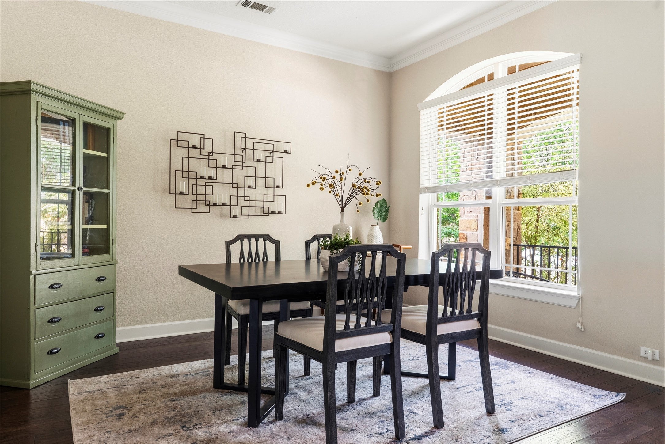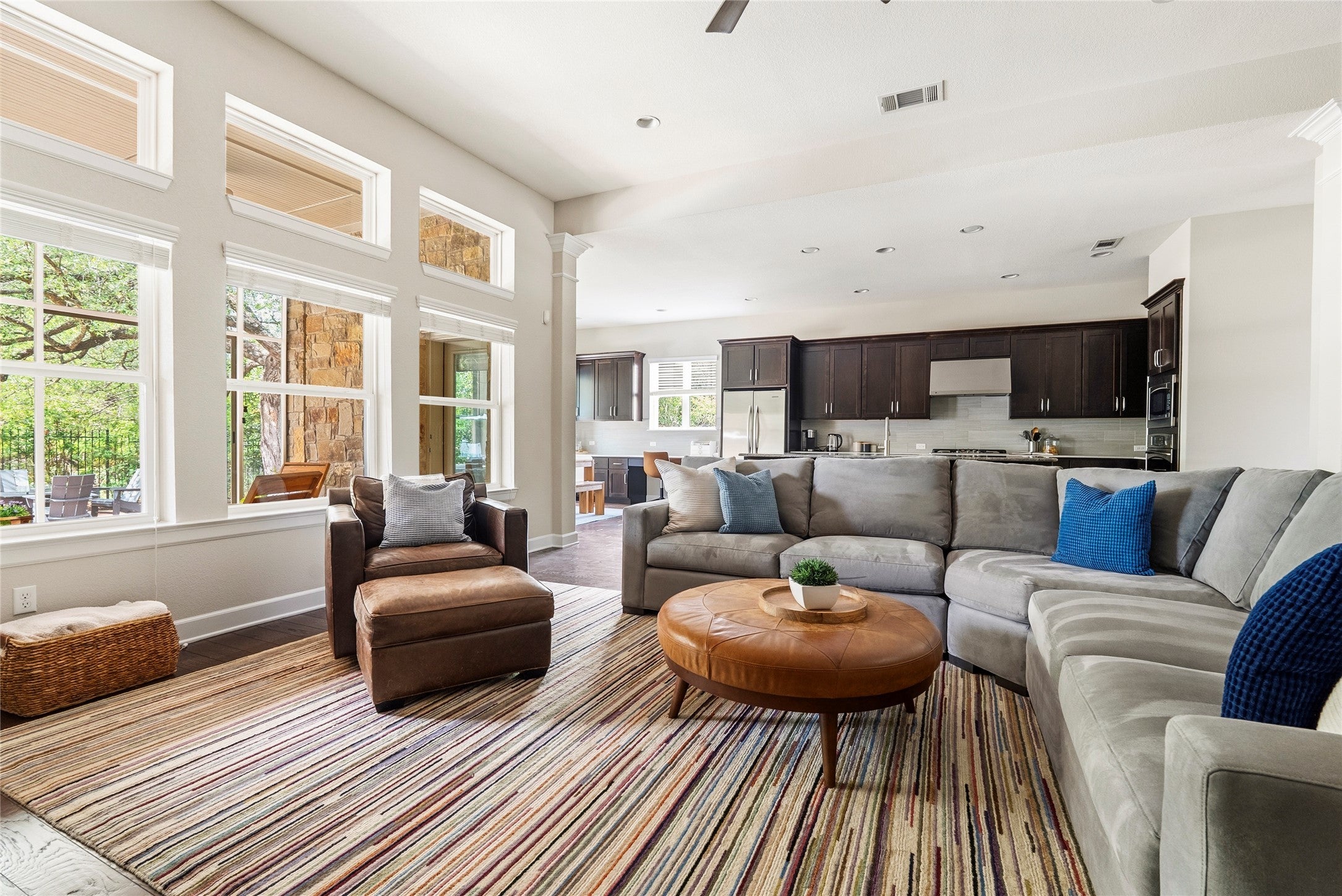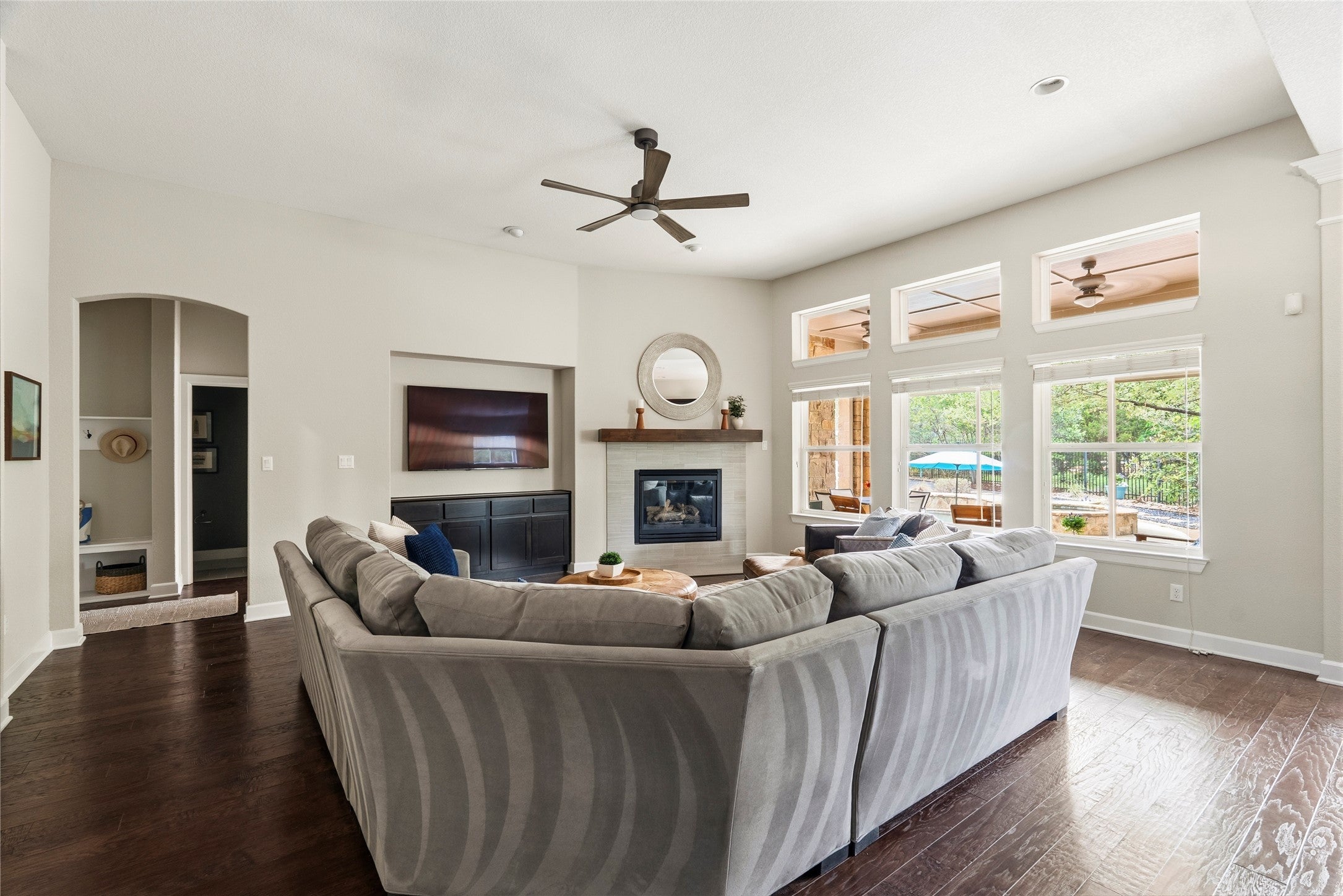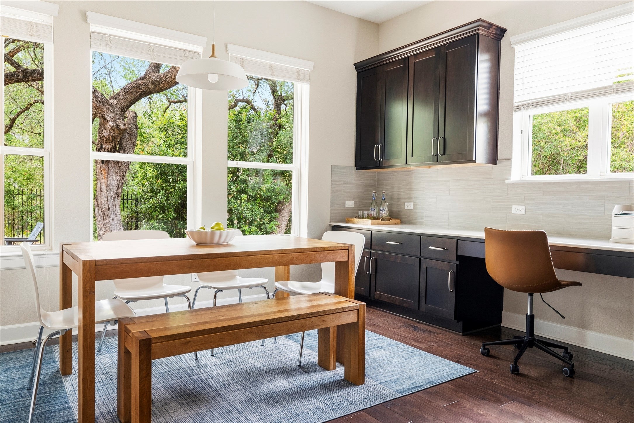 Picture yourself living in this Meridian single-family home with 4 bedrooms 3.5 bathrooms, a dedicated office, 2 dining areas and a game room; where your weekends start with a quiet morning on the miles of trails and end with a swim in your own backyard. Residents love Meridian for its friendly ambiance and the convenience of having the community pool, playground, and the elementary school just a short walk away. This home sits on a generous .33-acre lot, providing a sense of space and quiet that makes this particular pocket of Meridian so highly sought after. Meridian also offers an easy connection to Downtown Austin and the Austin Airport, along with being just minutes from the 45 Toll and MoPac, putting the local favorites at Escarpment Village and the fairways of Greyrock Golf within easy reach. The home itself is bathed in natural light, with windows wrapping around the entire structure to bring the outdoors in. In the living room, a fireplace serves as a centerpiece, while a fireplace and wall of glass that looks out over the pool. The kitchen features a large center island, gas cooktop, and built-in oven, with plenty of storage for every kitchen gadget. A dedicated breakfast area includes a built-in desk and space for a coffee bar. Tucked away on the main floor, the primary suite offers plenty of room for a sitting area or yoga space, with views of the trees outside. The ensuite bathroom feels like a personal spa with its dual vanity, soaking tub, and walk-in shower. Three guest bedrooms are located upstairs; two share a conjoined bathroom with separate vanities, while the fourth bedroom has its own private ensuite. A large game room, with unobstructed views, works perfectly for movie nights or a pool table. The resort-style backyard is incredible, with a screened-in back patio for year-round enjoyment, a sparkling pool, an in-ground spa, and an expansive pool deck. Even with the pool, the lot provides plenty of grassy space for gardening or lawn games.