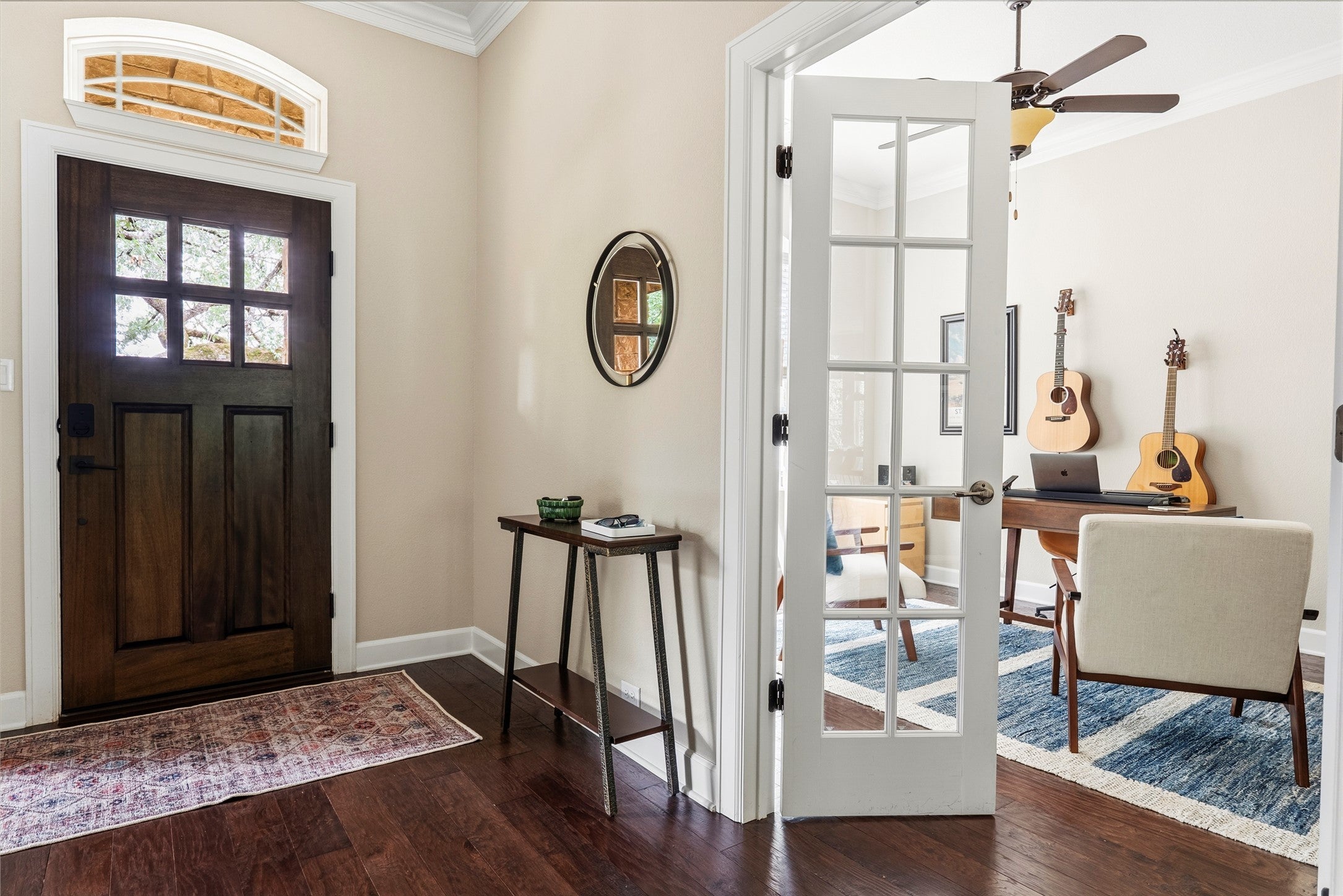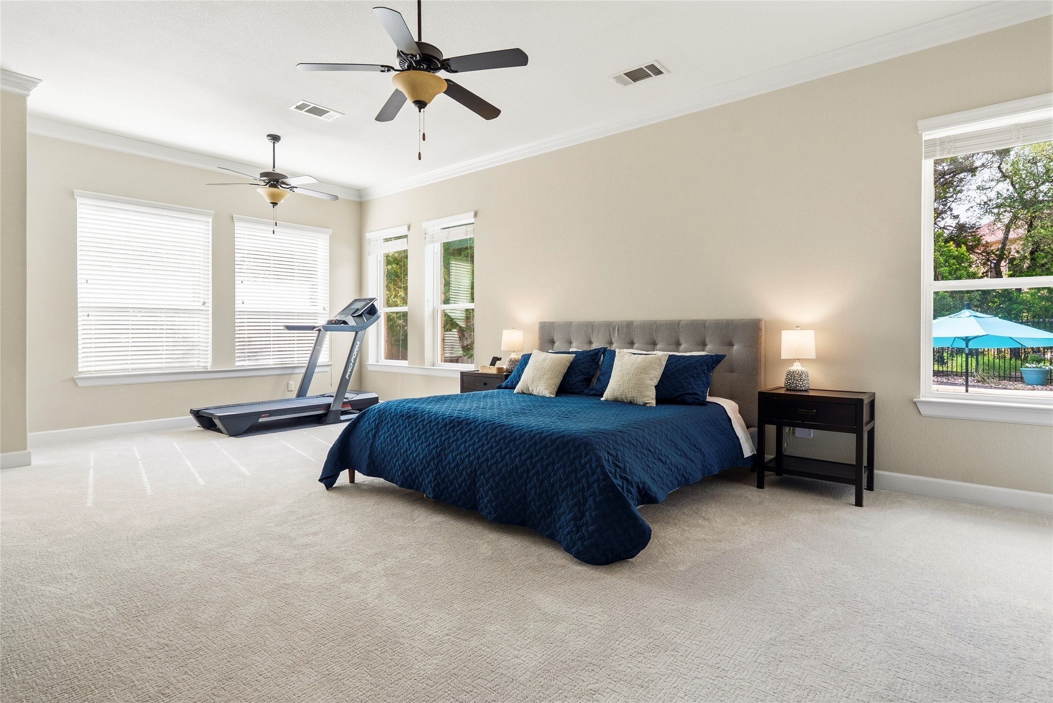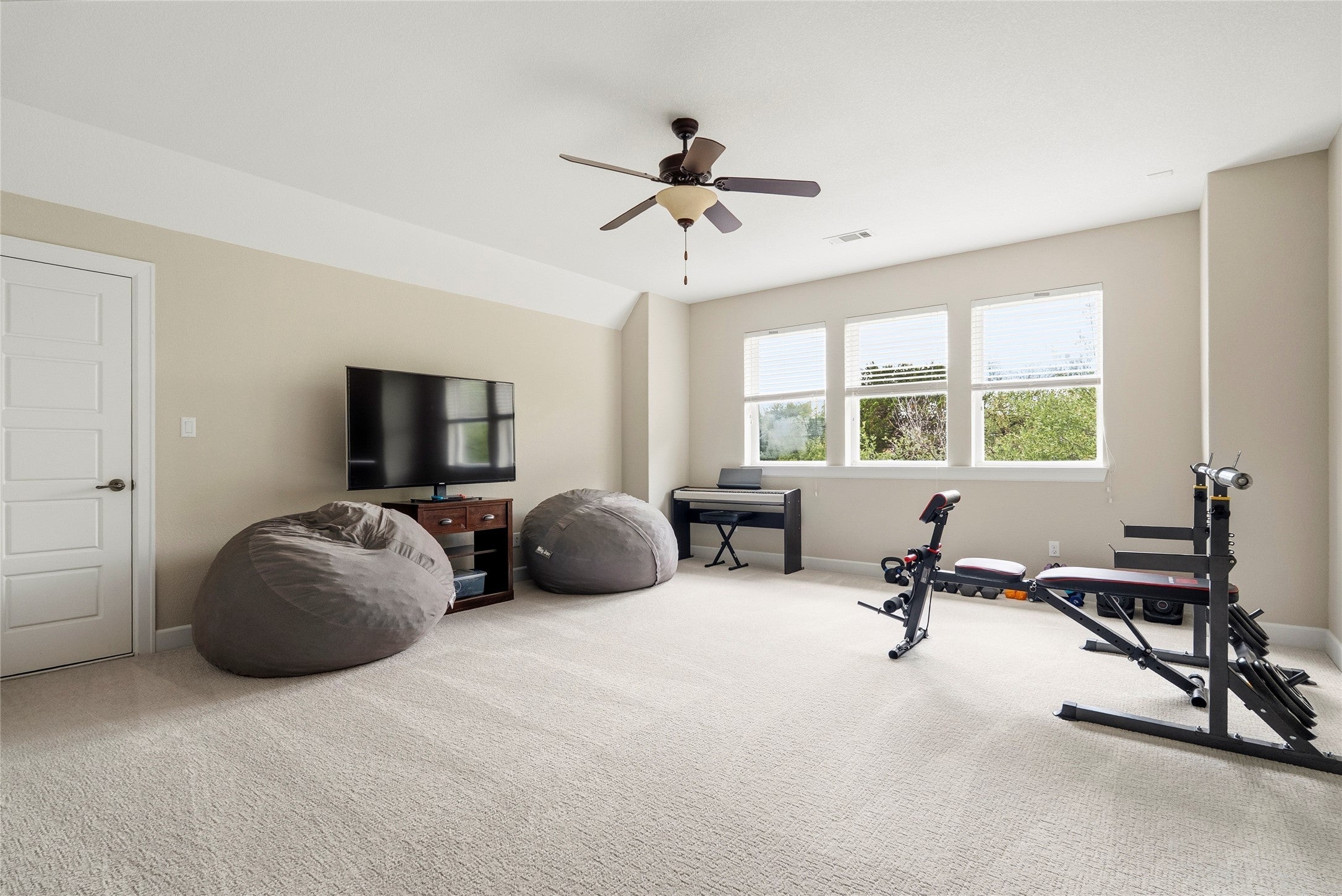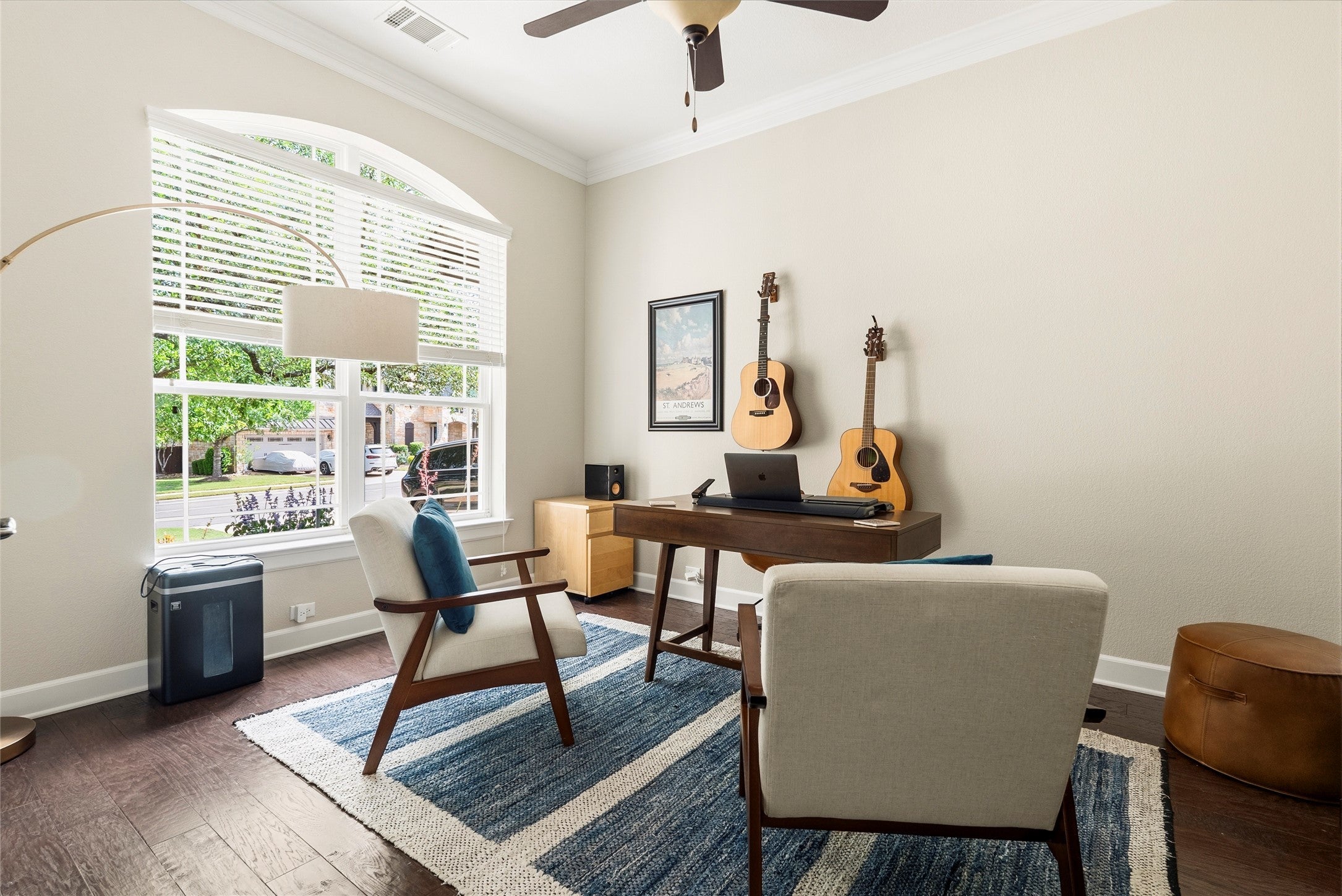 Picture yourself living in this Meridian single-family home with 4 bedrooms 3.5 bathrooms, a dedicated office, 2 dining areas and a game room; where your weekends start with a quiet morning on the miles of trails and end with a swim in your own backyard. Residents love Meridian for its friendly ambiance and the convenience of having the community pool, playground, and the elementary school just a short walk away. This home sits on a generous .33-acre lot, providing a sense of space and quiet that makes this particular pocket of Meridian so highly sought after. Meridian also offers an easy connection to Downtown Austin and the Austin Airport, along with being just minutes from the 45 Toll and MoPac, putting the local favorites at Escarpment Village and the fairways of Greyrock Golf within easy reach. The home itself is bathed in natural light, with windows wrapping around the entire structure to bring the outdoors in. In the living room, a fireplace serves as a centerpiece, while a fireplace and wall of glass that looks out over the pool. The kitchen features a large center island, gas cooktop, and built-in oven, with plenty of storage for every kitchen gadget. A dedicated breakfast area includes a built-in desk and space for a coffee bar. Tucked away on the main floor, the primary suite offers plenty of room for a sitting area or yoga space, with views of the trees outside. The ensuite bathroom feels like a personal spa with its dual vanity, soaking tub, and walk-in shower. Three guest bedrooms are located upstairs; two share a conjoined bathroom with separate vanities, while the fourth bedroom has its own private ensuite. A large game room, with unobstructed views, works perfectly for movie nights or a pool table. The resort-style backyard is incredible, with a screened-in back patio for year-round enjoyment, a sparkling pool, an in-ground spa, and an expansive pool deck. Even with the pool, the lot provides plenty of grassy space for gardening or lawn games.