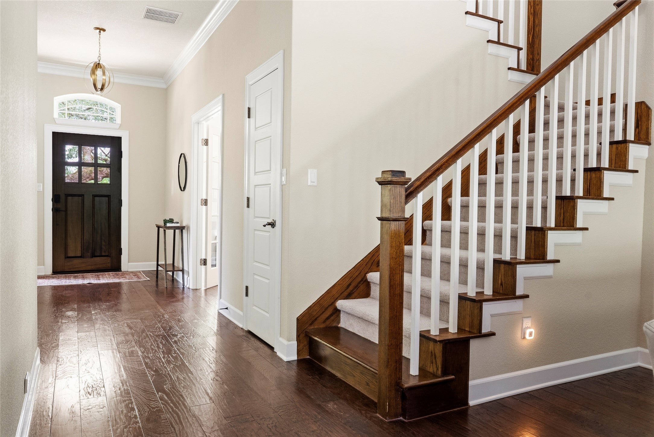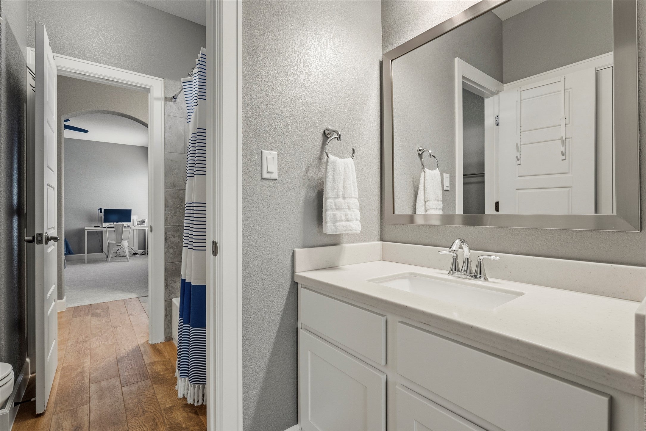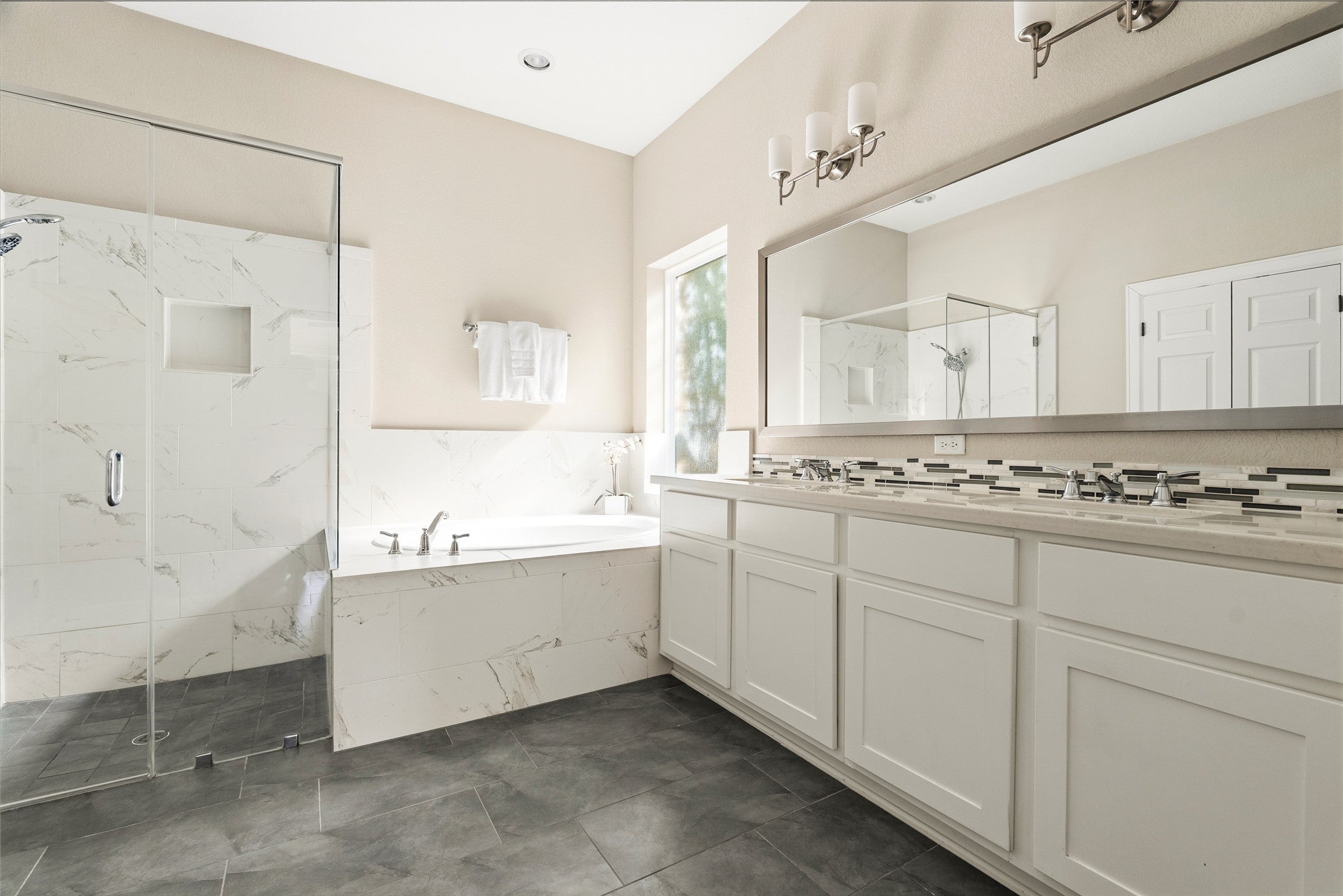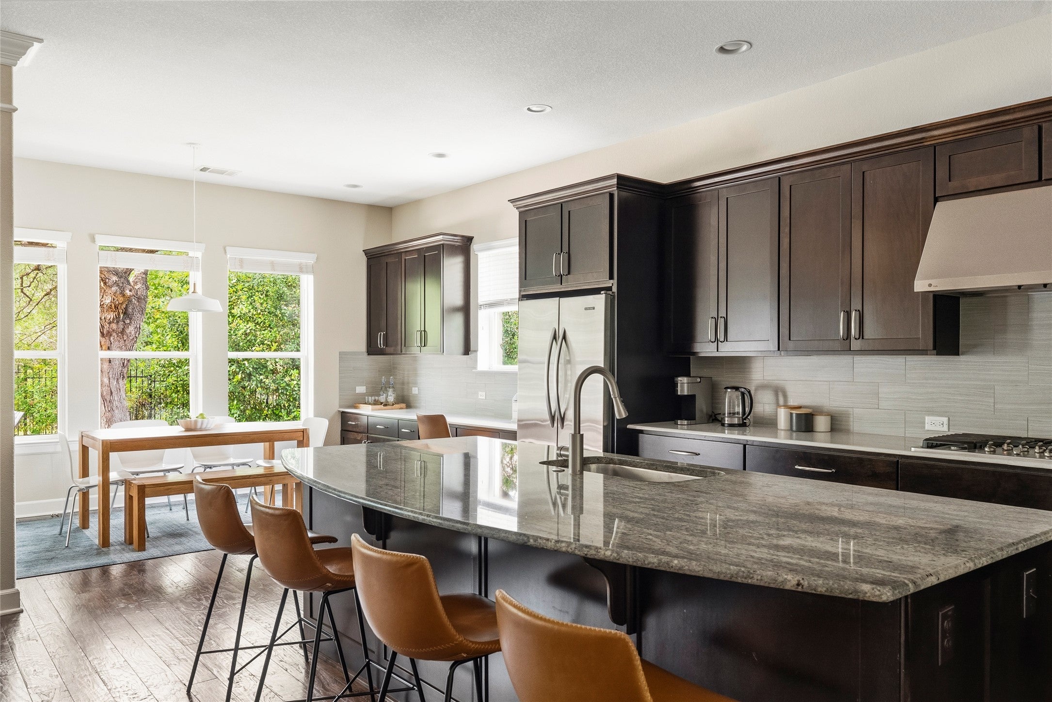 Picture yourself living in this Meridian single-family home with 4 bedrooms 3.5 bathrooms, a dedicated office, 2 dining areas and a game room; where your weekends start with a quiet morning on the miles of trails and end with a swim in your own backyard. Residents love Meridian for its friendly ambiance and the convenience of having the community pool, playground, and the elementary school just a short walk away. This home sits on a generous .33-acre lot, providing a sense of space and quiet that makes this particular pocket of Meridian so highly sought after. Meridian also offers an easy connection to Downtown Austin and the Austin Airport, along with being just minutes from the 45 Toll and MoPac, putting the local favorites at Escarpment Village and the fairways of Greyrock Golf within easy reach. The home itself is bathed in natural light, with windows wrapping around the entire structure to bring the outdoors in. In the living room, a fireplace serves as a centerpiece, while a fireplace and wall of glass that looks out over the pool. The kitchen features a large center island, gas cooktop, and built-in oven, with plenty of storage for every kitchen gadget. A dedicated breakfast area includes a built-in desk and space for a coffee bar. Tucked away on the main floor, the primary suite offers plenty of room for a sitting area or yoga space, with views of the trees outside. The ensuite bathroom feels like a personal spa with its dual vanity, soaking tub, and walk-in shower. Three guest bedrooms are located upstairs; two share a conjoined bathroom with separate vanities, while the fourth bedroom has its own private ensuite. A large game room, with unobstructed views, works perfectly for movie nights or a pool table. The resort-style backyard is incredible, with a screened-in back patio for year-round enjoyment, a sparkling pool, an in-ground spa, and an expansive pool deck. Even with the pool, the lot provides plenty of grassy space for gardening or lawn games.