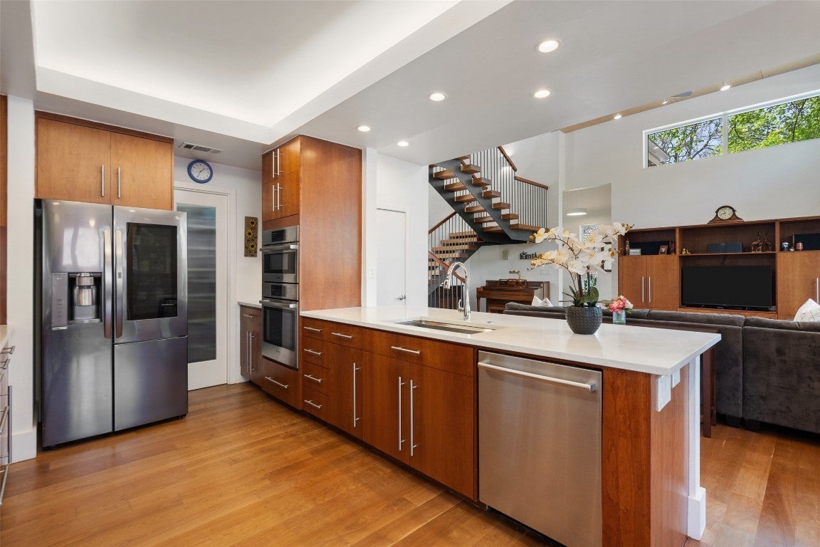 Modern Luxury in Iconic SoCo – Rooftop Views, Timeless Design, Prime Walkability Welcome to 1809 Eva Street, an architecturally striking multi-level residence nestled in the heart of Austin’s legendary South Congress (SoCo) district- just minutes from Lady Bird Lake, Downtown, and top employers like Google, Amazon, and Meta. This enviable address offers unmatched walkability to world-class dining, designer boutiques, and the cultural pulse that defines “Keep Austin Weird.” Originally built in 2006 and thoughtfully reimagined, this home masterfully blends clean modern lines with warm, functional living spaces. The open-concept main level is filled with natural light and anchored by a chef-inspired kitchen featuring premium stone countertops, high-end appliances, and a generous walk-in pantry- perfect for both casual living and elevated entertaining. Just off the kitchen, a charming screened-in porch creates a tranquil space to unwind or dine al fresco. A full guest suite on the main level provides privacy and comfort for visitors, while the expansive second-floor primary suite spans nearly the entire level, offering a true retreat with room for a lounge, home gym, or workspace in the adjacent loft-style bonus area. The third level surprises with flexible secondary living space, two additional bedrooms, a full bath, and direct access to the show-stopping rooftop deck where sweeping views of the city skyline set the stage for memorable evenings under the stars. Surrounded by lush, established landscaping and framed by mature trees, the home offers rare serenity in the middle of it all. An oversized two-car garage and spacious driveway provide ample off-street parking- an uncommon luxury in this vibrant neighborhood. Whether you're seeking a lock-and-leave urban residence or an appreciating asset in one of Austin’s most desirable zip codes, 1809 Eva Street delivers sophisticated city living at its finest.