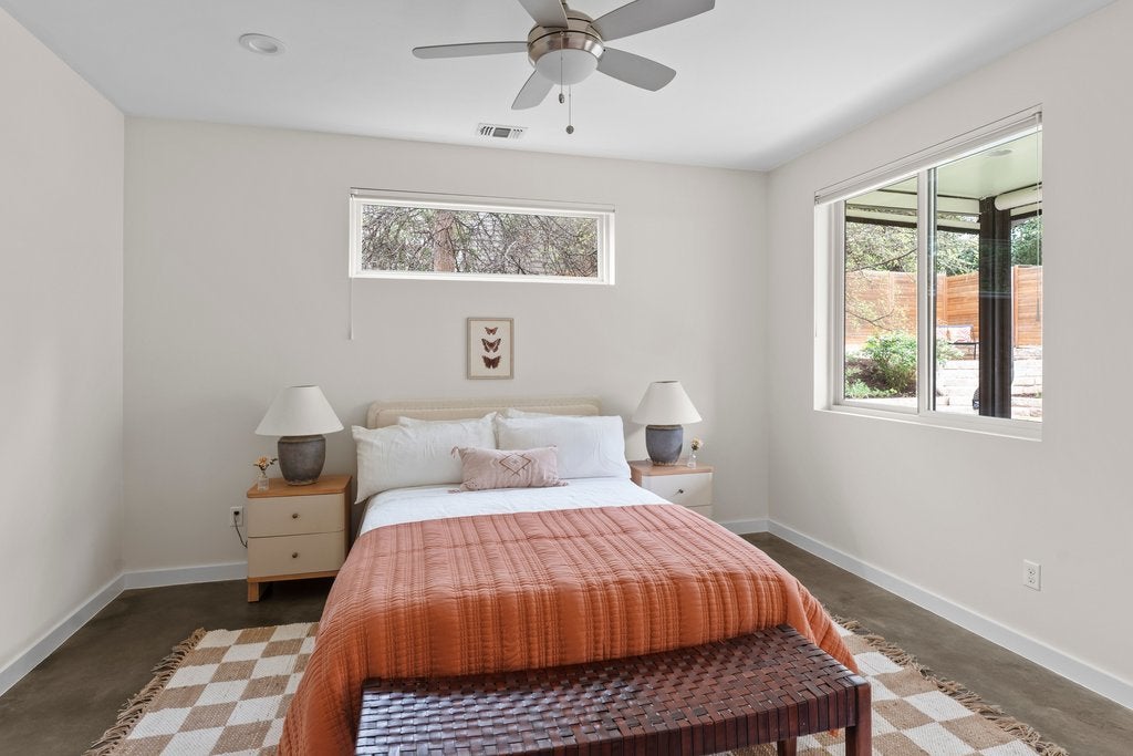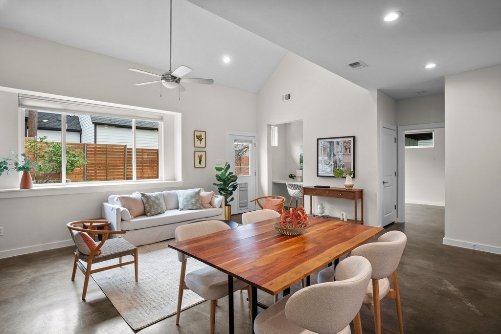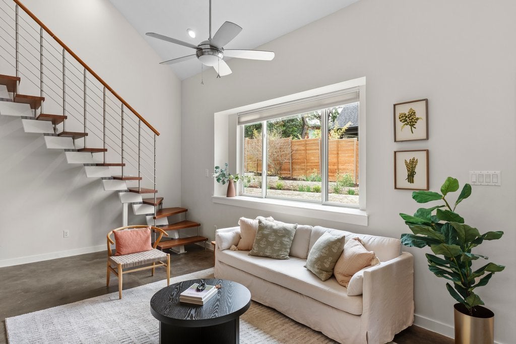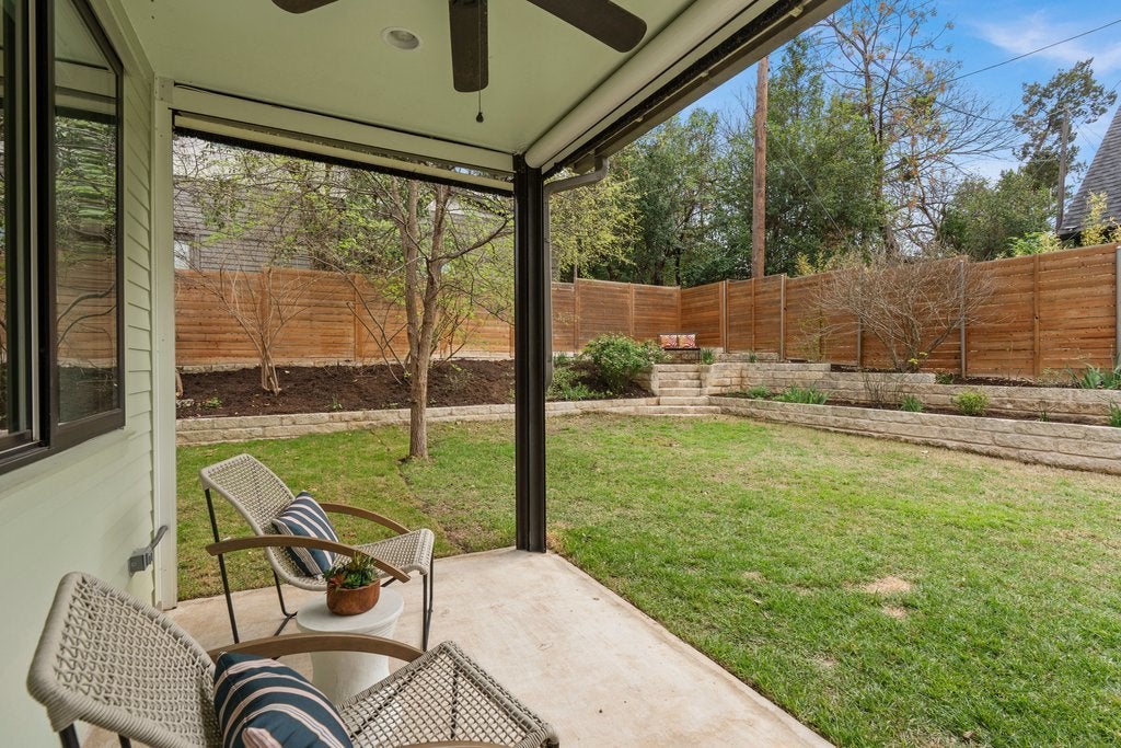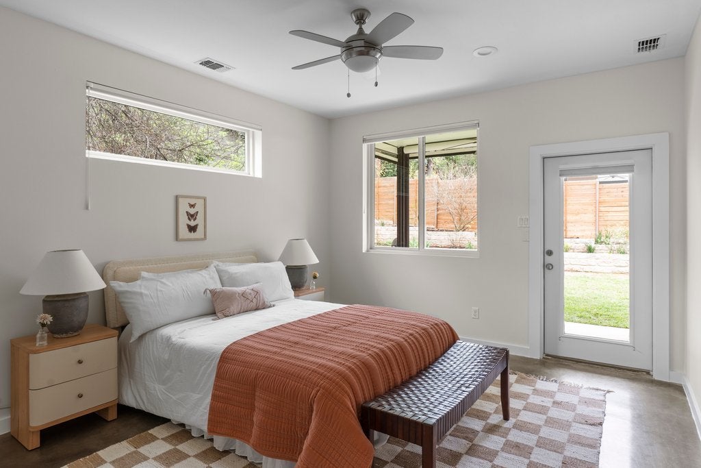 Tucked into a quiet 13 home community in the heart of 78704, this thoughtfully designed home offers modern style, meaningful owner upgrades, and a surprisingly private outdoor setting. The open floor plan features polished concrete and acacia wood floors and quartz countertops throughout, creating a clean and durable space that works well for everyday living and entertaining. The spacious primary suite is located on the main floor and opens directly onto a covered screened porch with motorized screens, a comfortable spot for morning coffee or relaxing in the evening. The porch overlooks an oversized corner lot with terraced gardens, creating a private outdoor space with plenty of greenery. Recent owner updates include freshly refinished kitchen and bathroom cabinetry, along with new paint on the walls and trim throughout the first floor. Bathrooms have been updated with new tile, frameless glass showers, and generous custom niches for shower storage. The primary bath features a double vanity and walk in shower. Upstairs are two additional bedrooms, a full bath, and a large walk in storage room. Built for comfort and efficiency, the home includes spray foam insulation, dual pane windows, and a tankless water heater to help keep utility bills low year round. Low HOA fees include irrigation and lawn care and maintenance for both the front and back yard. Located on a quiet cul de sac just a short walk from South 5th Recreation Center with trails, tennis and basketball courts, fields, and a playscape. Also convenient to the local shops and restaurants along South 1st Street, South Congress, and South Lamar, with quick access to downtown Austin and the airport.