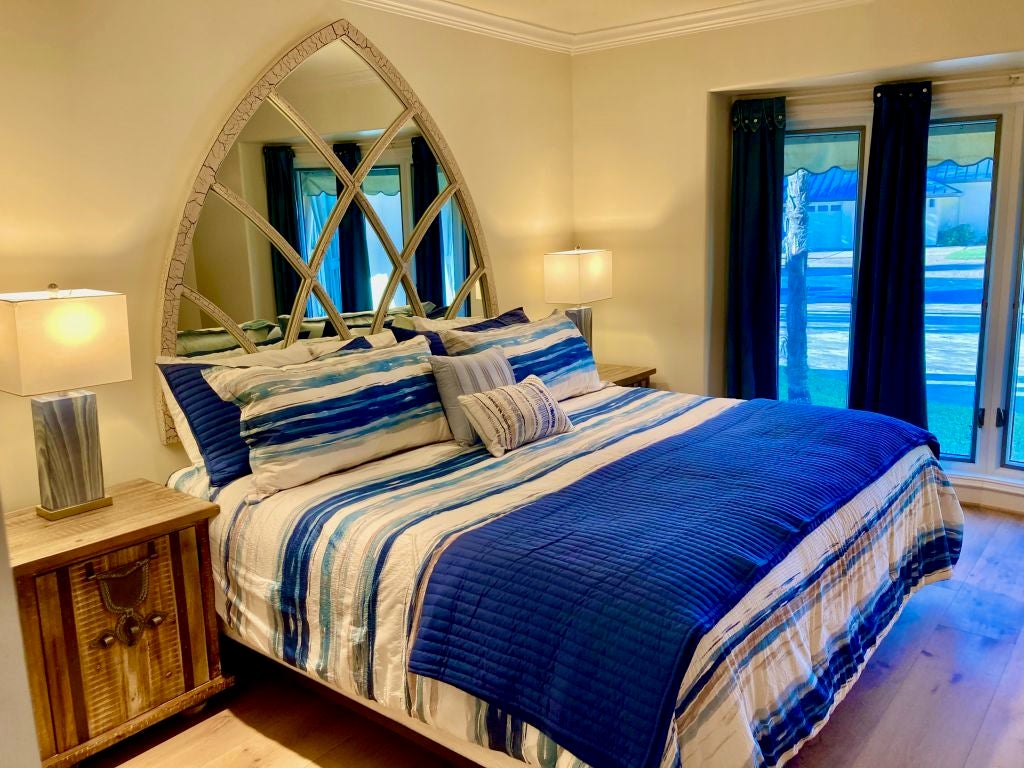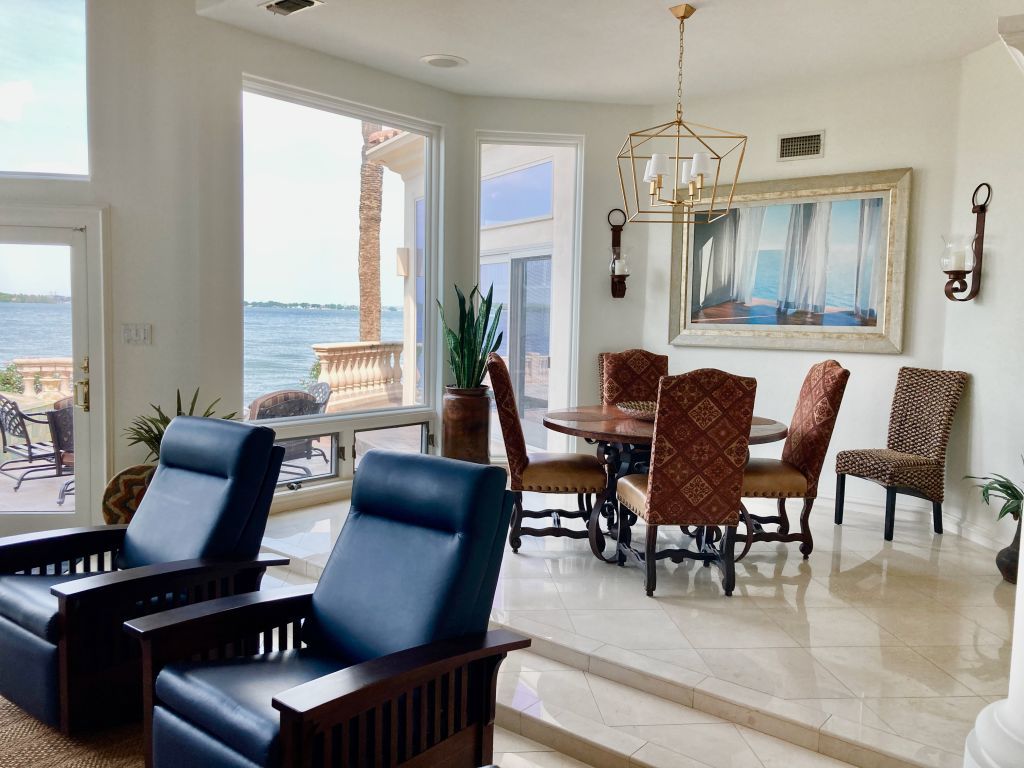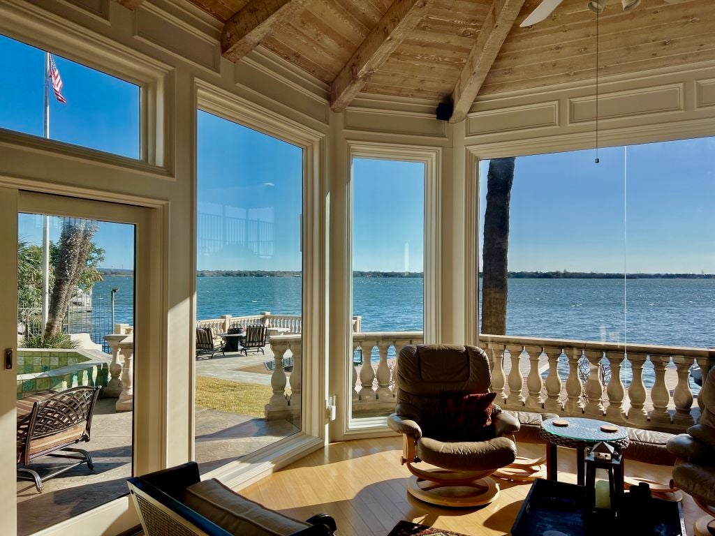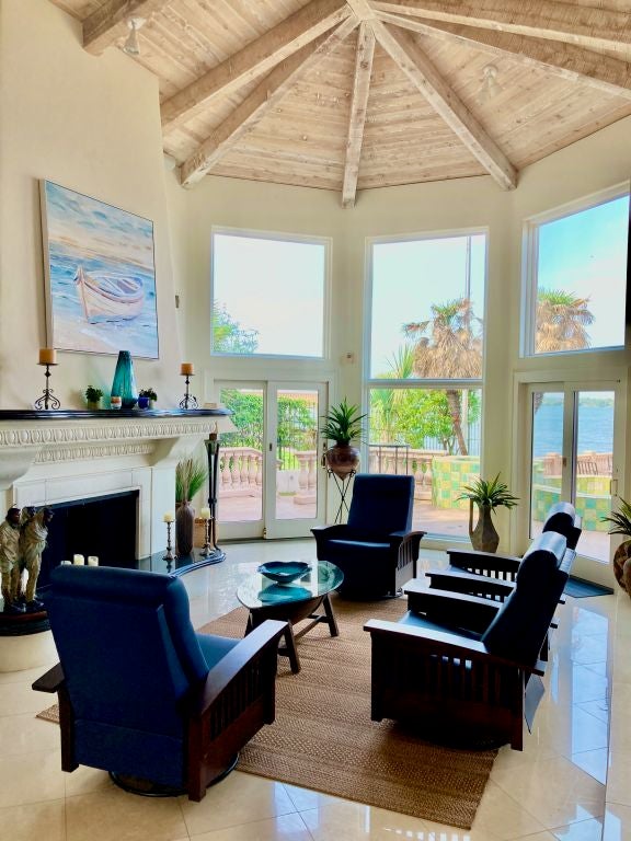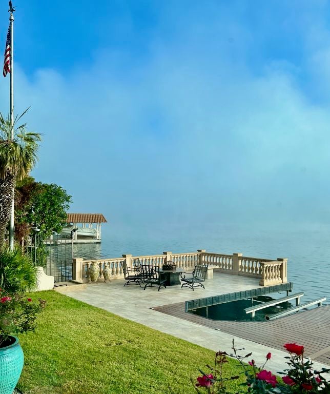 A rare, gated street-to-water estate on constant-level Lake LBJ, offering east-facing panoramic water views and exceptional privacy in the heart of Horseshoe Bay. Set on a quiet cul-de-sac adjacent to the exclusive Lighthouse Drive, this single-story home delivers resort- style lake living with a level of seclusion seldom found on the Highland Lakes. The Mediterranean-inspired residence spans 3,138 sq ft. The 3br/4ba plus office is designed for seamless indoor-outdoor living. Soaring wood-beamed ceilings crown inviting living areas, while walls of windows frame sweeping lake views and fill the home with natural light, all while maintaining a remarkable sense of privacy. Seamless indoor-outdoor living is a standout feature, highlighted by an elevated "Lido" deck with unobstructed lake views—ideal for sunrise coffee, sunset gatherings, stargazing or fireworks. At lake level, a fully equipped outdoor "Cantina" with grill and kitchen creates the perfect setting for lakeside dining and entertaining. The deep waterfront features five hydraulic lifts for two boats, two personal watercraft, and a movable swim platform which allows for year-round boating, swimming, and water sports. The property is also equipped with a whole-house Generac standby generator, providing seamless backup power when it matters most. From quiet mornings to relaxed evenings on the water, this Lake LBJ home offers access to a rarely available, refined waterfront lifestyle.