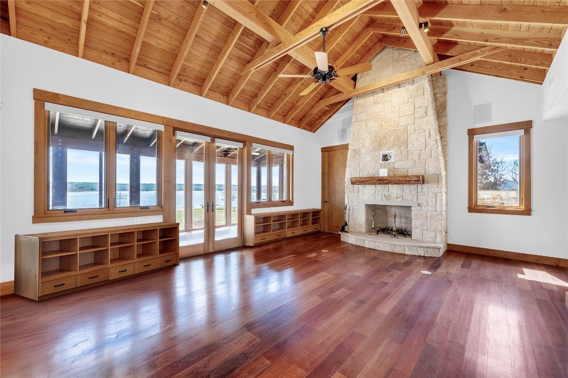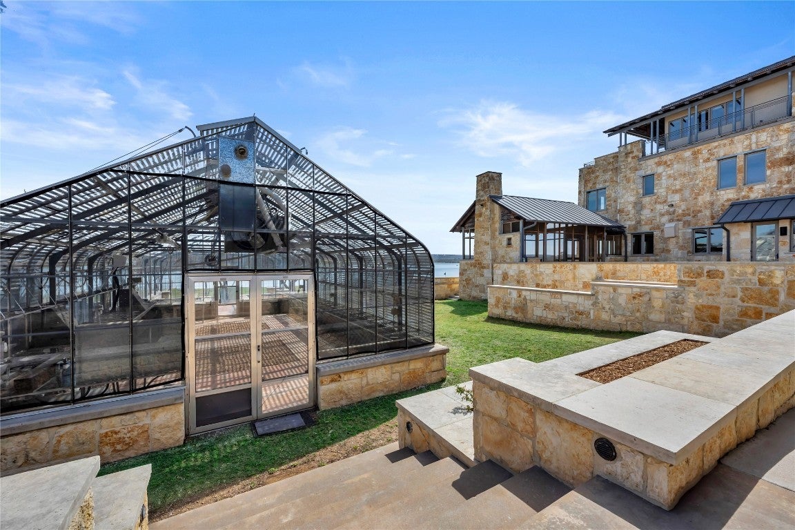 Welcome to 118 Mountain View Circle! This remarkable custom estate, designed by the esteemed architect Sinclair Black, epitomizes architectural brilliance in the heart of The Highland Lakes. Set on well over two acres, this extraordinary property boasts over 300 feet of serene Inks Lake open waterfront, offering uninterrupted, panoramic views of the picturesque Hill Country. A majestic entrance, flanked by a striking stone wall, ushers you through a lush circular drive surrounding towering cypress trees. To the left, a meticulously appointed guest residence awaits, featuring soaring cathedral wood ceilings, a gourmet kitchen, luxurious bath with heated floors, and a charming courtyard with a tranquil fountain. Beyond lies a professional-grade shop with ample storage and greenhouse with climate control and rain-catch irrigation. The main estate is a vision of elegance, with a grand stone-columned entrance leading into a spectacular foyer adorned with eastern aromatic cedar cathedral ceilings, hand-cut limestone walls, and custom wood cabinetry throughout. The state-of-the-art chef’s kitchen is outfitted with Wolf and Sub-Zero appliances, dual islands, double ovens, and enclosed wet bar. The expansive great room has a magnificent stone fireplace and breathtaking lake views. The opulent master suite features a fireplace, screened porch, spa-like bath, and dedicated office. Upper levels include a game/bunk room, two spacious en-suite bedrooms, and a penthouse office with extraordinary panoramic views. ~ Owner financing available upon request ~