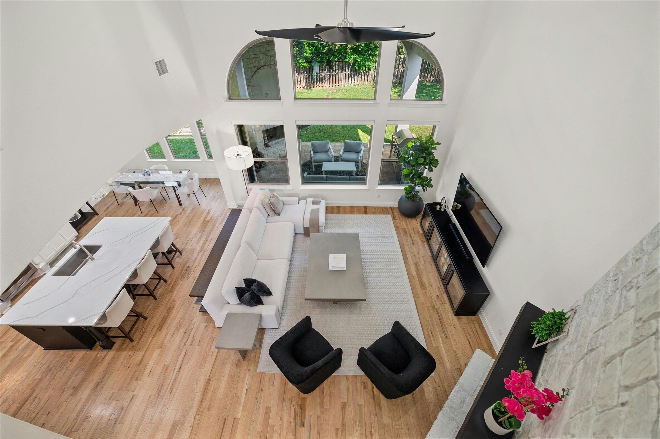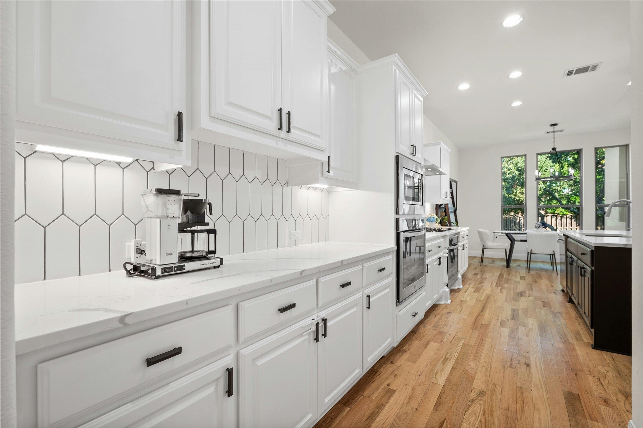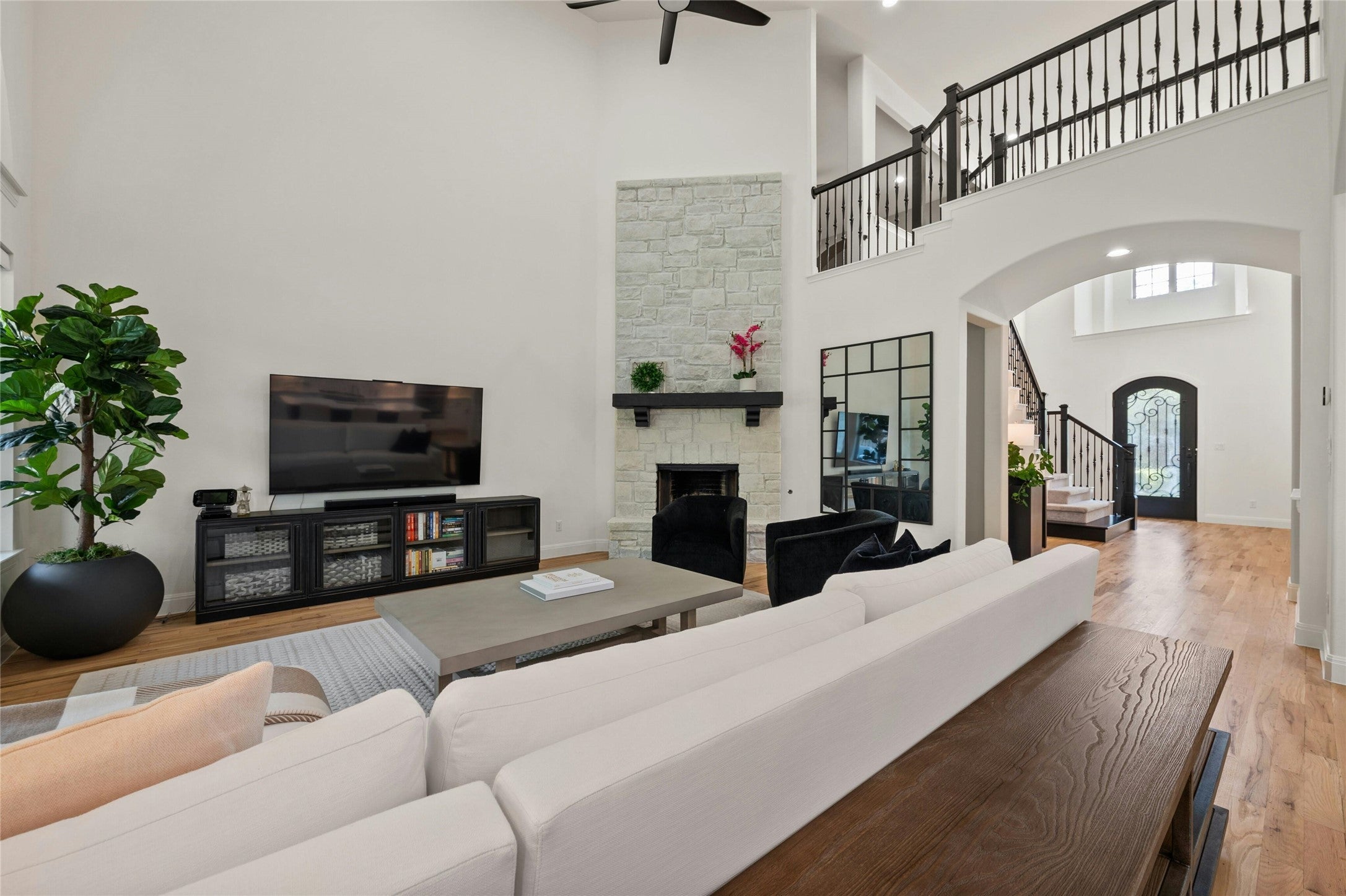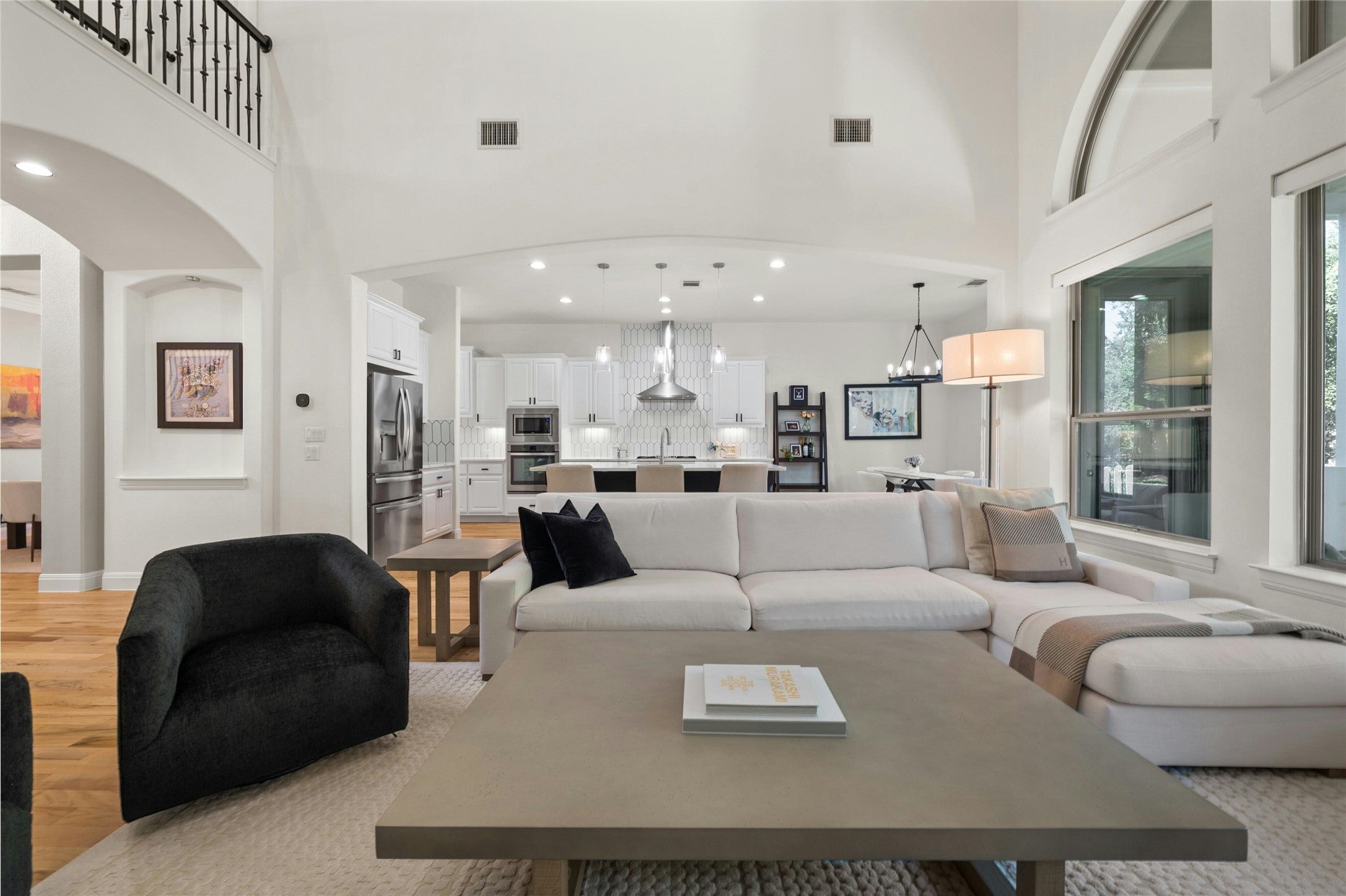 Experience luxury living in this beautifully upgraded Drees Kenwood floorplan, now available for lease in the highly sought-after Rocky Creek Neighborhood. This meticulously maintained home combines stylish, contemporary design with ultimate comfort, offering a perfect retreat in the Texas Hill Country. As you step inside, you'll be greeted by an array of premium upgrades. The formal dining room, accented by a stunning stone wall, leads seamlessly to the butler’s pantry and a chef-inspired kitchen. The kitchen features new quartz countertops, a modern backsplash, multiple ovens, stainless steel appliances, and ample storage, making it perfect for hosting and daily living. The expansive living room, with its high ceilings and floor-to-ceiling windows, offers serene views of the outdoors. The original hardwood flooring flows through the open-concept layout, enhancing the home's elegance. The primary suite is a true sanctuary, boasting high ceilings, a large walk-in closet, and a luxurious spa-like bath. The in-law floor plan includes a spacious downstairs bedroom, providing extra flexibility. Upstairs, you'll find additional spaces for entertainment, including a game room, media room with a wet bar, and two more bedrooms with walk-in closets—one with an ensuite bath. The garage offers extensive storage options, including 800 square feet of additional space with overhead racks. There is an electric car charger and epoxy floors. The backyard is a versatile space, perfect for a pool, garden, or play area. The large, covered patio features an outdoor kitchen with a built-in BBQ, fridge, fireplace, and TV wiring—ideal for outdoor relaxation. Enjoy the community amenities, including being walking distance to the pool, playground, and trailhead leading to miles of preserved space. Zoned for Lake Travis ISD!
