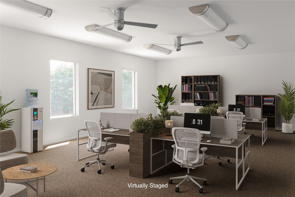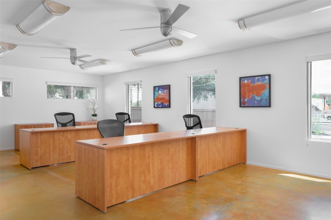 900 W North Loop Blvd is a premium turnkey office and creative space in Austin’s vibrant Brentwood neighborhood. Recently renovated, the two-story building with an upper deck offers 3,540 sq. ft. of flexible, light-filled workspaces, thoughtfully designed for creative agencies, tech startups, boutique firms, & forward-thinking professionals. Located between North Lamar and Burnet Road, the property is surrounded by established residential neighborhoods, walkable retail, & dining, with easy access to major thoroughfares and public transit. A Walk Score of 71 and Bike Score of 86 highlight the area’s strong connectivity. The building was designed and built with Feng Shui principles and remodeled in 2023, creating a balanced environment that enhances productivity and well-being. Sustainability is at the forefront, with features such as carpet made from recycled bottles and wall insulation from recycled denim. The space presents an industrial creative aesthetic, with exposed ducting and contemporary finishes that set it apart for its thoughtful design, eco-conscious elements, and turnkey convenience. Upon arrival, guests are greeted by a tranquil front-porch fountain, while bike racks support Austin’s cycling culture. Inside, a fully equipped kitchen makes team gatherings and entertaining effortless, and floor plugs provide flexible power access for any layout. The HVAC system includes a black light purification system for enhanced air quality, and integrated audio speakers create an immersive environment. Natural lighting was intentionally planned to showcase art, making the space ideal for creative displays (all furnishings and artwork convey with the sale). The property includes a full bathroom and two half bathrooms for convenience. This is a rare opportunity to own a modern, inspiring workspace where every detail—from lighting to wellness features—has been curated to help your business thrive at the intersection of innovation, accessibility, and style.