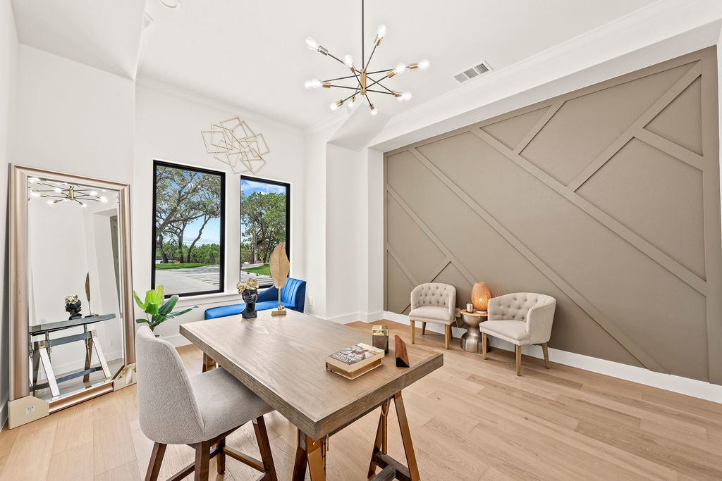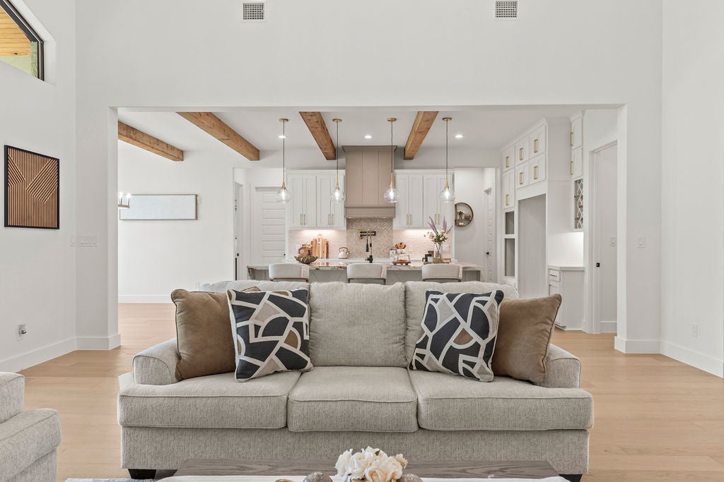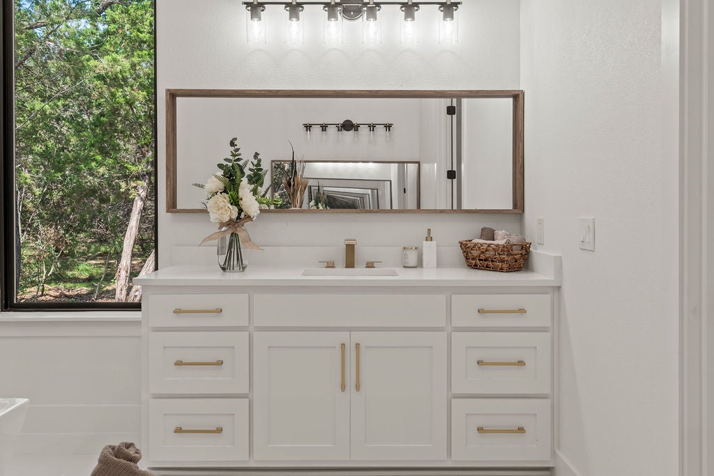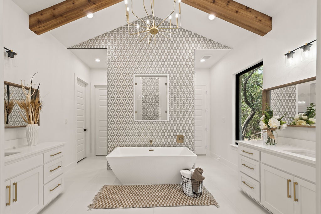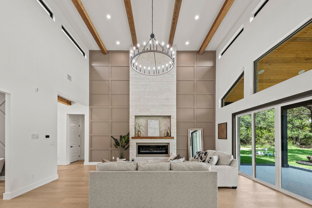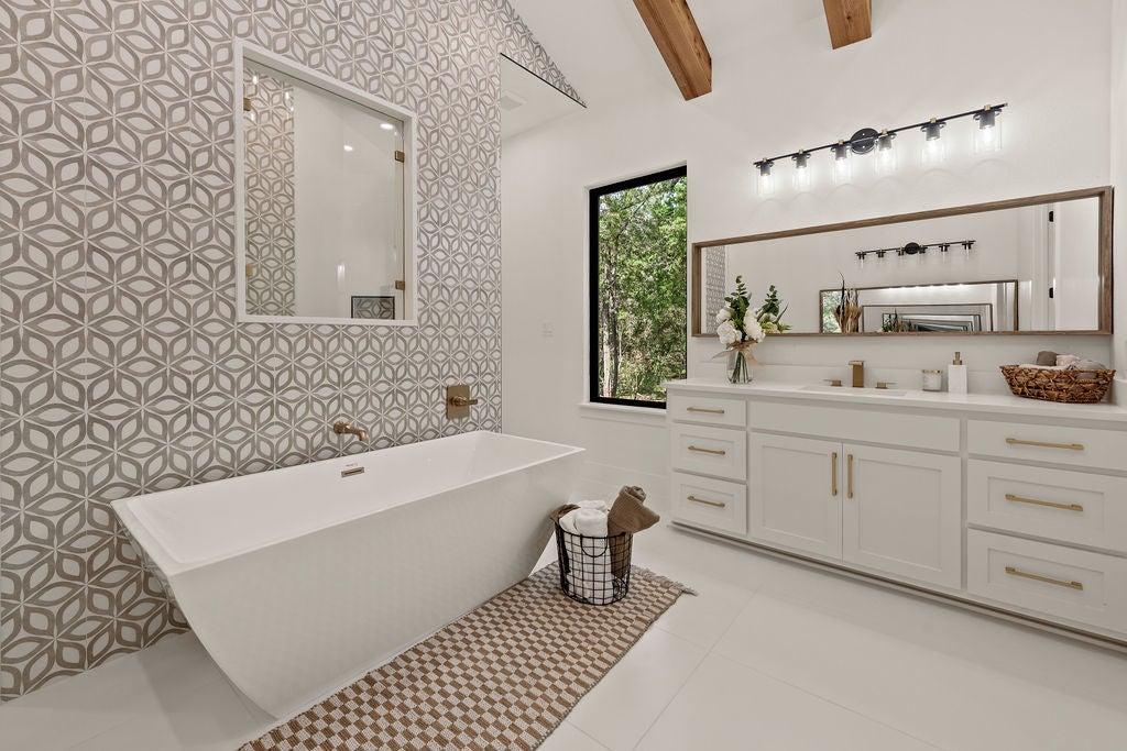 Masterful design meets modern luxury in this one-of-a-kind home crafted by ACH Homes. A true show-stopper, this stunning residence features sleek, contemporary finishes and bold geometric-inspired design elements throughout—delivering exceptional style and sophistication at every turn. The front of the property features stunning limestone masonry, lush landscaping, and a modern circular driveway that adorns this 0.56-acre lot. The living area is bright and open, with exposed beams, high ceilings, and a stunning fireplace. Many windows offer a view of the Hill Country sunsets. You have an elegant dining room. Perfect for entertaining. This gourmet kitchen is designed to impress even the most discerning chef. Cedar wood beams and gold hardware bring warmth and elegance to the space, a marble island, a built-in oven and microwave, pendant lighting, and a sleek pot filler above the cooktop. A spacious walk-in pantry provides storage, and the built-in wine rack adds a touch of sophistication. Thoughtfully designed to accommodate a Sub-Zero refrigerator, this kitchen strikes a balance between beauty and practicality. Your spacious primary is spacious and serene. Wood beams and an accent wall lend this space an elegant feel. French doors lead you to a stunning ensuite with gold accents. It has a large walk-in shower, a Picturesque window, his/her vanities, a water closet, a soaking tub with a gorgeous tile accent wall, and a WIC. Feel like you're stepping into a spa every time you walk into this exquisite space. Two additional bathrooms and baths are spacious and bright. When it is time to relax, venture out to the expansive covered patio. Entertain in style in this space. It is located a short distance from Canyon Lake and Yogi Bear's Jellystone Park. Rent tubes to float down the river, jet ski on the lake, hike the various trails near the home, browse the boutique shops in town, be close to main roads, do lake activities, Wimberley shopping, San Antonio, and more.
