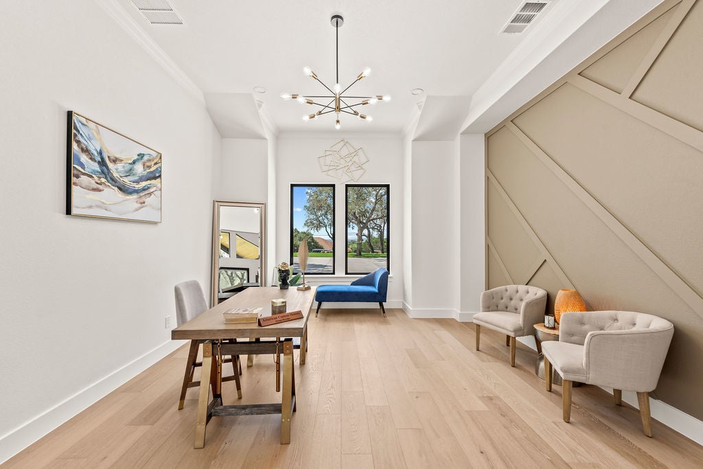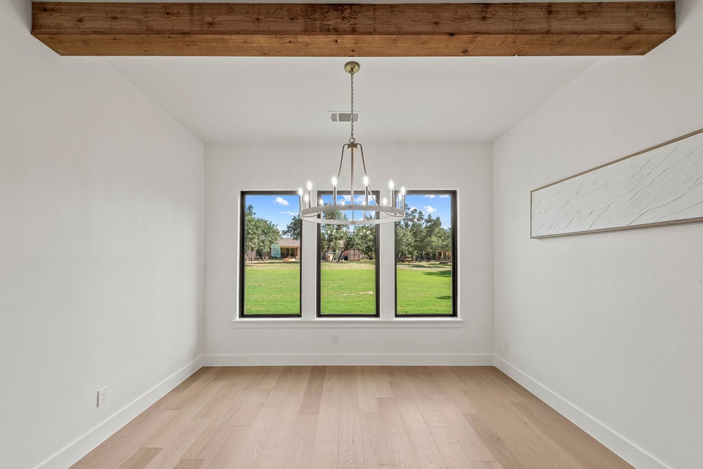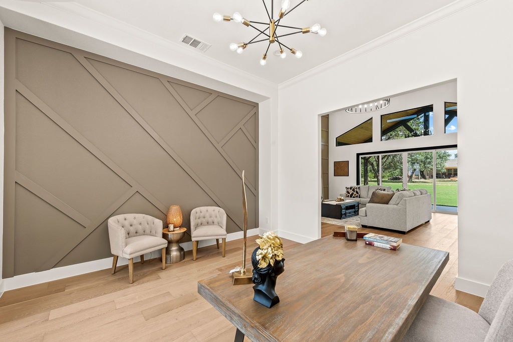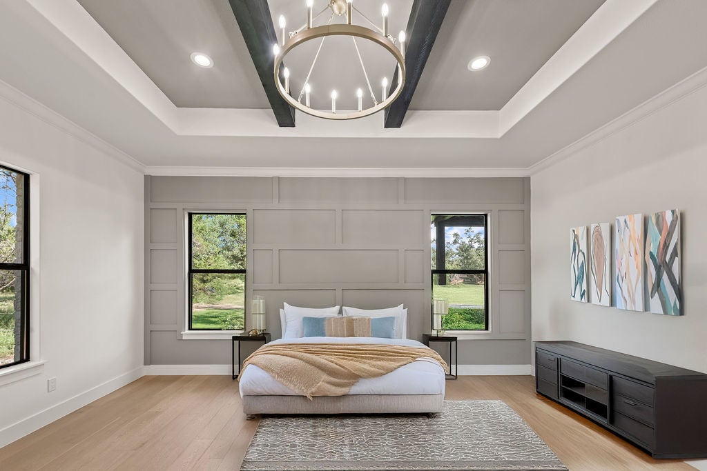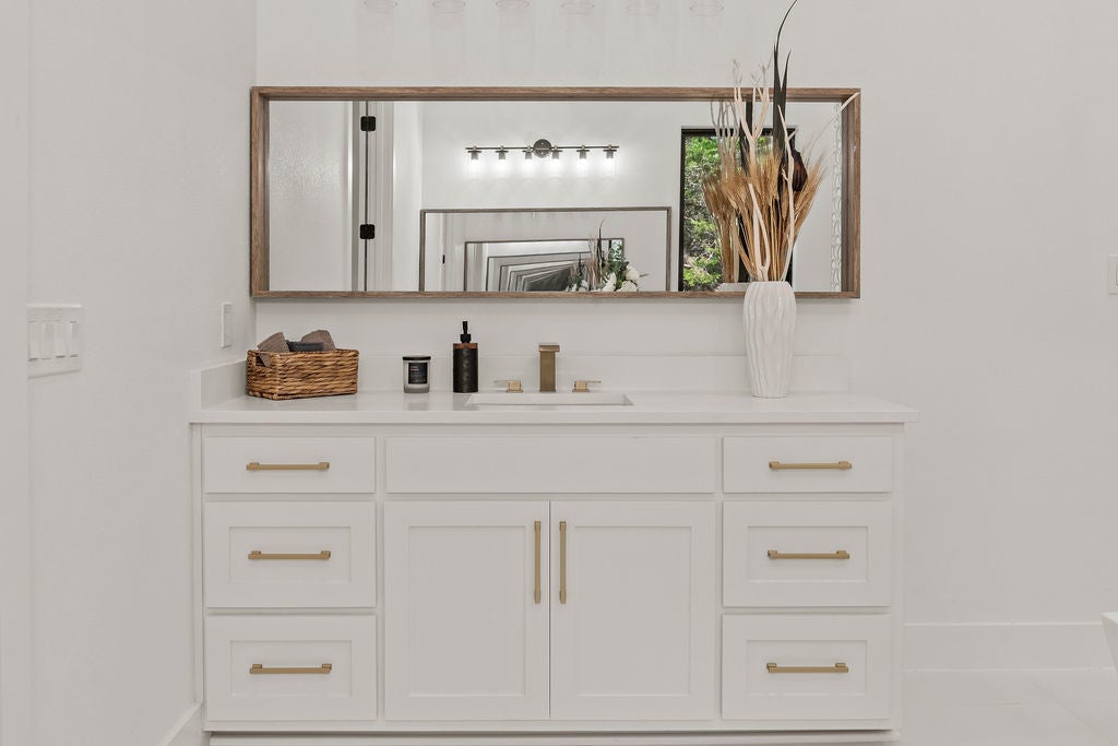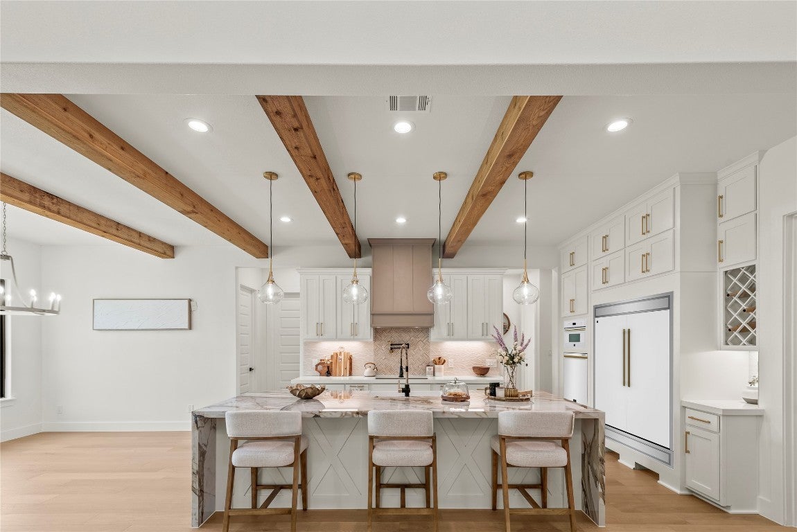 Masterful design meets modern luxury in this one-of-a-kind home crafted by ACH Homes. A true show-stopper, this stunning residence features sleek, contemporary finishes and bold geometric-inspired design elements throughout—delivering exceptional style and sophistication at every turn. The front of the property features stunning limestone masonry, lush landscaping, and a modern circular driveway that adorns this 0.56-acre lot. The living area is bright and open, with exposed beams, high ceilings, and a stunning fireplace. Many windows offer a view of the Hill Country sunsets. You have an elegant dining room. Perfect for entertaining. This gourmet kitchen is designed to impress even the most discerning chef. Cedar wood beams and gold hardware bring warmth and elegance to the space, a marble island, a built-in oven and microwave, pendant lighting, and a sleek pot filler above the cooktop. A spacious walk-in pantry provides storage, and the built-in wine rack adds a touch of sophistication. Thoughtfully designed to accommodate a Sub-Zero refrigerator, this kitchen strikes a balance between beauty and practicality. Your spacious primary is spacious and serene. Wood beams and an accent wall lend this space an elegant feel. French doors lead you to a stunning ensuite with gold accents. It has a large walk-in shower, a Picturesque window, his/her vanities, a water closet, a soaking tub with a gorgeous tile accent wall, and a WIC. Feel like you're stepping into a spa every time you walk into this exquisite space. Two additional bathrooms and baths are spacious and bright. When it is time to relax, venture out to the expansive covered patio. Entertain in style in this space. It is located a short distance from Canyon Lake and Yogi Bear's Jellystone Park. Rent tubes to float down the river, jet ski on the lake, hike the various trails near the home, browse the boutique shops in town, be close to main roads, do lake activities, Wimberley shopping, San Antonio, and more.