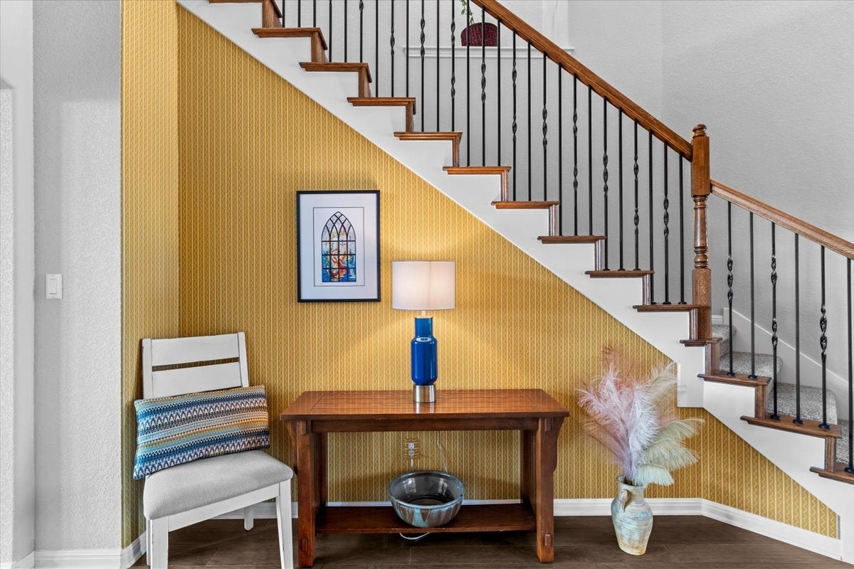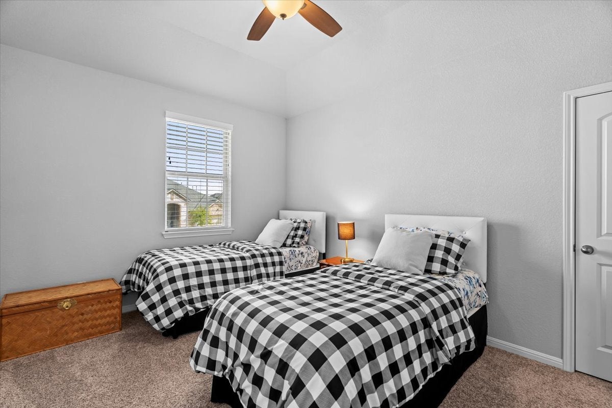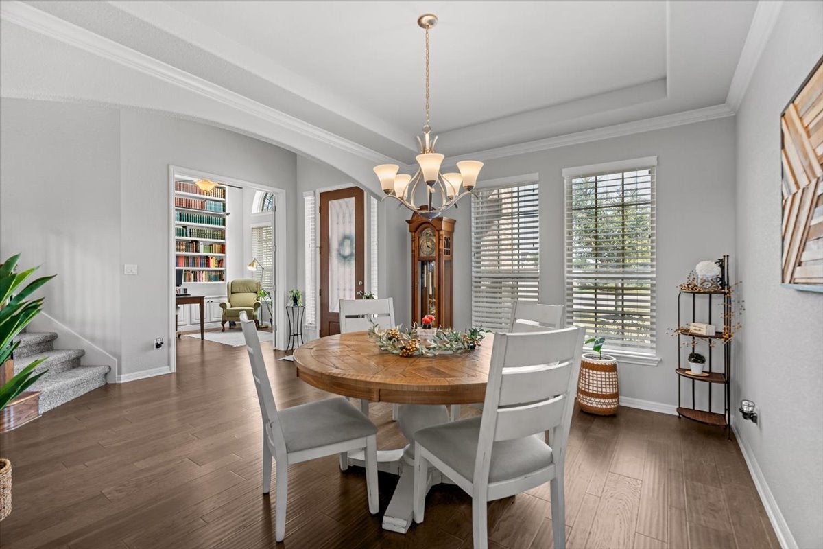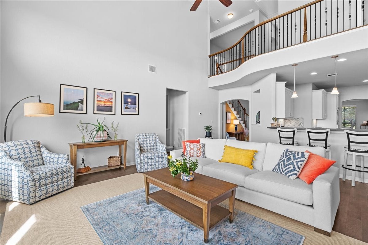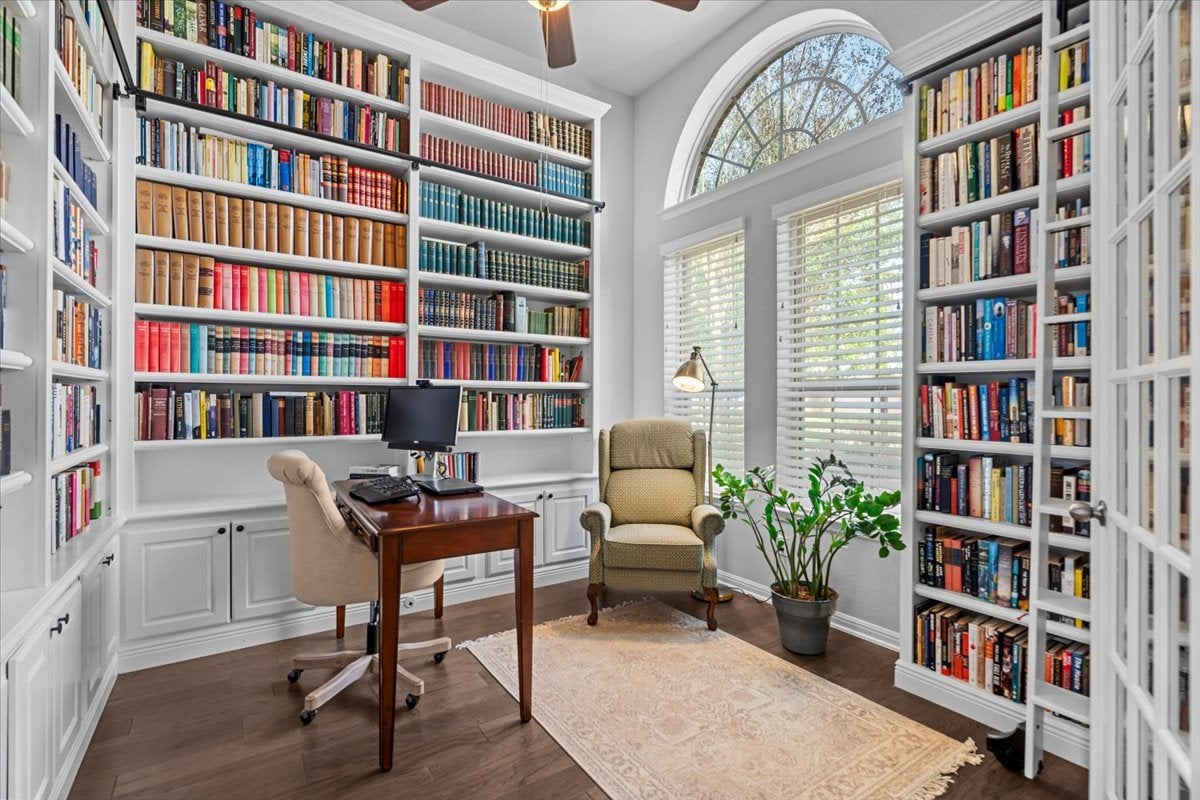 Perched along a rolling hills with no rear neighbors, this exceptional home in Crystal Falls offers 3,373 square feet of refined Hill Country living, where uninterrupted views, mature trees, and golden Texas sunsets create a backdrop few homes can match. Inside, soaring ceilings and expansive windows flood the living spaces with natural light, framing serene views of the landscape beyond. The open-concept design flows effortlessly from the living room into a spacious kitchen anchored by a large center island, perfect for both everyday living and entertaining. A true standout feature is the first-floor private library/Office, showcasing floor-to-ceiling custom bookshelves handcrafted by European artisans from France and Germany, complete with a rolling ladder and built-in storage—an inspiring space for work, reading, or quiet retreat. The main-level primary suite offers a peaceful escape with direct greenbelt views, a spacious layout, and a well-appointed en-suite bath featuring dual vanities, a soaking tub, and a walk-in shower. Upstairs, generously sized secondary bedrooms and a versatile bonus room provide flexibility for a variety of lifestyles. Step outside to the covered patio and experience true privacy, with a backyard that opens directly to the greenbelt, no rear neighbors, just open space, nature, and endless sky. Located in the highly sought-after Crystal Falls community, residents enjoy access to resort-style amenities including pools, golf, trails, parks, and top-rated Leander ISD schools, all just minutes from 183A, shopping, and dining.