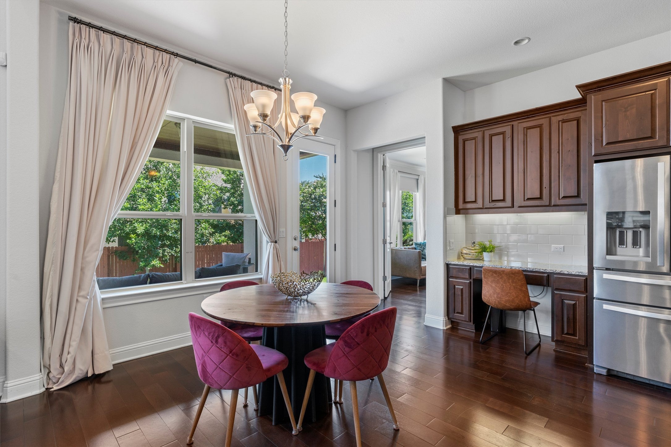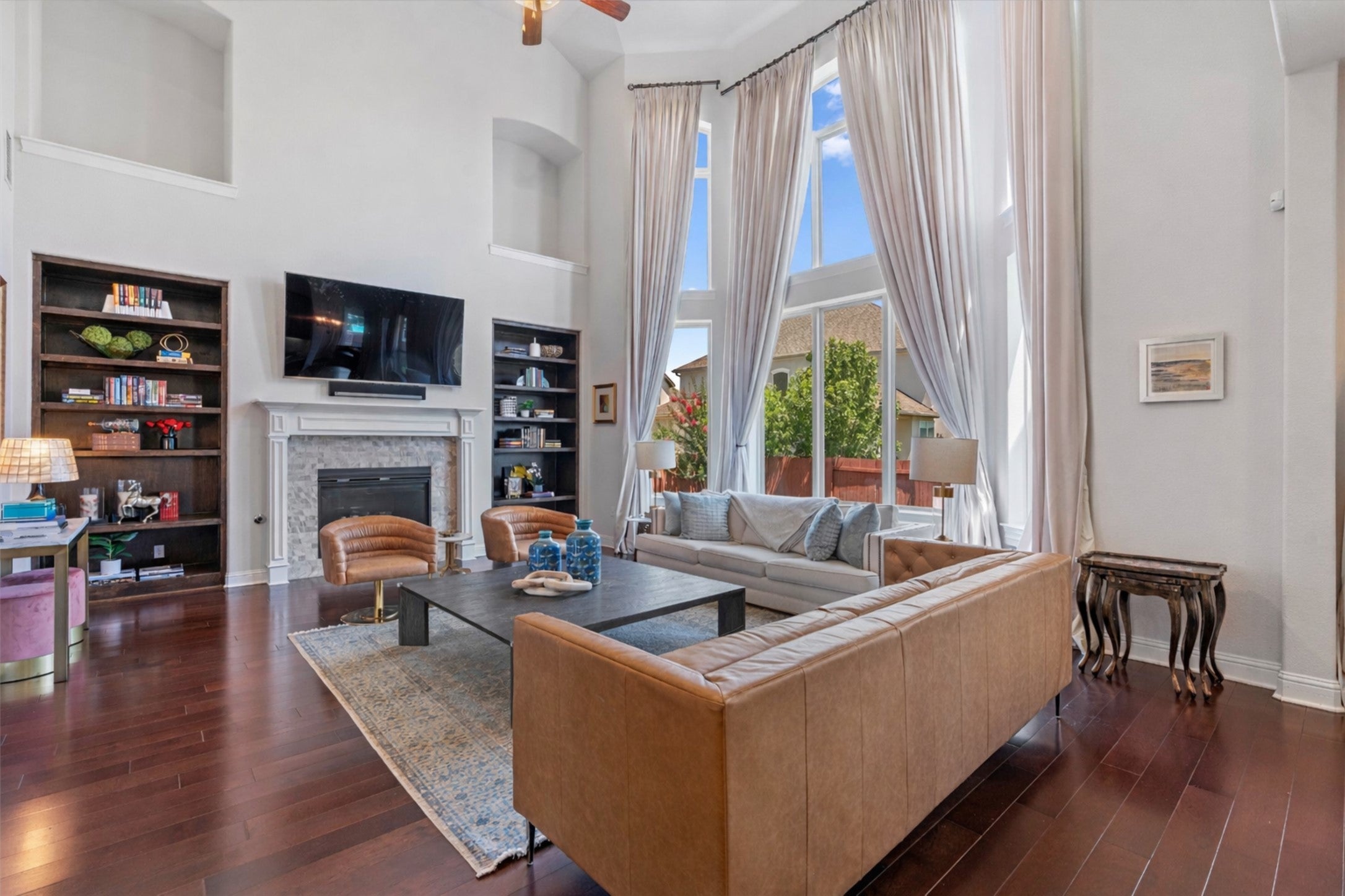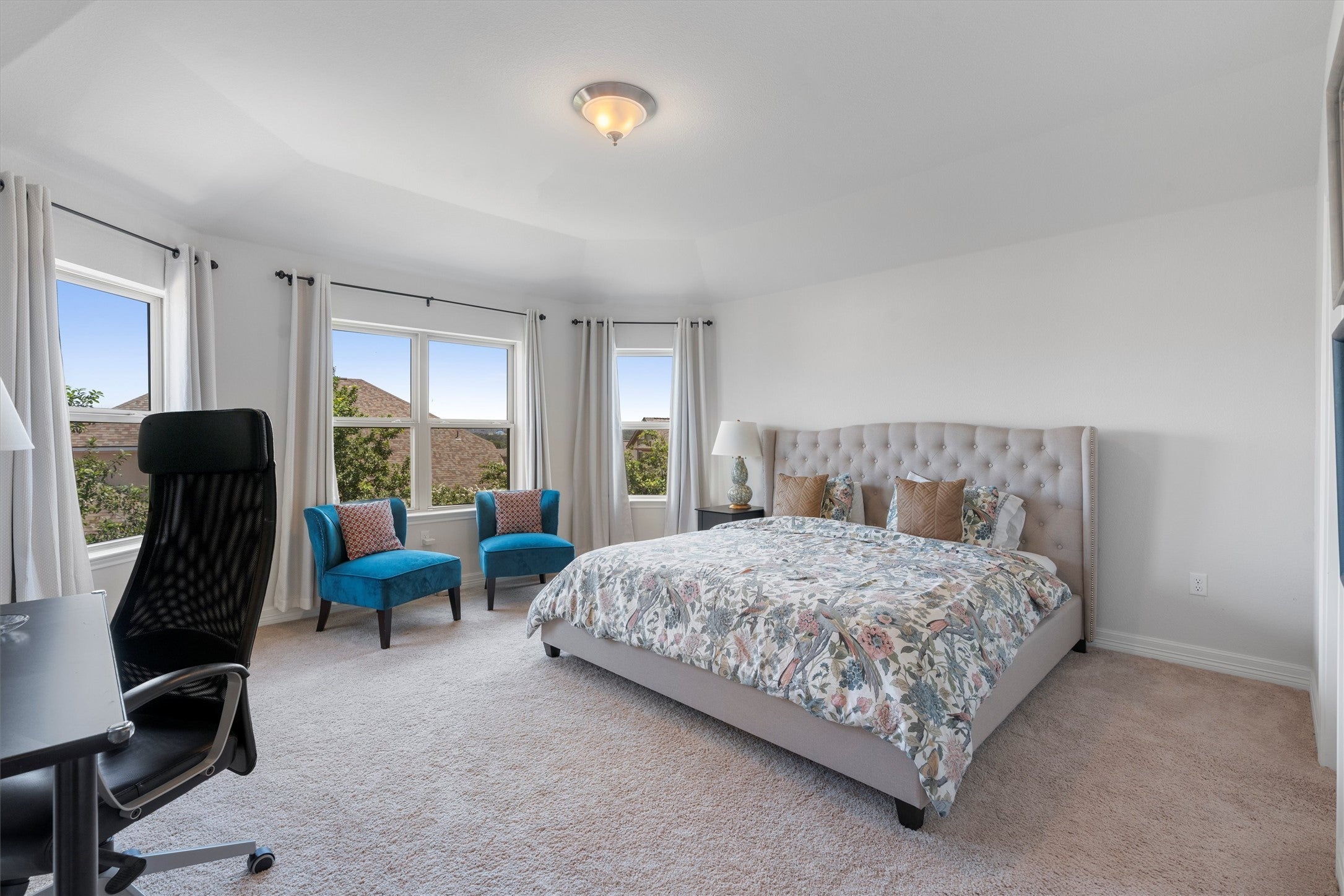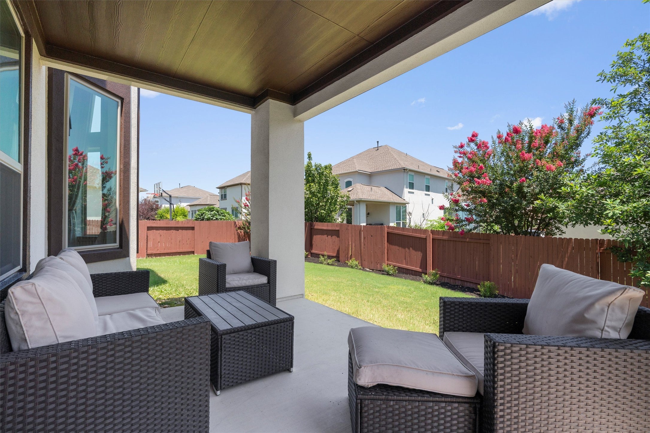Located on a quiet cul-de-sac in the Sarita Valley community, this luxurious & extremely spacious home offers unmatched flexibility with everything you could want & more. Featuring 5 bedrooms, 4.5 bathrooms, a dining room, office, loft, & media room, this home is also zoned to the award-winning Leander ISD. Step inside and be welcomed by a charming curved staircase, & an open floor plan with soaring ceilings & premium finishes throughout. The expansive living room is filled with natural light from floor-to-ceiling windows & centers around a fireplace flanked by custom built-in shelving. The kitchen features granite countertops, a large island with storage on both sides, dark-stained wood cabinetry with convenient pullout drawers, stainless steel appliances, & a pantry. A breakfast nook offers a spot for casual meals, while the formal dining room is perfect for hosting. A dedicated office at the front of the home provides a quiet workspace, & a guest bedroom with its own ensuite bath is located on the main level. The spacious primary suite is a private retreat featuring a tray ceiling, bay window, & a luxurious ensuite bath with oversized dual vanities, a large soaking tub, walk-in shower, & a generous walk-in closet. Upstairs, you’ll find a large flex space, an oversized media room perfect for movie nights, & three additional bedrooms—each with their own closets. One bedroom features a private ensuite bath, while the other two share a well-appointed full bathroom. Step outside to the fenced backyard and relax in the large patio. The garage includes epoxy flooring & is wired for electric vehicle charging. Residents of Sarita Valley enjoy exceptional community amenities including an amenity center overlooking a scenic pond, & a pool with cabana. Ideally located minutes from abundant shopping, dining, and outdoor recreation, including HEB, Costco, Garey Park, and the Sarita Valley Greenbelt, with easy access to Hwy 183 for commuting to North Austin and downtown.
