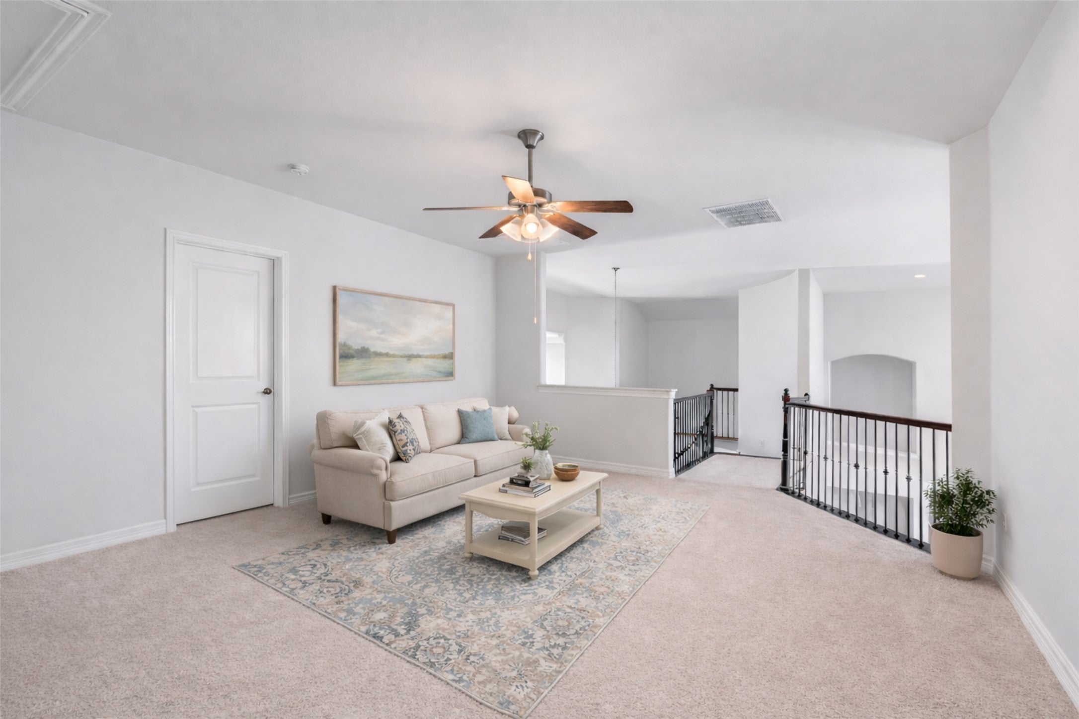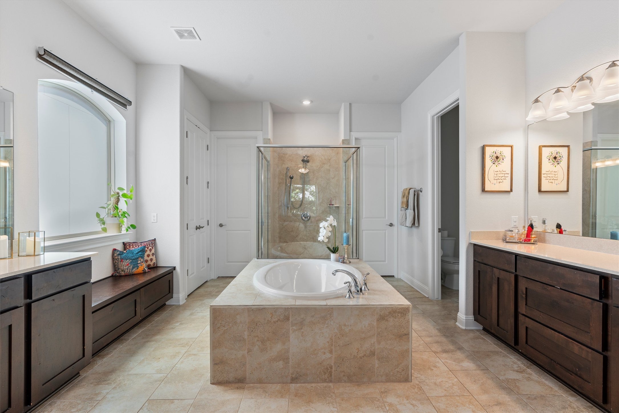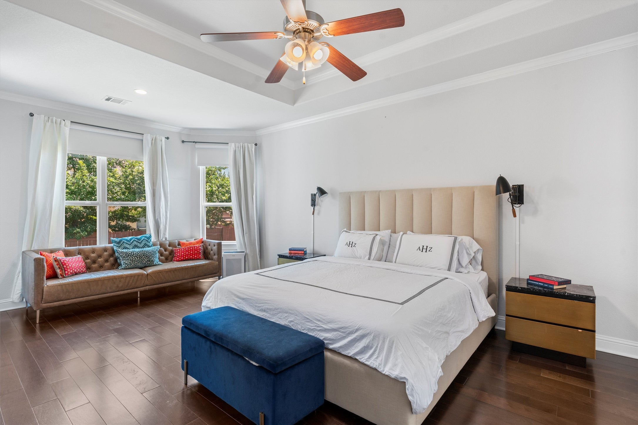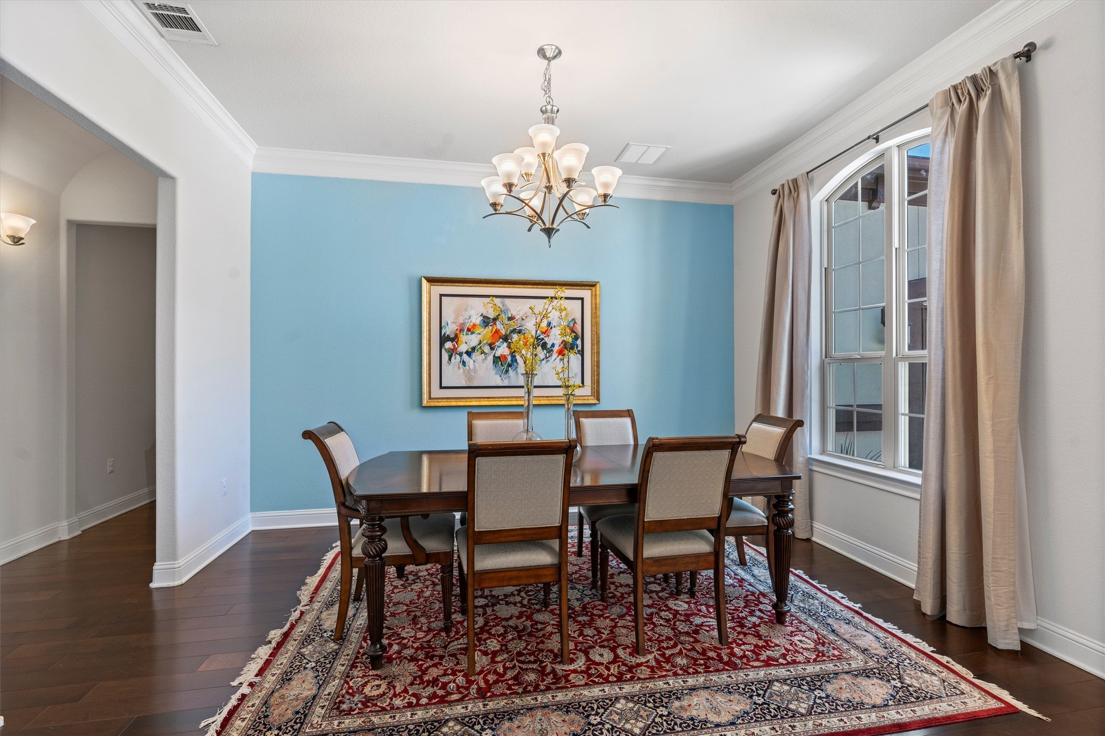 Located on a quiet cul-de-sac in the Sarita Valley community, this luxurious & extremely spacious home offers unmatched flexibility with everything you could want & more. Featuring 5 bedrooms, 4.5 bathrooms, a dining room, office, loft, & media room, this home is also zoned to the award-winning Leander ISD. Step inside and be welcomed by a charming curved staircase, & an open floor plan with soaring ceilings & premium finishes throughout. The expansive living room is filled with natural light from floor-to-ceiling windows & centers around a fireplace flanked by custom built-in shelving. The kitchen features granite countertops, a large island with storage on both sides, dark-stained wood cabinetry with convenient pullout drawers, stainless steel appliances, & a pantry. A breakfast nook offers a spot for casual meals, while the formal dining room is perfect for hosting. A dedicated office at the front of the home provides a quiet workspace, & a guest bedroom with its own ensuite bath is located on the main level. The spacious primary suite is a private retreat featuring a tray ceiling, bay window, & a luxurious ensuite bath with oversized dual vanities, a large soaking tub, walk-in shower, & a generous walk-in closet. Upstairs, you’ll find a large flex space, an oversized media room perfect for movie nights, & three additional bedrooms—each with their own closets. One bedroom features a private ensuite bath, while the other two share a well-appointed full bathroom. Step outside to the fenced backyard and relax in the large patio. The garage includes epoxy flooring & is wired for electric vehicle charging. Residents of Sarita Valley enjoy exceptional community amenities including an amenity center overlooking a scenic pond, & a pool with cabana. Ideally located minutes from abundant shopping, dining, and outdoor recreation, including HEB, Costco, Garey Park, and the Sarita Valley Greenbelt, with easy access to Hwy 183 for commuting to North Austin and downtown.