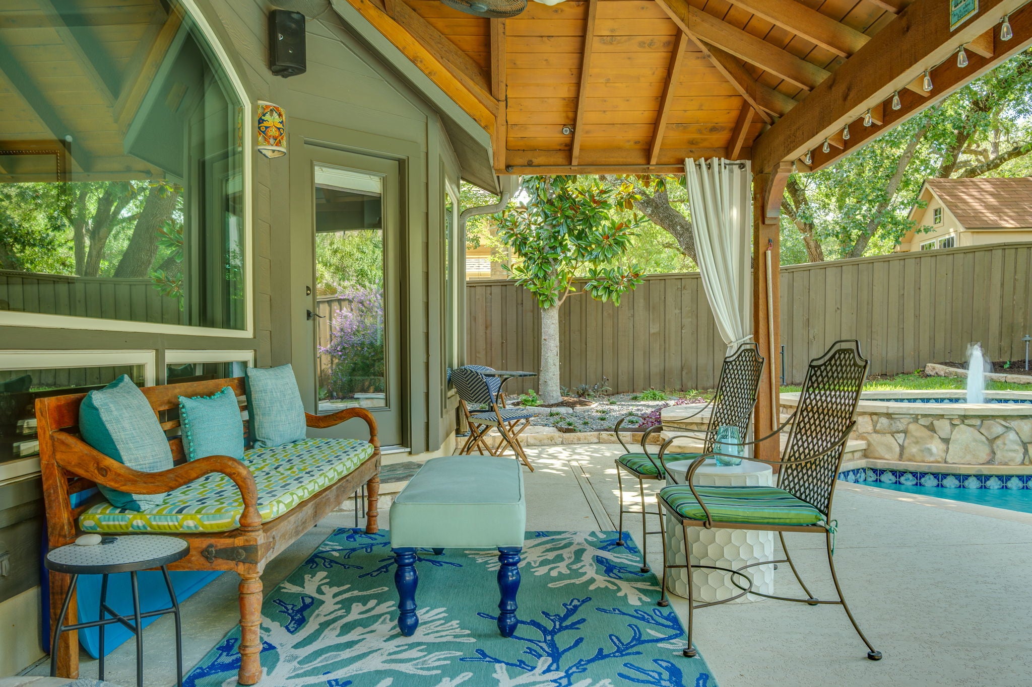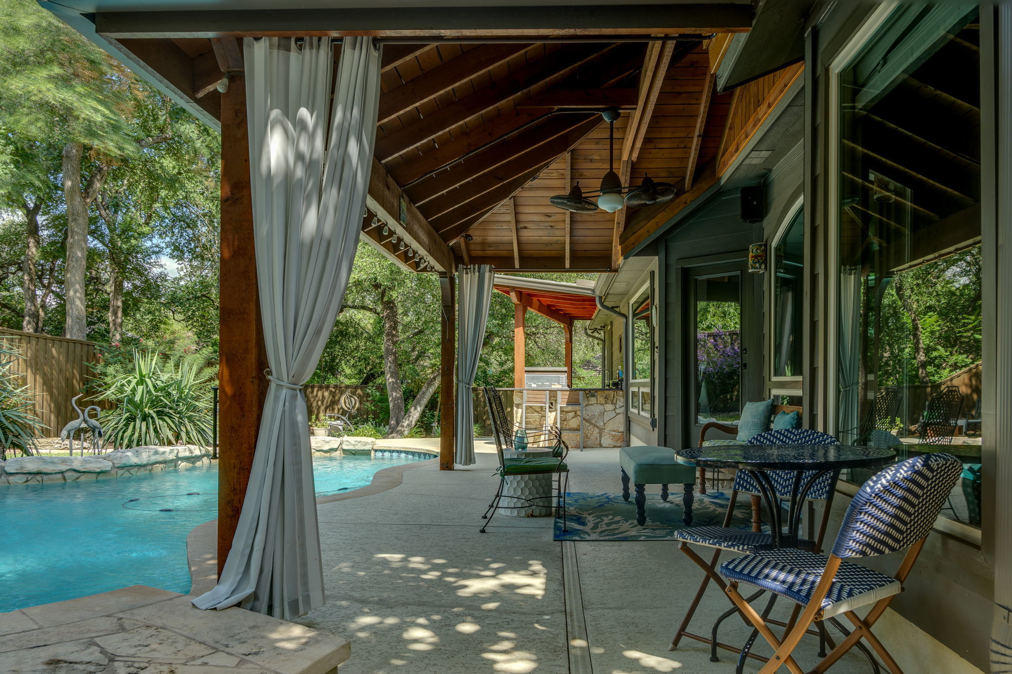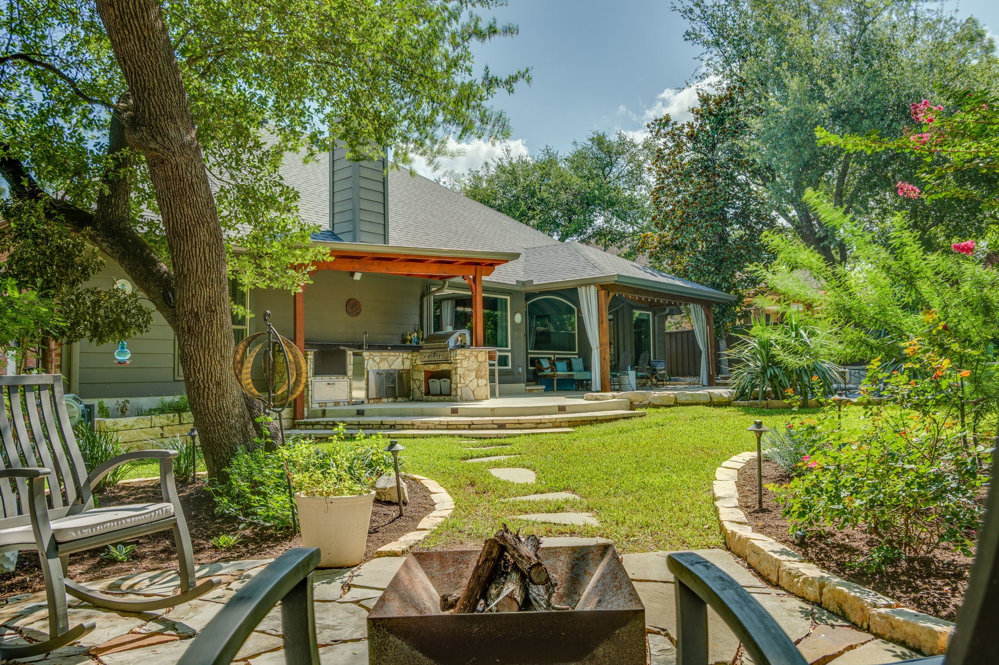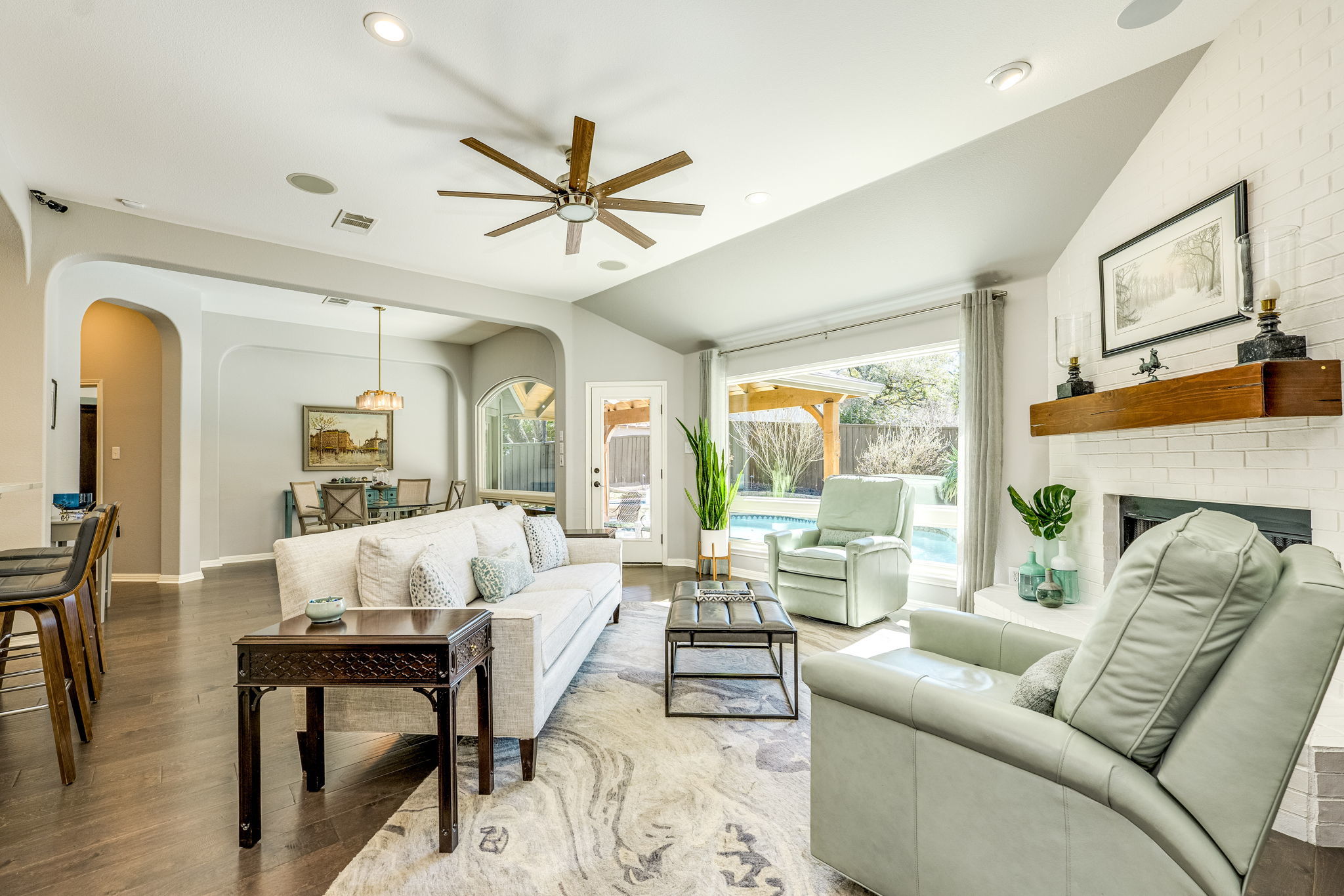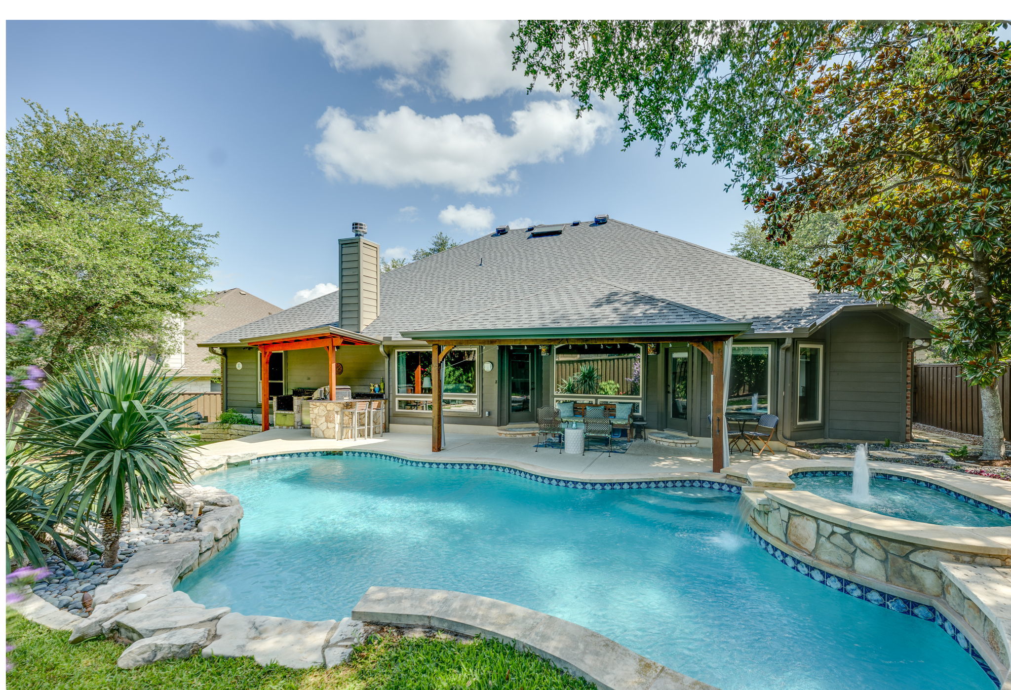 Located in the highly regarded Leander ISD and feeding into award-winning Vandegrift High School.This rare one-story home offers a three-car garage, heated pool and spa, comprising exceptional indoor-outdoor living in a charming neighborhood adjacent to Balconies Preserve. All just moments away from shopping and dining. From the moment you arrive, the home impresses with its large front porch and stunning metal-and-glass front door, leading into a wide, open entry. Inside, hardwood floors flow throughout the home, complementing the open floor plan and abundant natural light provided by a kitchen skylight and large picture windows. Andersen windows further enhance the bright, airy feel throughout and provide the ultimate in energy efficiency. The heart of the home is the beautifully appointed kitchen, featuring excellent storage, counter-depth Thermidor cabinet-front refrigerator, Boos Block island top, under-counter wine fridge, gas range, and a 2025 KitchenAid oven with built-in air fry and convection. The living area is warm and inviting with a gas fireplace, updated light fixtures and ceiling fans, and surround sound speakers. Built-in full-wall bookshelves with cabinet storage below add both character and function to the front office.The updated bathrooms are thoughtfully designed, and comfort is maximized with two-zone heating and Nest thermostats. Step outside to a private backyard oasis designed for both relaxation and entertaining.Enjoy the heated pool and spa, or host gatherings in the covered outdoor kitchen complete with outdoor speakers, a sink, and built-in gas grill.The backyard also features a slate paver fire pit retreat and an additional covered social seating space, creating multiple inviting areas to relax or entertain.The front and back yards are professionally landscaped, with automatic landscape lighting, creating a stunning evening ambiance.This Grandview Hills home is a perfect place to live, relax, and enjoy the best of Hill Country living.