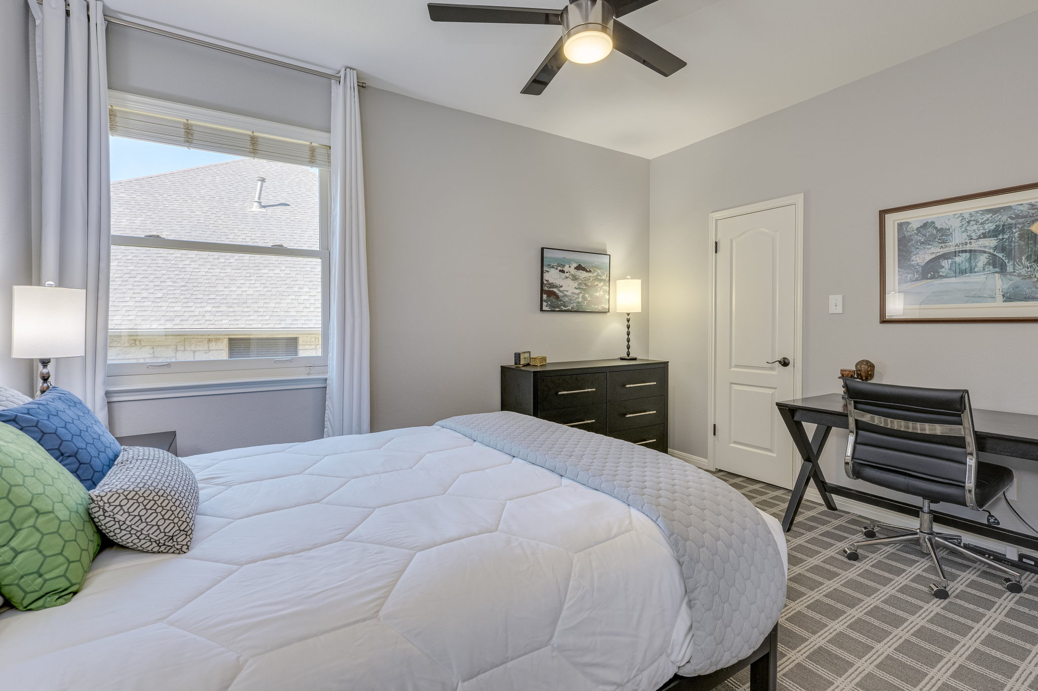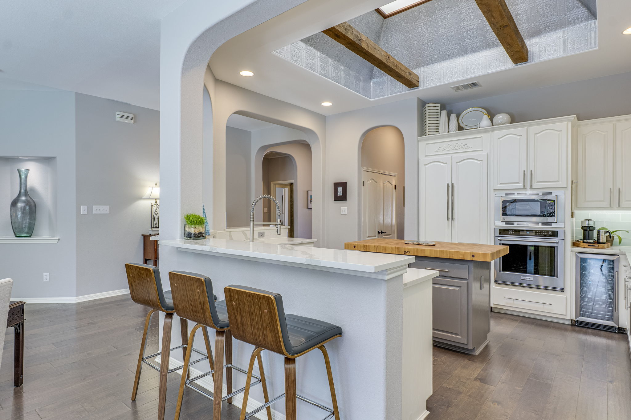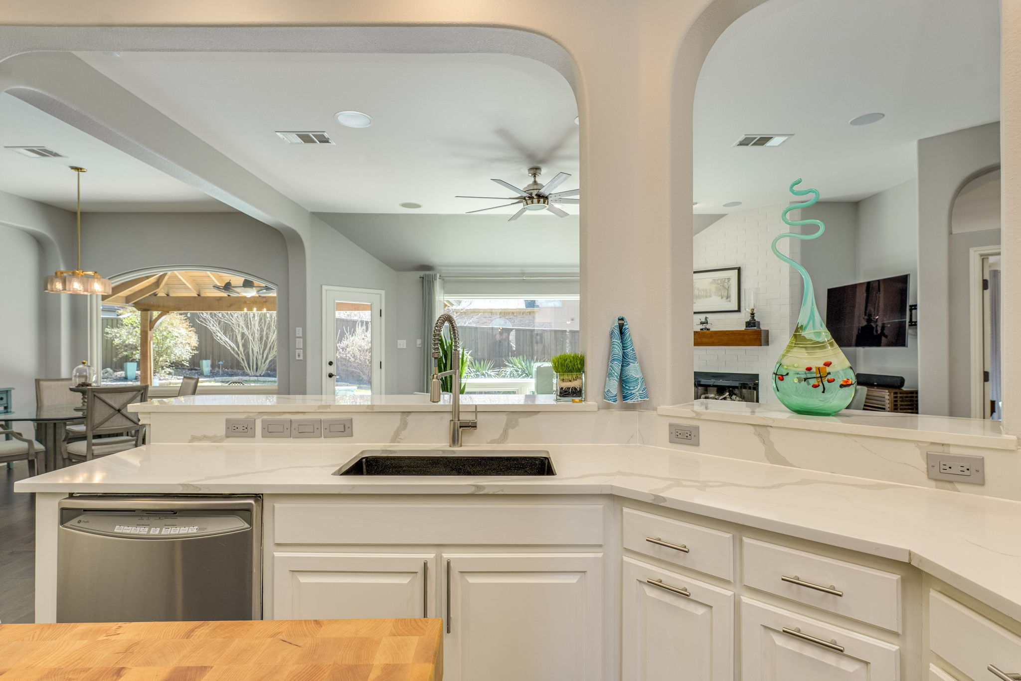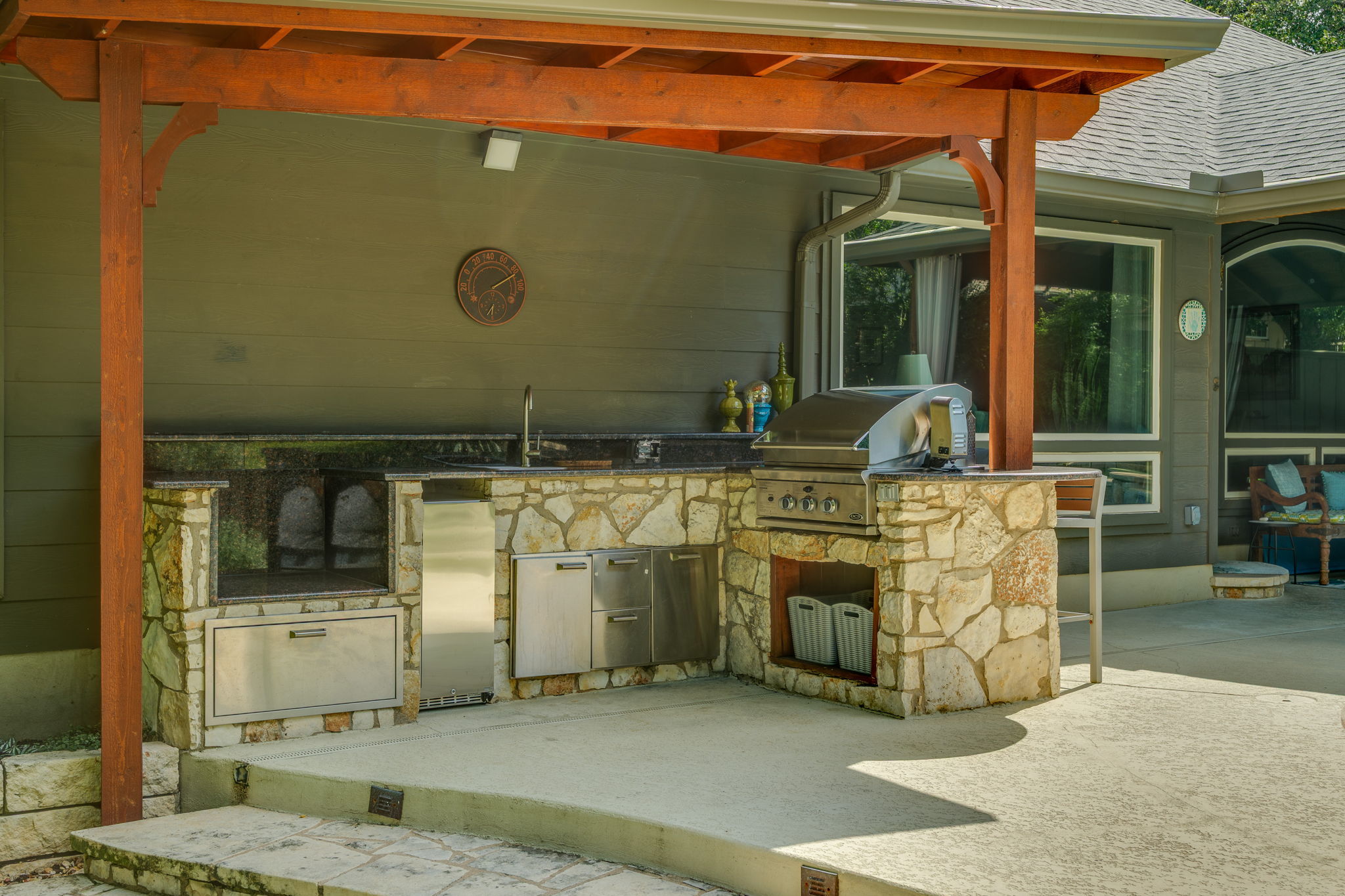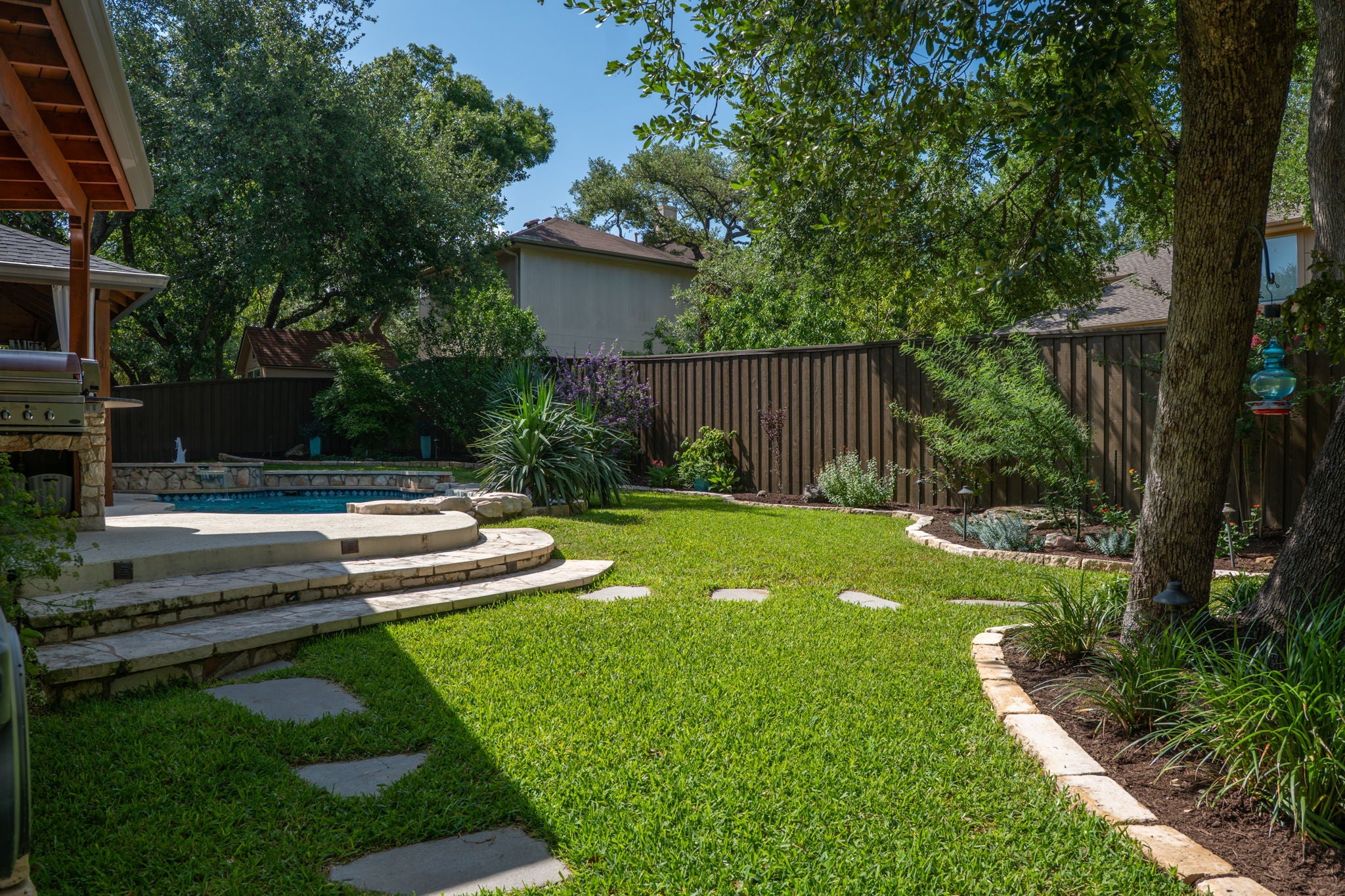 Located in the highly regarded Leander ISD and feeding into award-winning Vandegrift High School.This rare one-story home offers a three-car garage, heated pool and spa, comprising exceptional indoor-outdoor living in a charming neighborhood adjacent to Balconies Preserve. All just moments away from shopping and dining. From the moment you arrive, the home impresses with its large front porch and stunning metal-and-glass front door, leading into a wide, open entry. Inside, hardwood floors flow throughout the home, complementing the open floor plan and abundant natural light provided by a kitchen skylight and large picture windows. Andersen windows further enhance the bright, airy feel throughout and provide the ultimate in energy efficiency. The heart of the home is the beautifully appointed kitchen, featuring excellent storage, counter-depth Thermidor cabinet-front refrigerator, Boos Block island top, under-counter wine fridge, gas range, and a 2025 KitchenAid oven with built-in air fry and convection. The living area is warm and inviting with a gas fireplace, updated light fixtures and ceiling fans, and surround sound speakers. Built-in full-wall bookshelves with cabinet storage below add both character and function to the front office.The updated bathrooms are thoughtfully designed, and comfort is maximized with two-zone heating and Nest thermostats. Step outside to a private backyard oasis designed for both relaxation and entertaining.Enjoy the heated pool and spa, or host gatherings in the covered outdoor kitchen complete with outdoor speakers, a sink, and built-in gas grill.The backyard also features a slate paver fire pit retreat and an additional covered social seating space, creating multiple inviting areas to relax or entertain.The front and back yards are professionally landscaped, with automatic landscape lighting, creating a stunning evening ambiance.This Grandview Hills home is a perfect place to live, relax, and enjoy the best of Hill Country living.