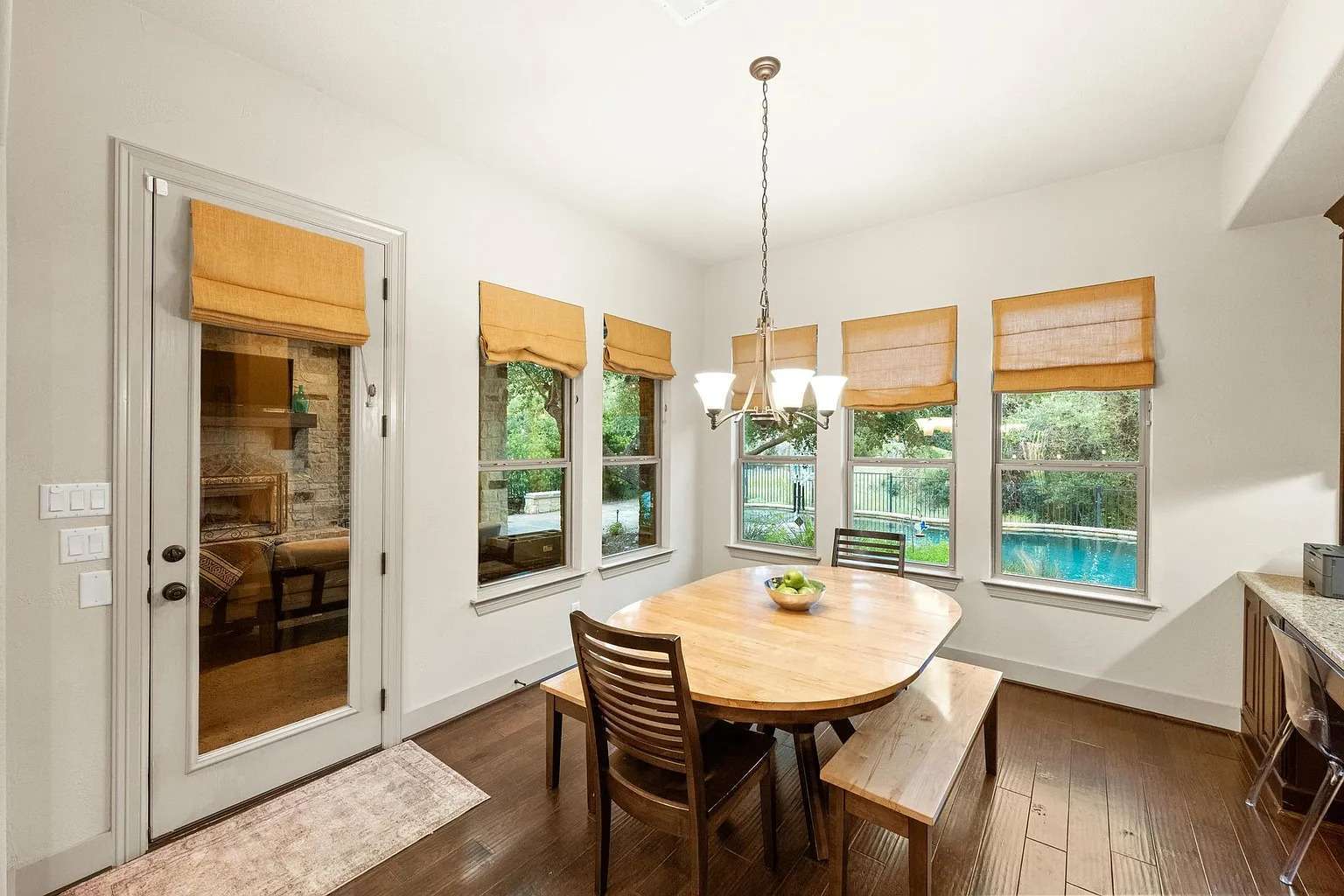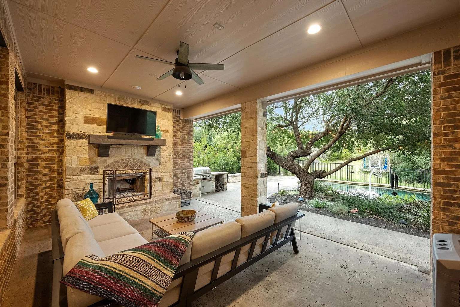 Nestled on open space with miles of trails right from your front door, 17309 Rush Pea Circle blends timeless architecture with the natural beauty of the Texas Hill Country. Native Texas landscaping surrounds the property, anchored by a breathtaking 200-year-old oak tree that creates shade, character, and a true sense of place. Inside, warmth and craftsmanship define the home. Rich wood floors, vaulted ceilings, and expansive living spaces create an airy yet inviting atmosphere. Brand-new pure wool carpet adds luxury and comfort underfoot, while a newly built attic storage space provides practical functionality. Major updates include a roof replaced in 2016, a recently replaced water heater, and a new refrigerator, giving peace of mind for years to come. A dedicated Tesla charger adds modern convenience without compromising the home’s classic style. Step outside and discover a backyard experience that’s nearly impossible to replicate today. The showstopping pool reaches an incredible 9 feet deep — a depth rarely permitted anymore — complete with a diving rock, waterfall feature, and a beach entry area for relaxed lounging. Entertain effortlessly with a built-in outdoor grill and fireplace, all set against the backdrop of protected open space for added privacy and sweeping views. Vaulted ceilings throughout the house crescendo in the living room with a limestone fireplace flanked by solid wood cabinetry. The home has been meticulously maintained in excellent condition. This is where timeless elegance meets Texas Hill Country soul — a home rooted in nature, designed for gathering, and built for living beautifully both inside and out.