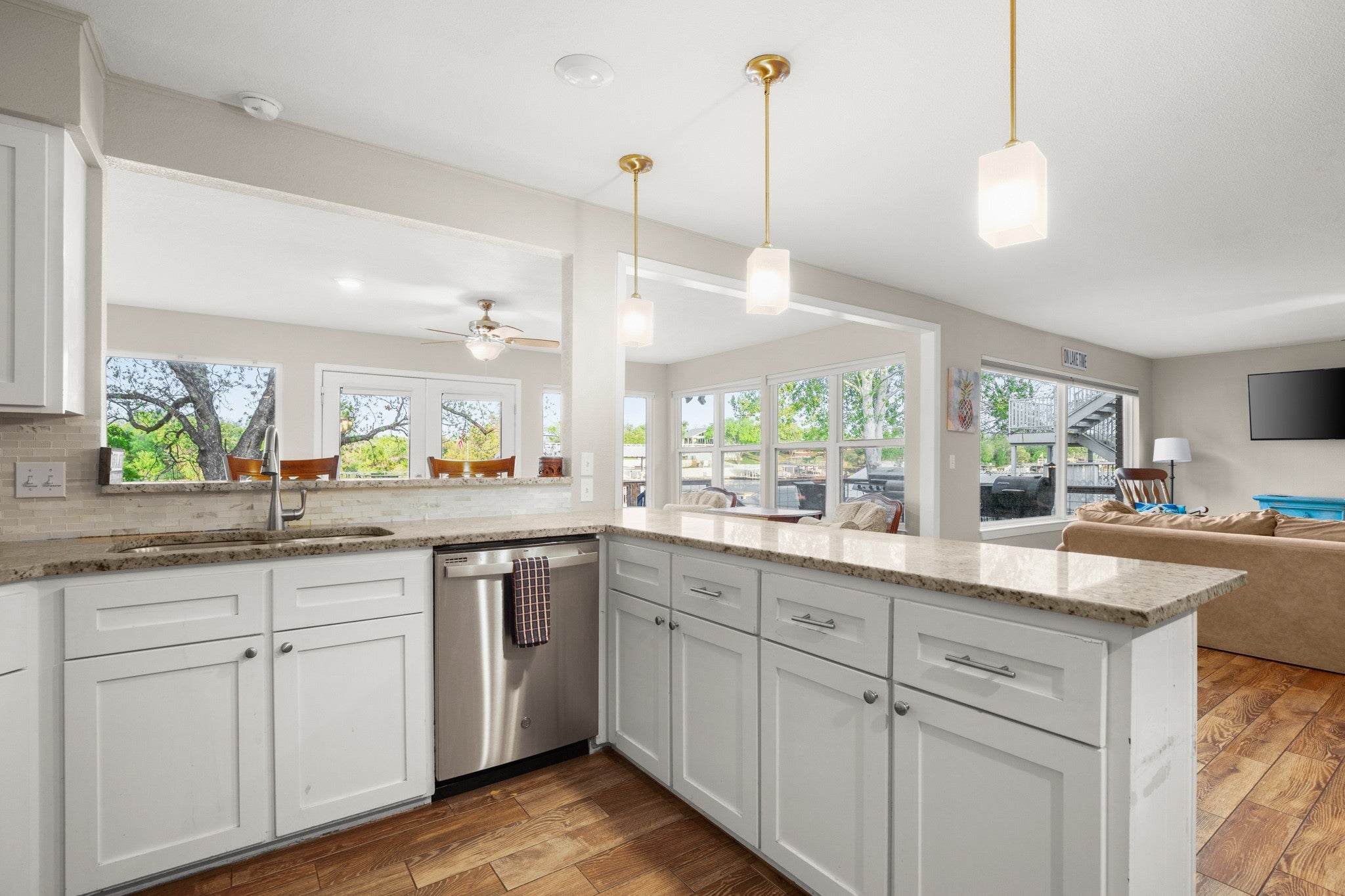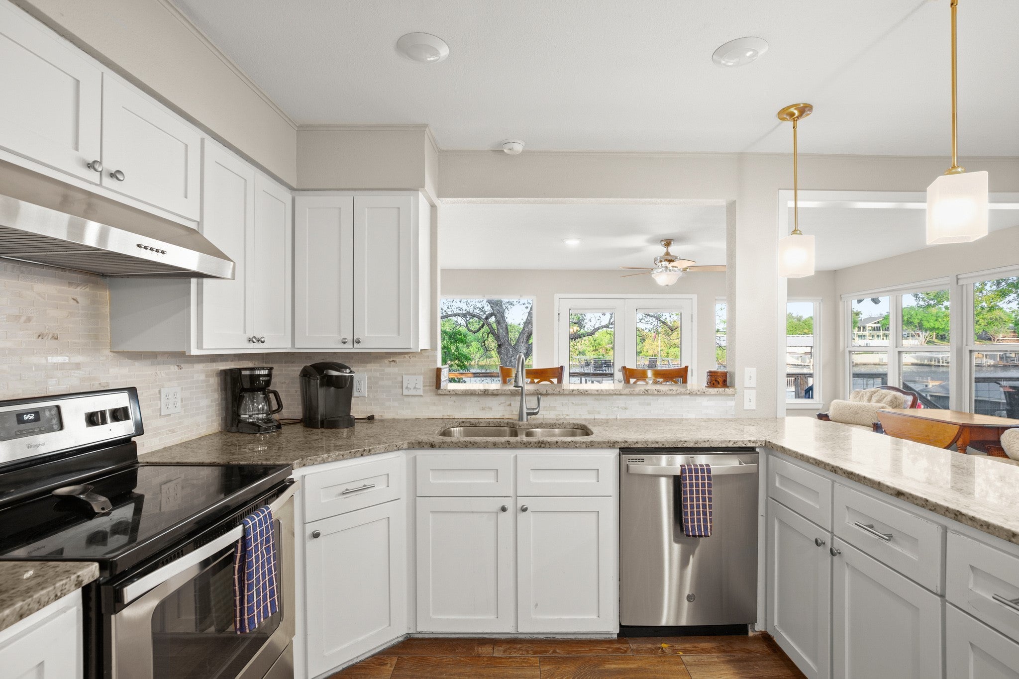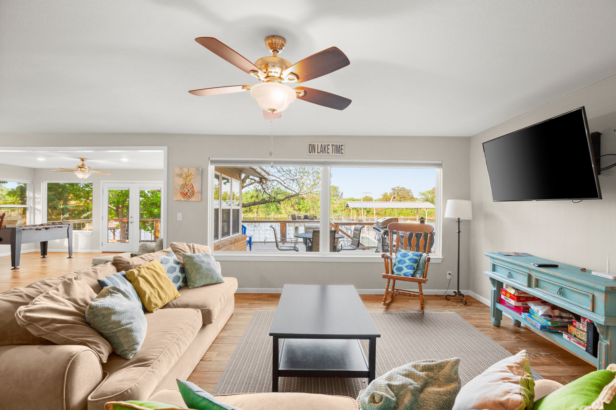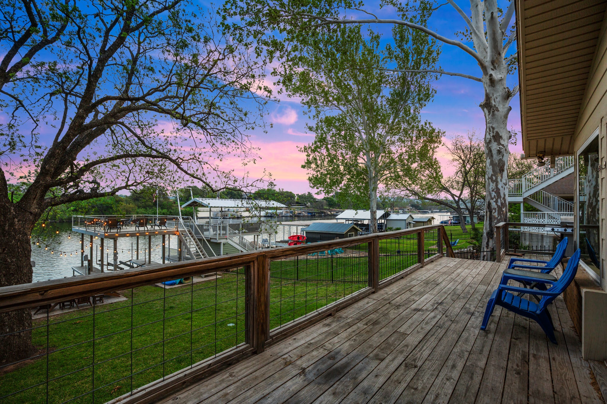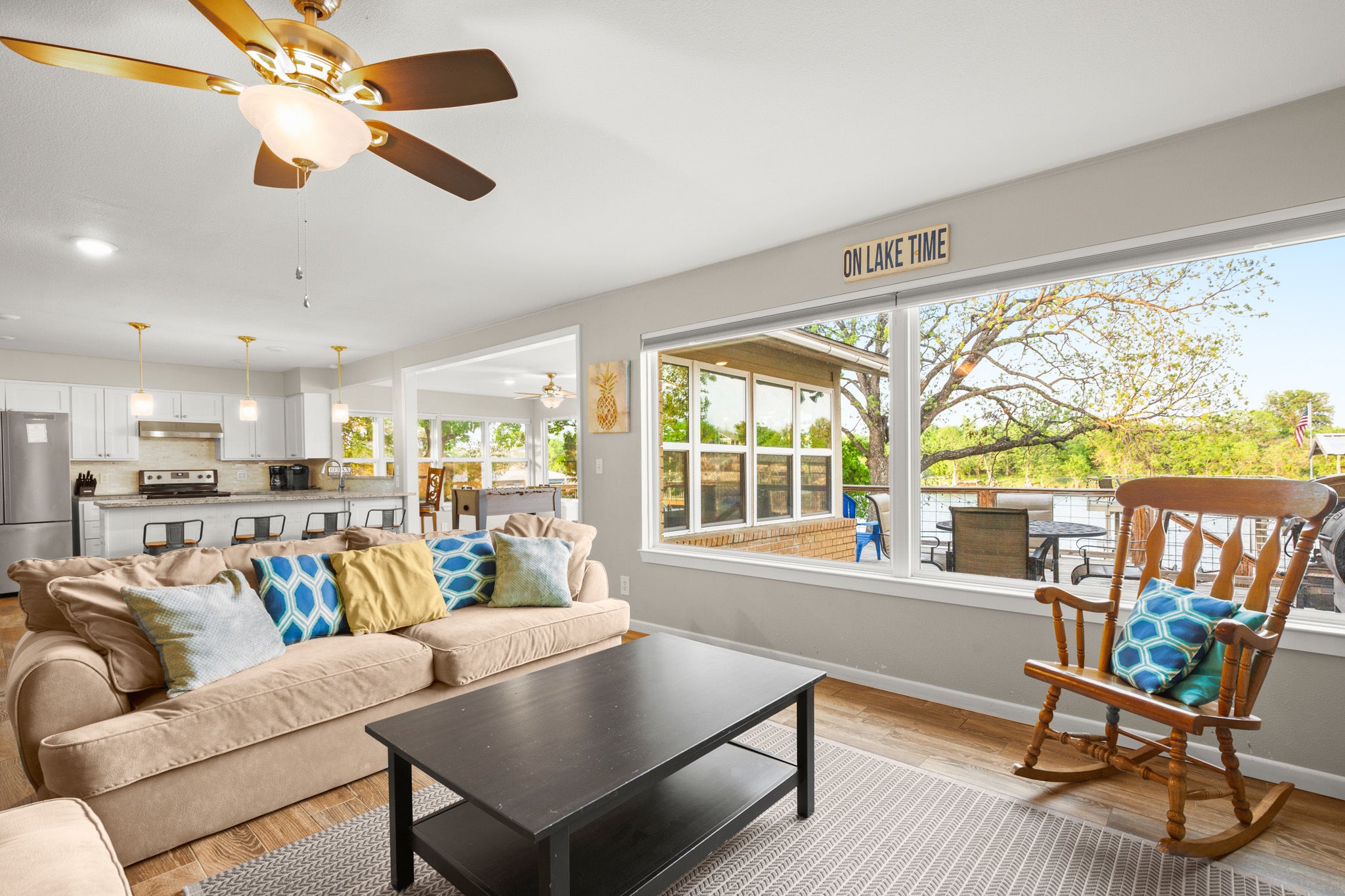 Experience the pinnacle of waterfront living on the constant-level Lake LBJ. Situated on the premier Upper Colorado Arm, this 2,208 sq. ft. retreat was completely renovated in 2017 and remained completely dry during the October 2018 flood. Boasting an open-concept layout with 3 bedrooms and 3 baths, the home features a massive bonus room, bringing the total sleep count to 12 in beds. The modern kitchen—complete with granite counters and stainless appliances—flows into a stunning indoor sun porch, the perfect spot for sunrise coffee over the water. Outside, the 50-foot bulkhead, jet ski ramp, and boat dock (both redone in 2017) sit on excellent deep water, providing year-round access for large boats and watercraft regardless of the season. This is a true "Plug & Play" opportunity: all furnishings, linens, and kitchenware convey. STR is allowed in the neighborhood, so you can continue the successful "Ski Shores" rental legacy or move right in for your first lake summer. Ample parking for 4+ vehicles and trailers.
