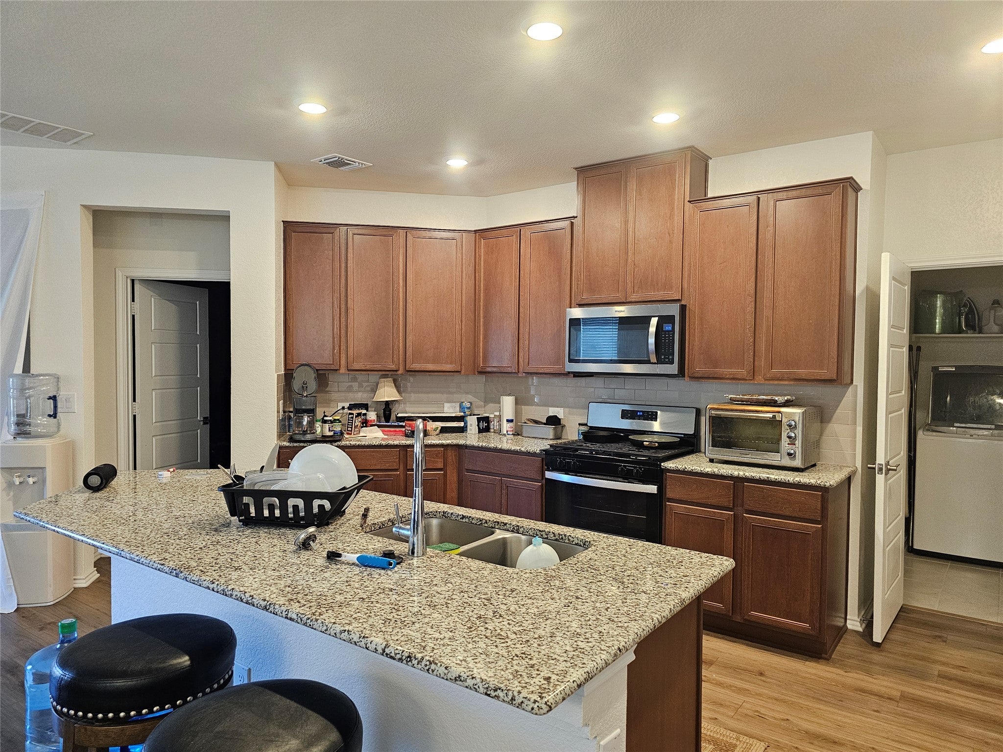 Great floorplan with 2 primary bedrooms, up downstairs off the kitchen and one upstairs off the gameroom area. Large open kitchen, dining and living area with access to covered patio and private back yard. Half bath downstairs off entry at front. Vinyl plank flooring downstairs except for downstairs bedroom.