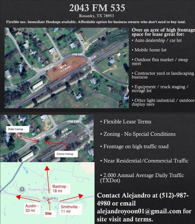 Prime ±1.35 acre of usable land with excellent road frontage on FM 535, just off Hwy 304 and minutes from Bastrop/Smithville. 30 miles from Austin. Flexible use potential; NO RESTRICTIVE ZONING REQUIREMENTS. Utilities: On-site water and electricity with hookups available. Frontage & Access: High-visibility site with wide road frontage on FM 535; easy in/out access for large vehicles and equipment. Ideal Uses: Outdoor storage, contractor yard, small retail/office trailer, car dealership, RV/boat storage, food truck court, flea market, mobile home lot, or other light commercial use. Flexible Terms: Short or long-term lease options available. Nearby Market: Close to growing Bastrop County population centers, with steady traffic along FM 535 (TxDOT average daily counts typically around 2,000). Bring your concept, open to all inquiries, minimal restrictions, easy to get started. Also open to leasing smaller space for just a food truck.