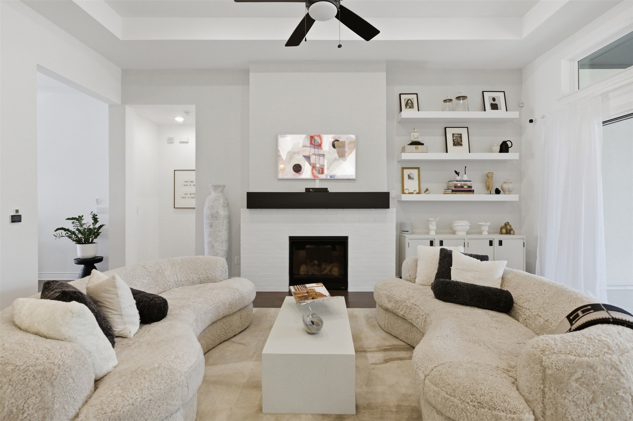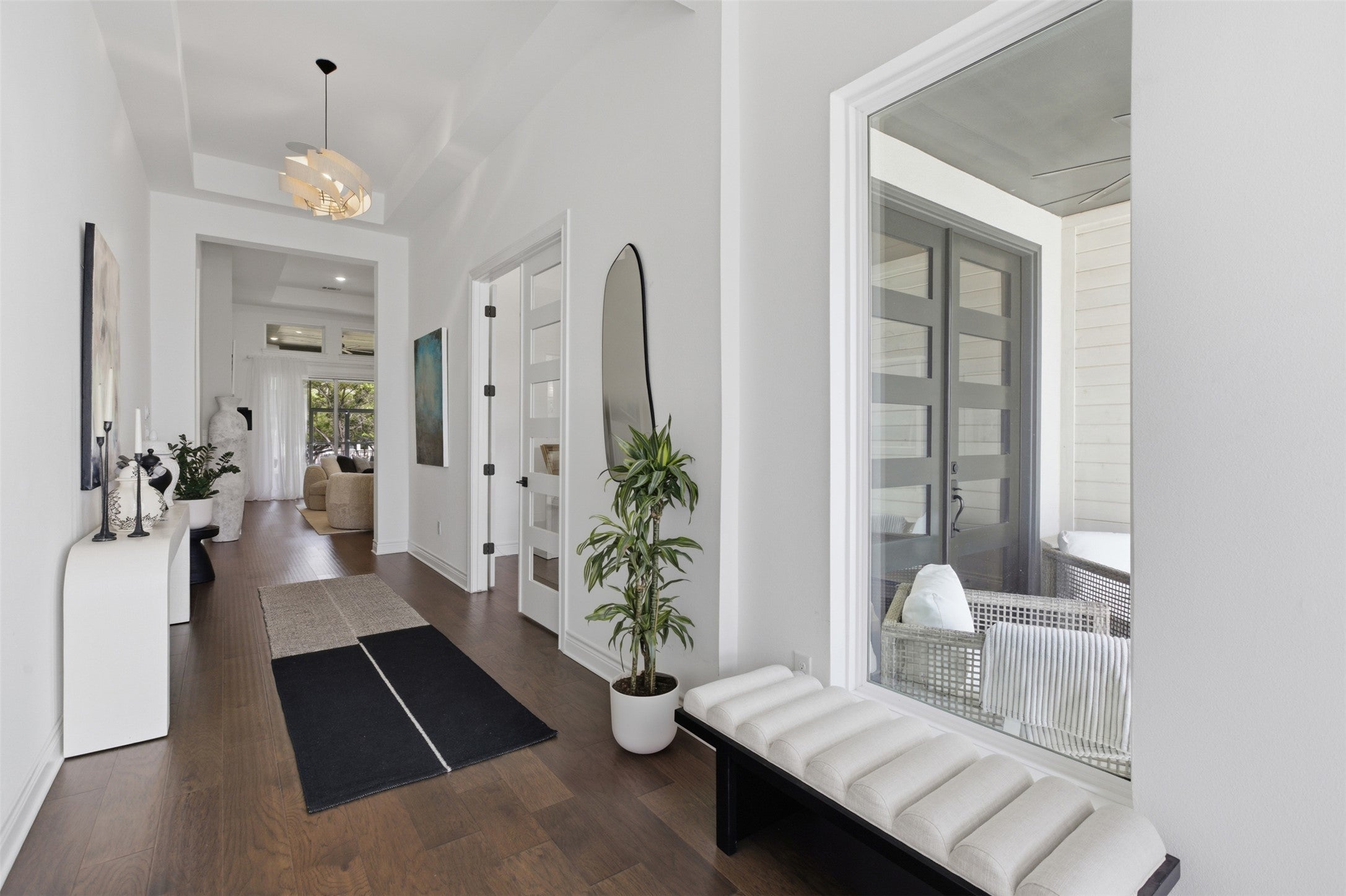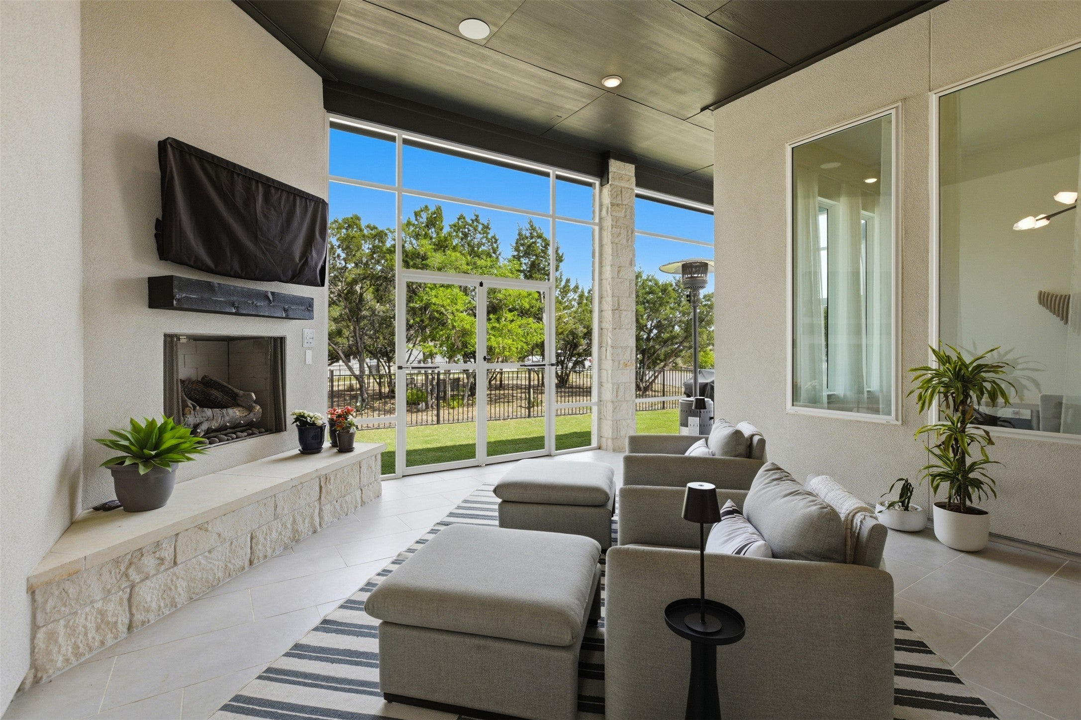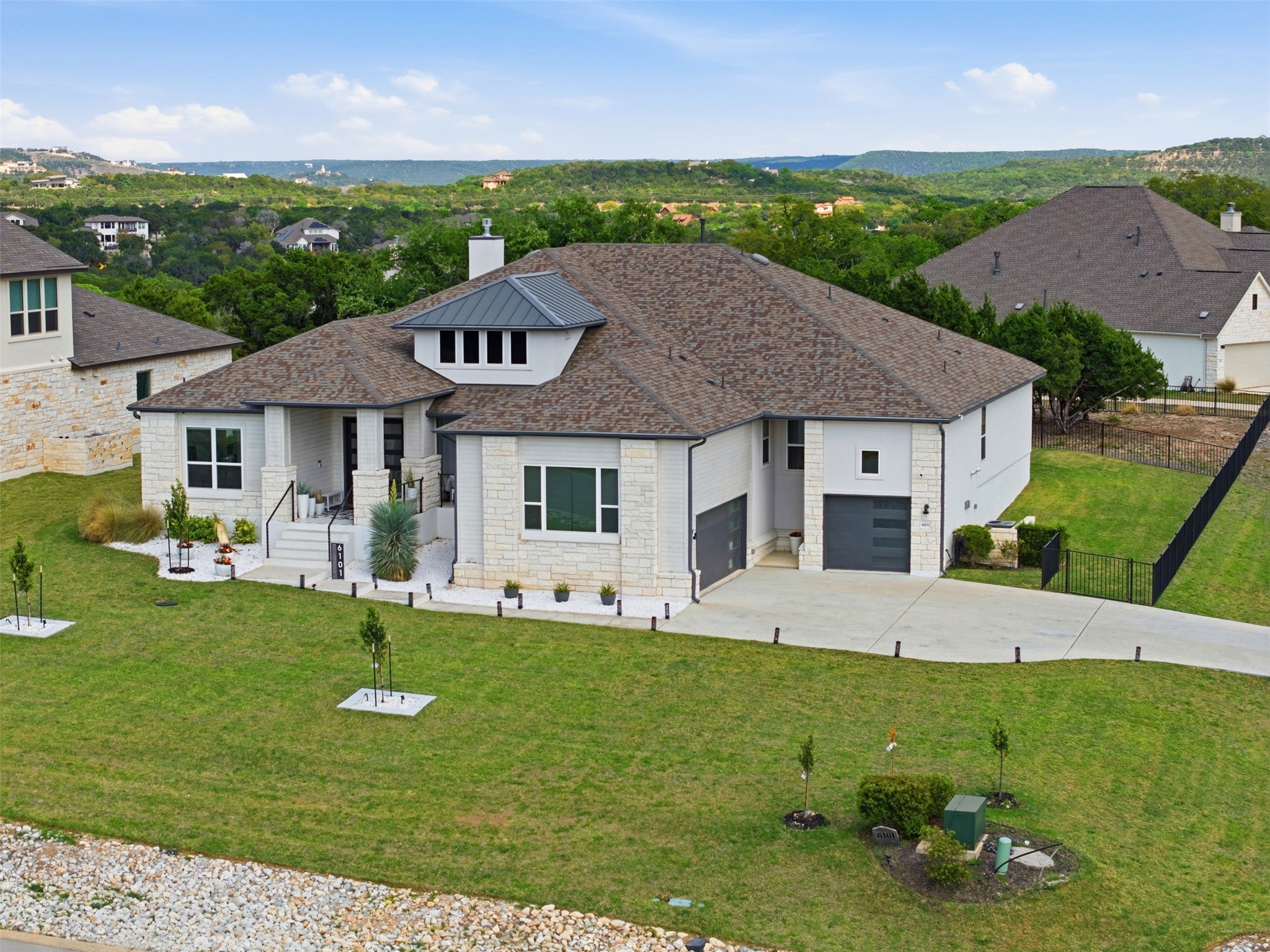 Also known as 6101 DESTINATION WAY... Single-story living meets thoughtful design in this 3,558 sq ft home in The Hollows on Lake Travis. Four bedrooms, four bathrooms, and a dedicated home office are spread across a floor plan that balances open, connected living with genuine privacy where it counts. The heart of the home is a wide-open kitchen, dining, and living area anchored by a brick fireplace and built-in shelving. White cabinetry to the ceiling, quartz countertops, a large center island, gas cooktop, double wall ovens, butler's pantry, and walk-in pantry complete a kitchen built for real use. The screened sunroom extends the living space year-round with its own outdoor fireplace and direct access to the backyard. The primary suite occupies its own wing with a spa-style bath featuring dual vanities, a soaking tub with marble surround, herringbone tile walk-in shower, and a large walk-in closet. A fourth bedroom sits in a separate wing off the foyer, ideal as a guest suite, in-law space, or private office. A dedicated media room and secondary flex dining space round out the interior. Outside, a concrete paver fire pit patio sits beneath a mature oak and cedar canopy with additional seating areas throughout the yard. Life at The Hollows extends well beyond the property line. The Beach Club delivers an infinity-edge pool, fitness center, and the Wild Hare Bar & Grill. Pickleball courts, miles of trails, private kayak storage, and the deep-water NorthShore Marina round out a resort-style lifestyle that manages to feel genuinely unhurried. The community's social calendar, from the Wine Club and Whiskey Society to Book Club, Yoga, and Travelers, reflects neighbors who take real pride in where they live. Peaceful and private. Wonderfully close to Austin.