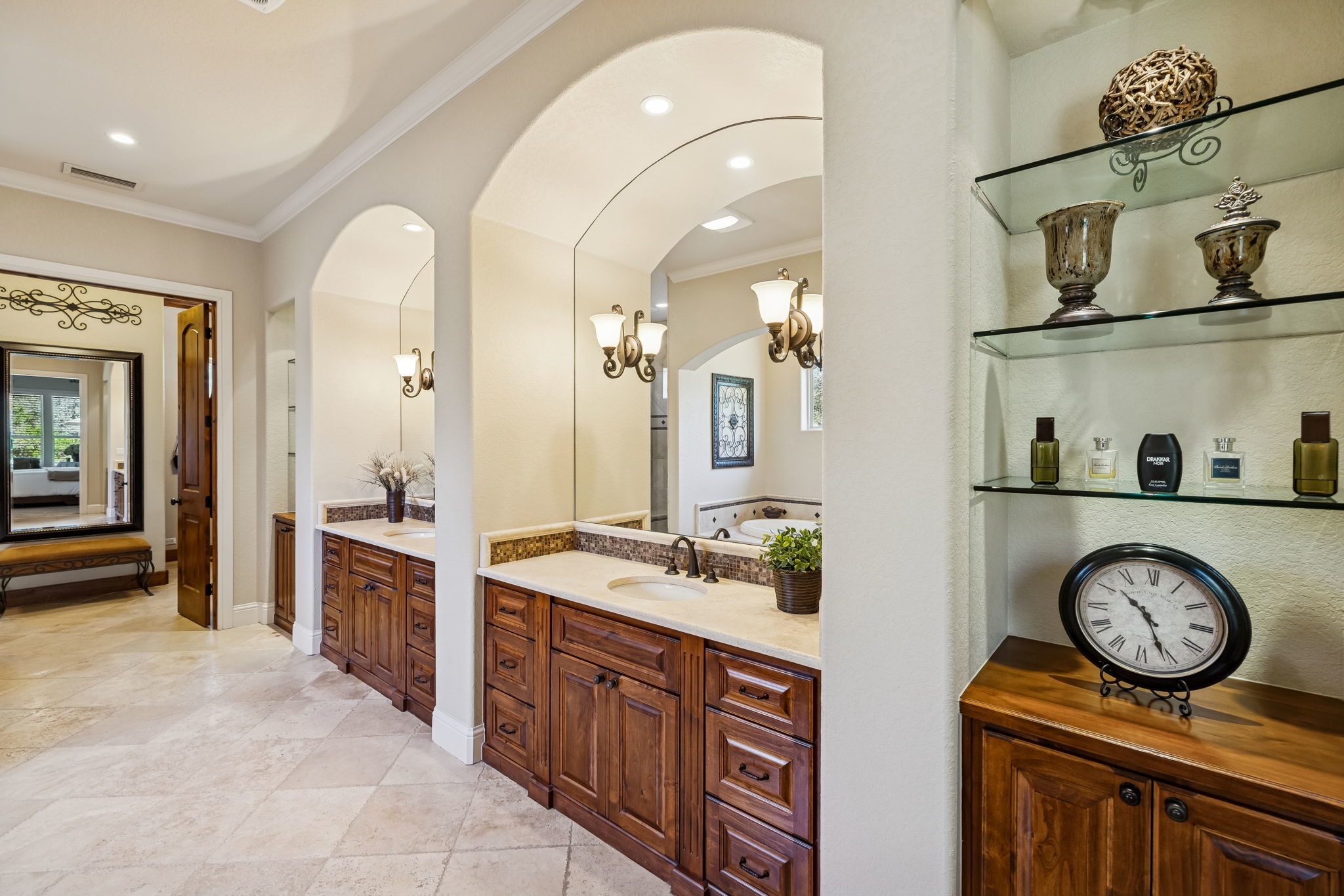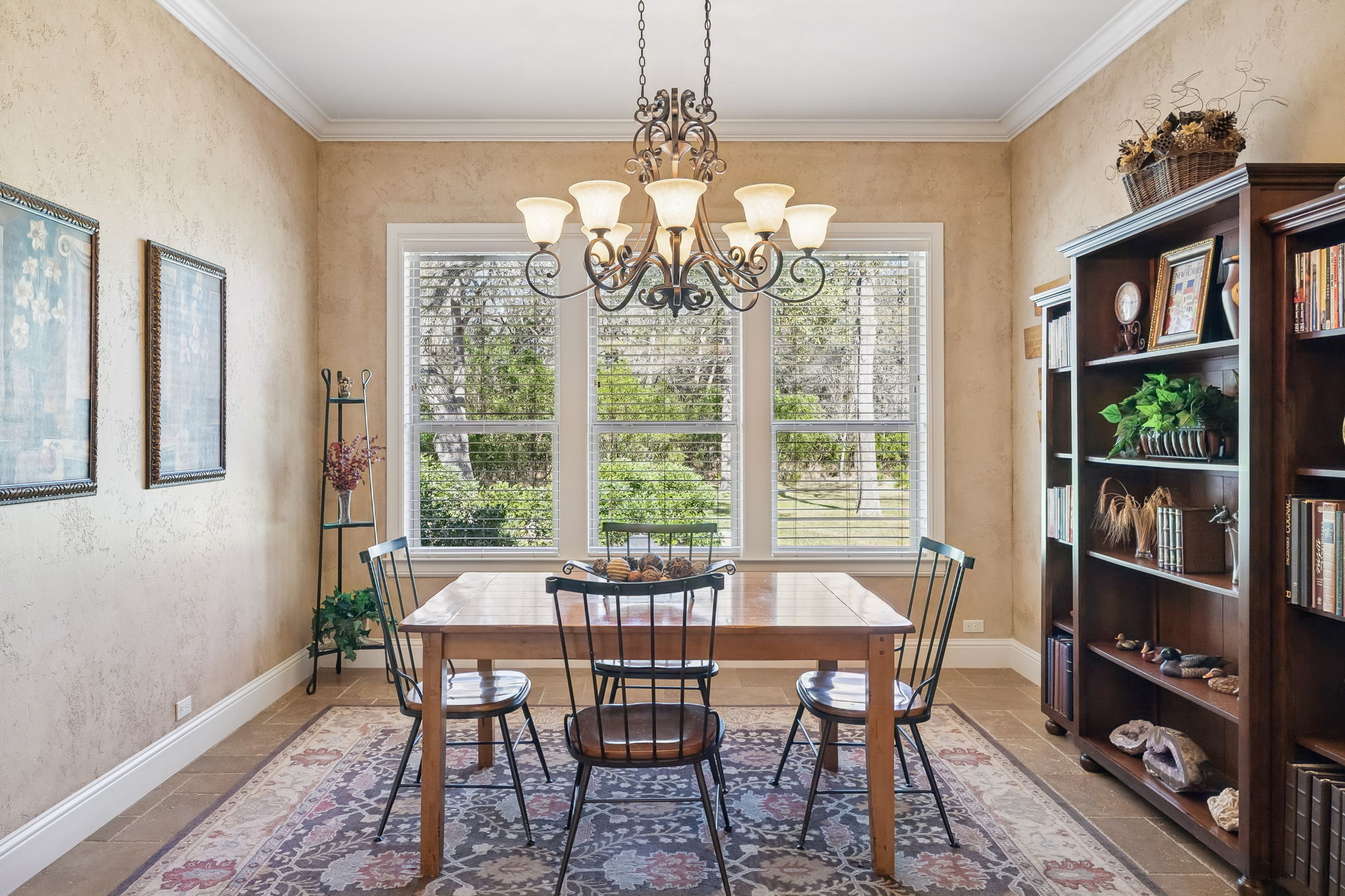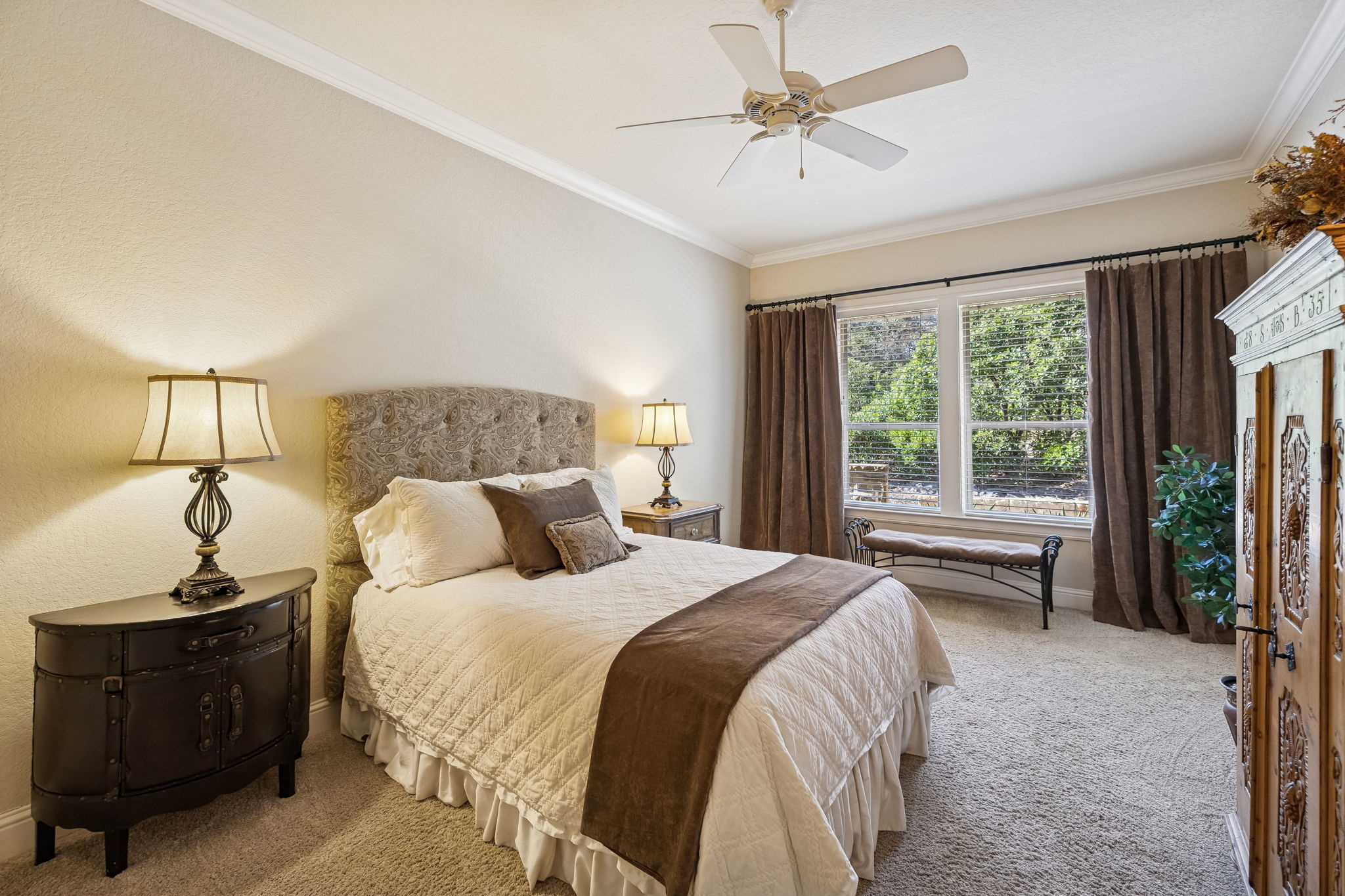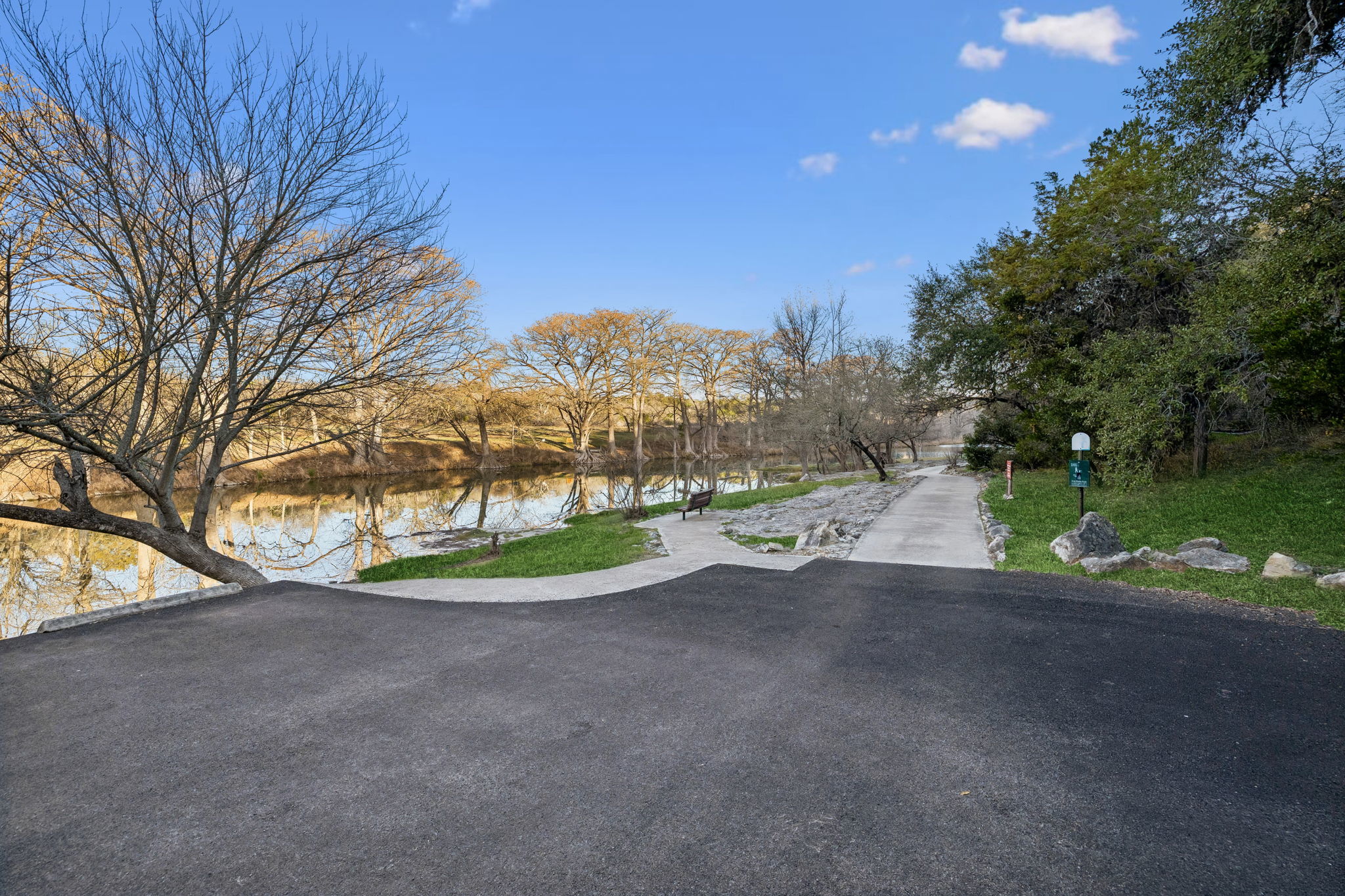 River access. Gated privacy. Hill Country craftsmanship. This Riverforest home blends exceptional construction with one of the area’s most desirable lifestyles—private access to the Guadalupe River, scenic walking trails, and neighborhood amenities including a clubhouse and sport courts. And when you’re ready for a night out, historic Gruene is less than 10 minutes away, putting live music, dining, and shopping close to home. Outdoor living shines with a covered patio featuring a wood ceiling, recessed lighting, built-in speakers, and electric motorized blinds—a true year-round retreat. The outdoor kitchen offers granite counters and tile backsplash, while a built-in stone gas firepit and professionally landscaped yard with accent lighting create the perfect evening gathering space. Inside, quality craftsmanship carries throughout with travertine floors, hand-troweled walls, crown molding, and custom cabinetry. The living room features a coffered ceiling, stone fireplace, and built-ins, with large doors opening to the patio for seamless indoor-outdoor entertaining. The gourmet kitchen includes granite countertops, a large island, custom cabinetry, a seven-burner gas cooktop, and walk-in pantry. A dedicated study with built-ins offers a great work-from-home space. The primary suite features tray ceilings and a spa-style bath with dual vanities, soaking tub, walk-in shower, and custom closet. Finished with a Spanish tile roof and a three-car garage, this home delivers the relaxed Guadalupe River lifestyle Riverforest is known for.