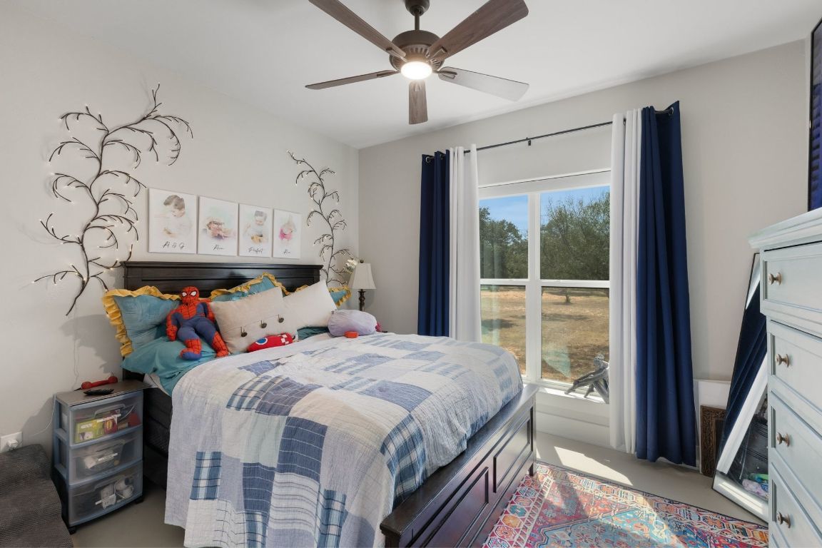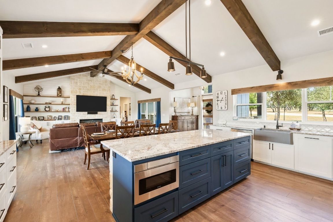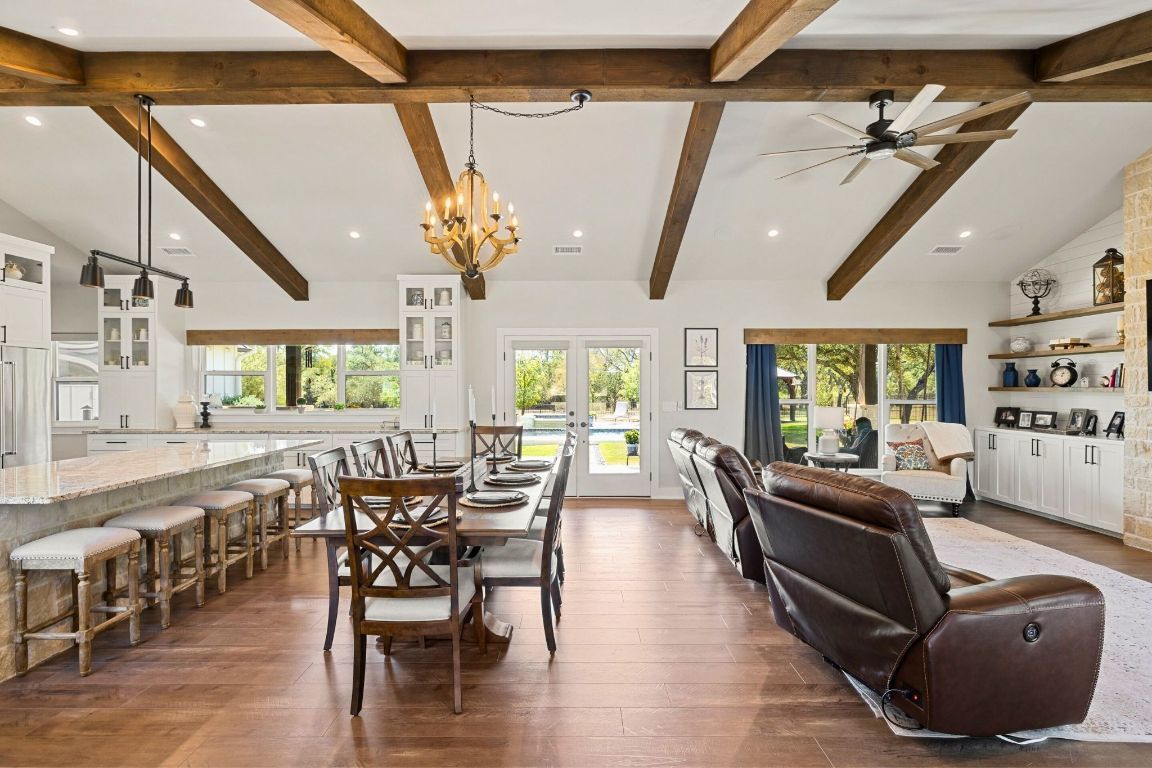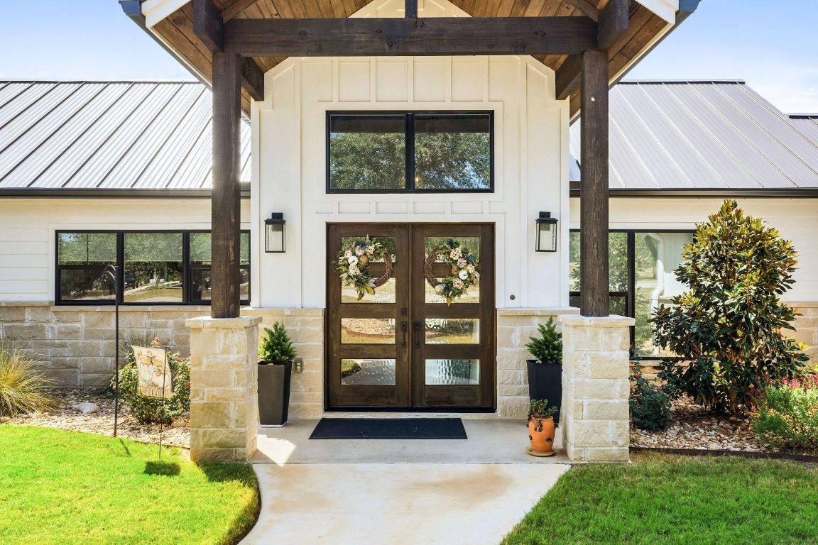 This custom-built 4-bedroom, 3.5-bath modern farmhouse pairs timeless design with thoughtful upgrades, creating a warm yet sophisticated Hill Country retreat. Set on 3 acres, the home offers both privacy and convenience, with expansive outdoor living and an open-concept layout designed for today’s lifestyle. Inside, beamed ceilings, wide-plank hardwood floors, and walls of windows set the tone for refined country living. The chef’s kitchen features abundant custom cabinetry, pantry cabinetry with pull-out shelving, a coffee station, and an oversized island that flows seamlessly into the dining and living areas. Anchored by a stone fireplace and custom built-ins, the living room is equally suited for cozy evenings or lively entertaining. The primary suite is a true sanctuary with a stained wood tongue-and-groove ceiling, a spa-inspired bath with an oversized soaking tub, a towel warmer, and dual vanities, plus a custom closet with built-ins and automated clothing lifts. Additional bedrooms include a private en-suite guest room and a charming bunk room with built-in bunk beds, perfect for multiple kids, family, or visitors. A dedicated study with custom cabinetry and a versatile den with barn-door storage provide flexible spaces for work and leisure. Outdoor living is at the heart of this property. A resort-style pool and spa with glass tile detailing invite relaxation, while a covered pergola, spacious porches with tongue-and-groove wood ceilings, and wide open views create the perfect setting for gatherings. A stone-clad 20x20 storage building with dual garage doors offers practical function, complemented by a 25,000-gallon rainwater harvesting system. Blending modern luxury with timeless farmhouse character, this property delivers a rare opportunity to embrace Hill Country living at its finest. *Owner occupied - please allow 24 hour notice for showings*
