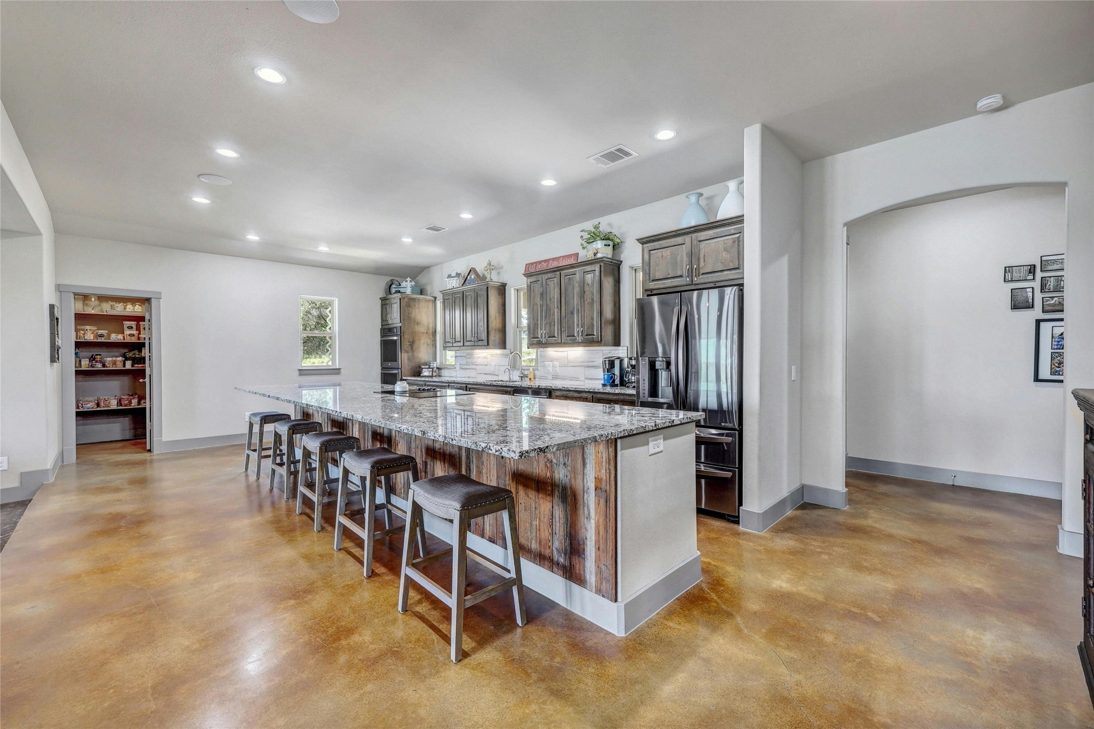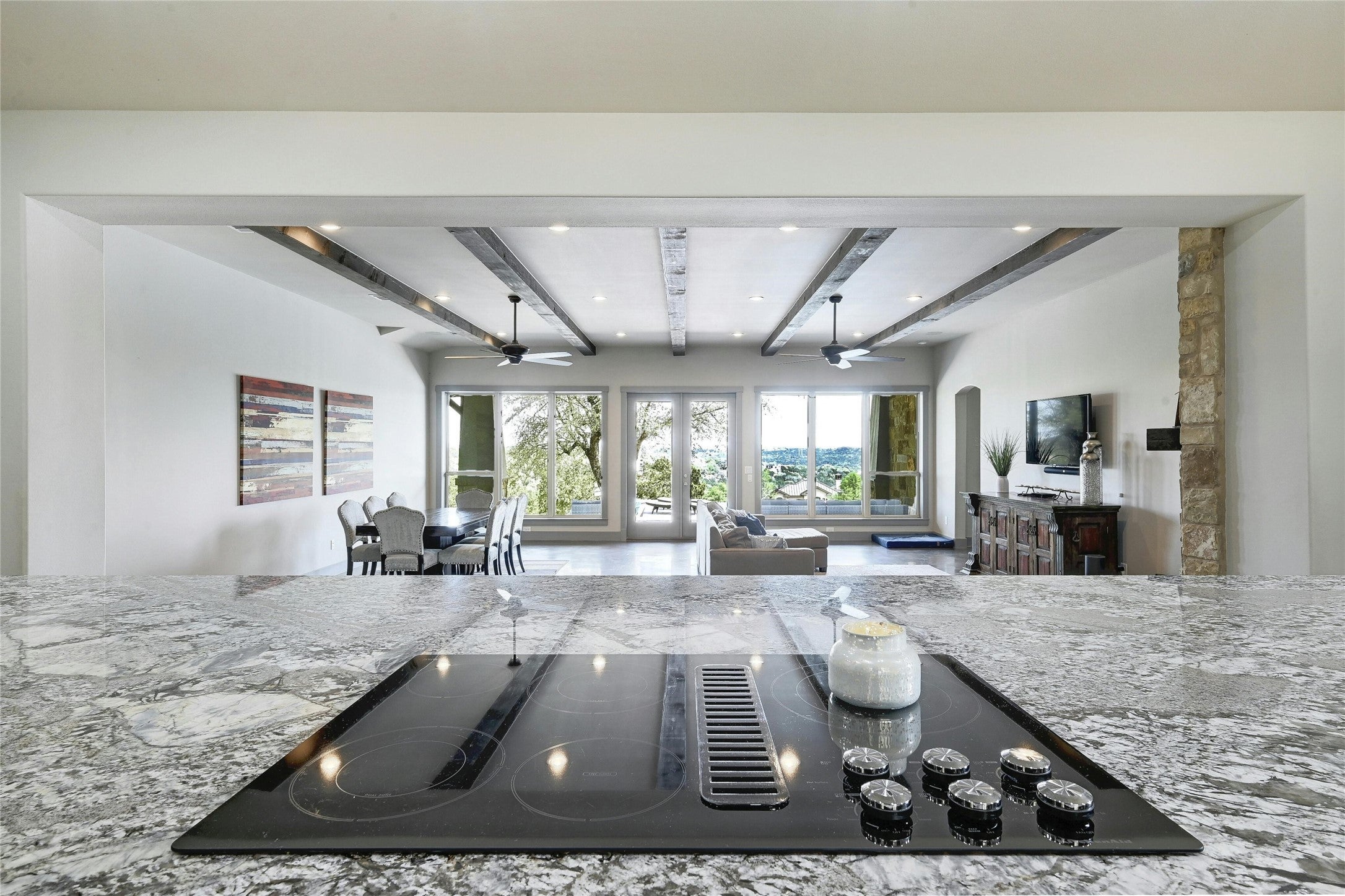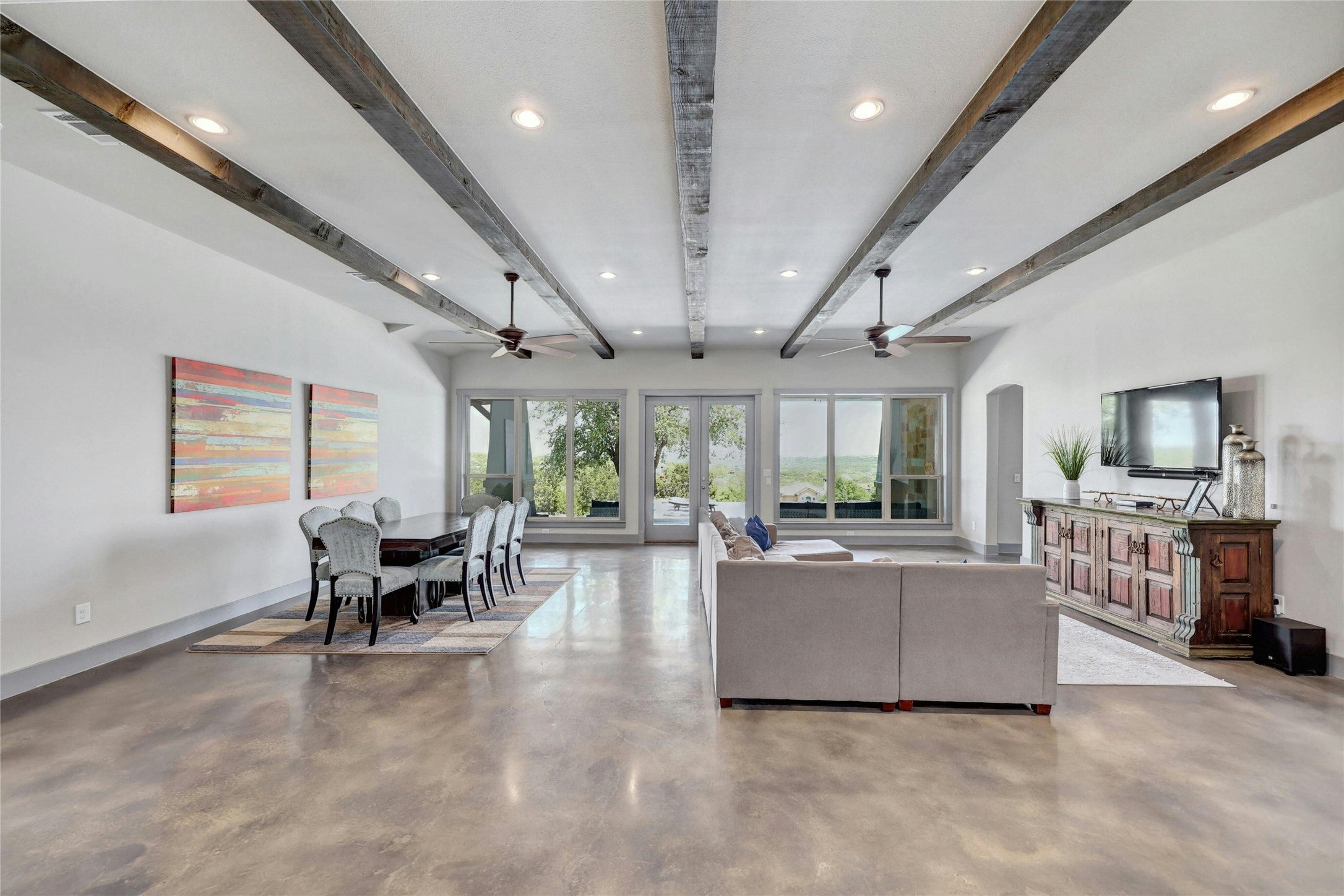 Discover this exceptional 3.1+ acre retreat, tucked away in the highly sought-after Spicewood community of Travis Settlement! Just minutes from Lakeway and Rough Hollow, this immaculate home offers panoramic hilltop views that stretch for miles. Inside, a stunning wall of windows showcases breathtaking views of the Hill Country and the sparkling pool, blending seamlessly with the spacious, open-concept kitchen, dining, and living areas. Designed for single-story living, the majority of the home-including all 4 bedrooms and 3 full baths-are on the main level, with an additional upstairs living room perfect for guests or teens. The expansive garage and wide driveway offer ample space for vehicles and storage. Durable, polished concrete floors are both energy-efficient and timeless. Whether you enjoy paddleboarding or boating, Travis Settlement offers exclusive, private access to Lake Travis and a gated private, maintained creekside park on Bee Creek. You'll fall in love with the stunning pool featuring a 60' lap lane and the picturesque views surrounding you-morning sunrises over the pool and sunsets on the other side create a tranquil outdoor living space, perfect for summer gatherings with afternoon shade. Enjoy spectacular fireworks displays on the 4th of July and endless opportunities to entertain and make lasting memories. Tons of FLAT acreage remaining to create a sports court, man cave, tiny home, or whatever you desire! Low taxes save you hundreds each month. This serene home is right around the corner from top-rated schools, dining, shopping, and the Hill Country Galleria. With the recent addition of the 1,500+ acre park purchased by Travis County, you'll enjoy uninterrupted views, lush green spaces, and minimal traffic-truly a rare find! Seize the chance to make this peaceful, unparalleled setting your own!