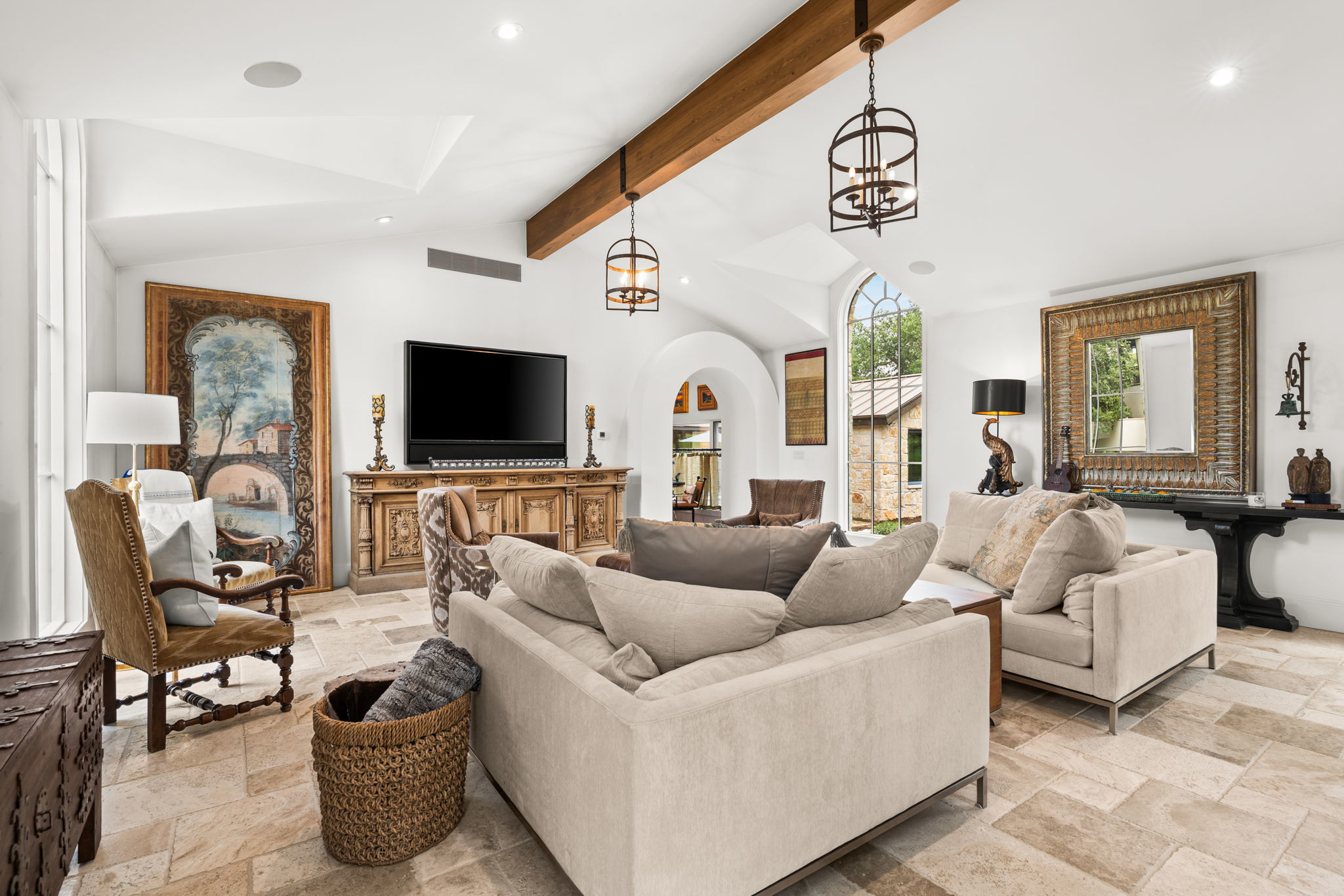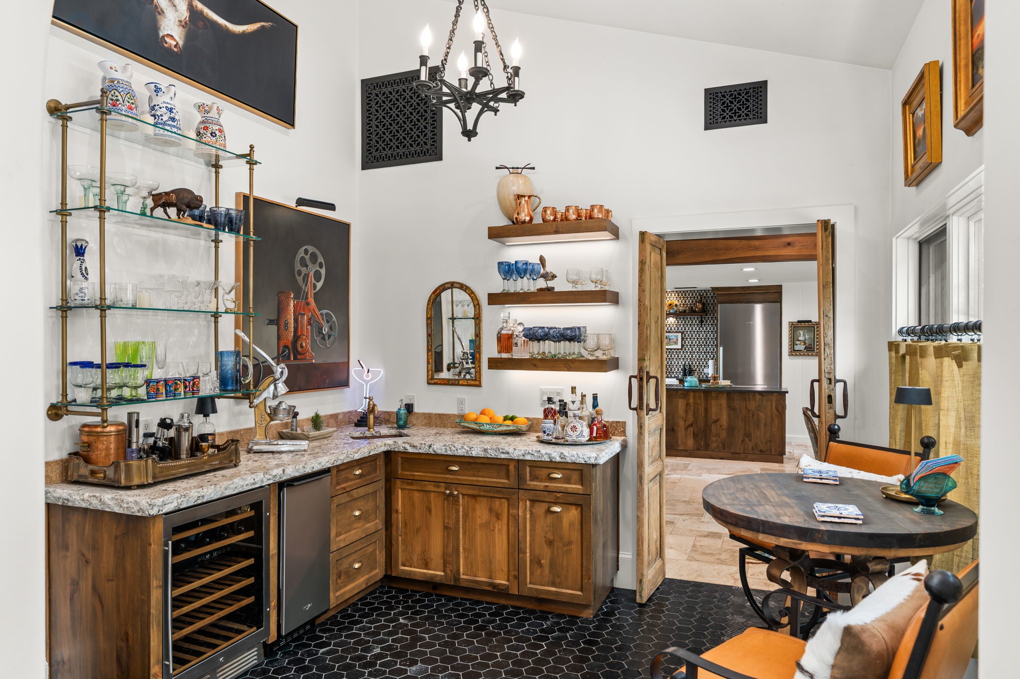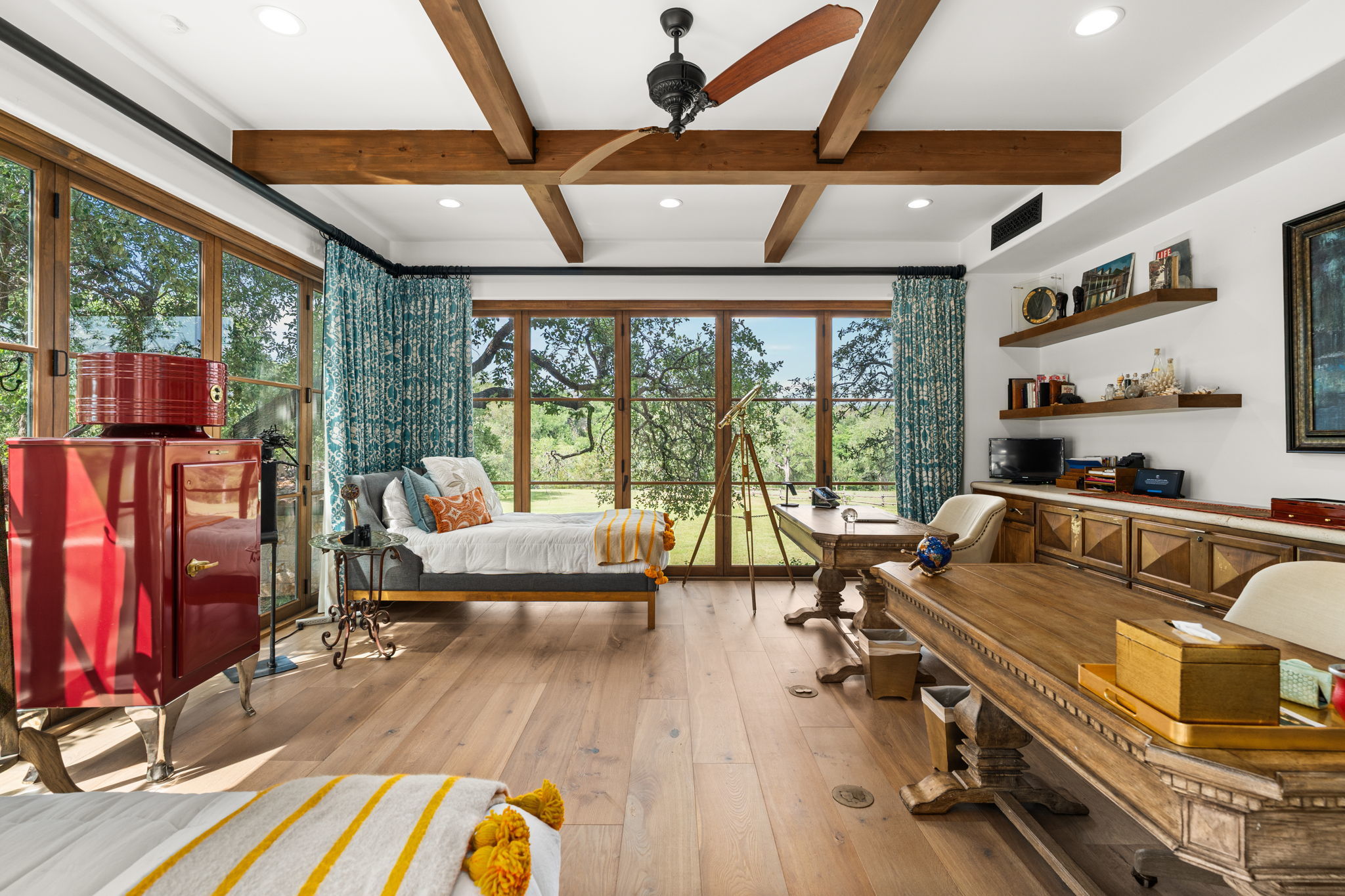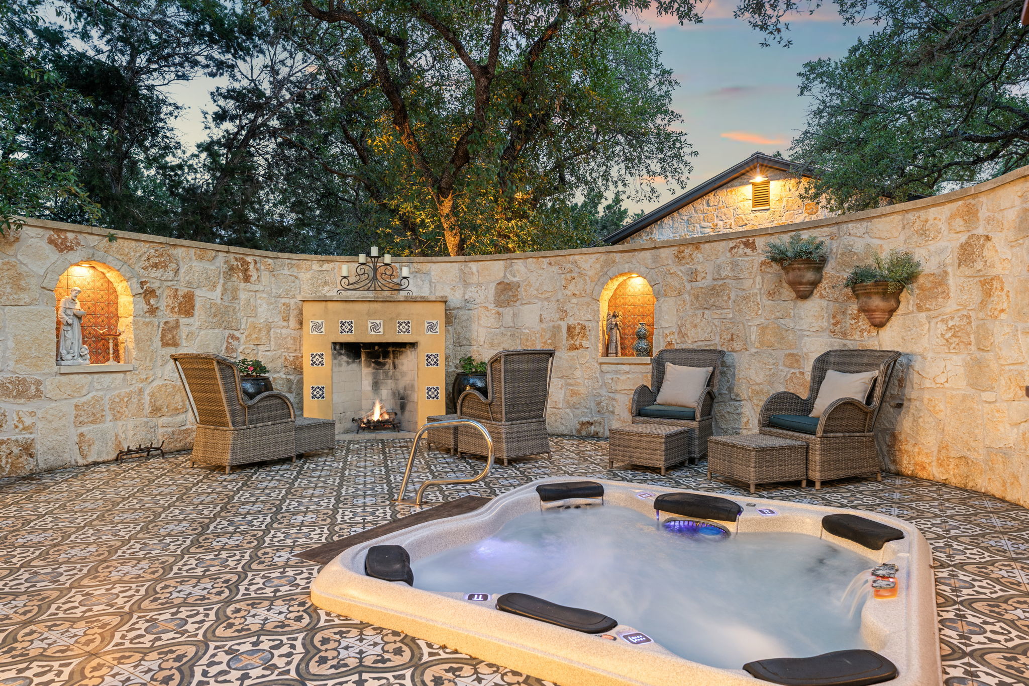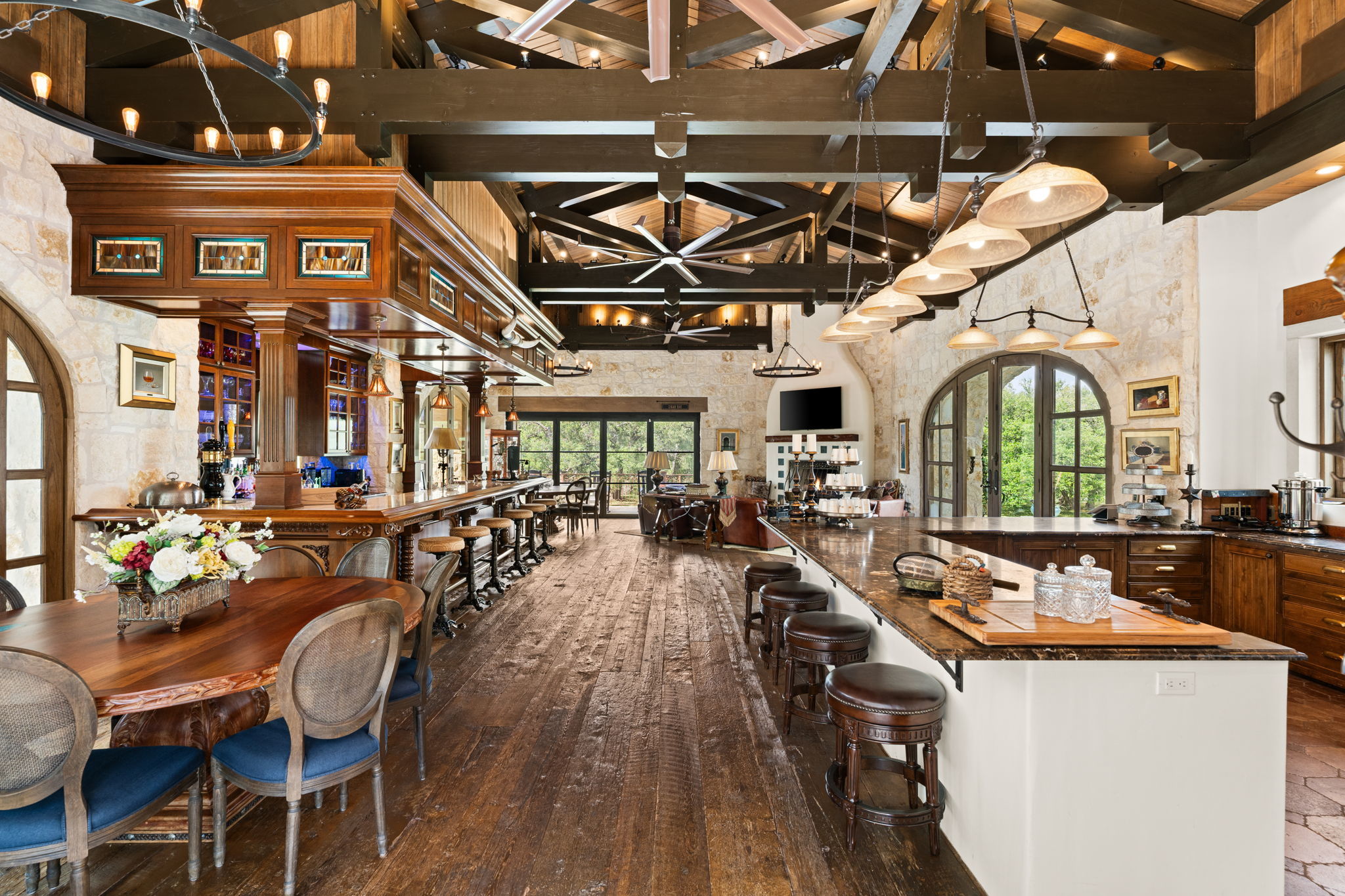 Please watch the video. Secluded Hill Country Sanctuary on 8 Iconic Acres Along Barton Creek. Tucked behind three layers of security—Paraiso Escondido is a secluded Hill Country estate where nature, artistry, and luxury converge. This private sanctuary encompasses over 6,300 square feet of living across multiple structures. At the heart of the property lies the 4,049 sq ft main residence—a home that blends timeless elegance with worldly influences. Warm wood beams, handcrafted Moroccan/Spanish tilework, and imported light fixtures create a rich, layered aesthetic that’s both inviting and sophisticated. The primary suite is a true retreat, with vaulted ceilings, a cozy fireplace, and a spa-inspired bathroom featuring a steam shower, heated floors, and access to a private zen garden, complete with outdoor shower, fireplace, & hot tub. Additional accommodations include a luxurious guest suite with a spacious bath; a bunkroom with four beds & full bath; & a flexible loft space with Murphy bed & full bath—ideal as an office, game room, or extra sleeping quarters. A separate guest house opens to sweeping Hill Country views through a wall of accordion glass doors, creating a seamless indoor-outdoor experience. Upstairs, a state-of-the-art gym offers a private wellness sanctuary. Enjoy the charming, climate-controlled wine room, which is beautifully appointed for tastings & storing your most prized bottles. Entertain guests in the pavilion featuring a rustic yet refined Texas-style bar & lounge featuring reclaimed wood floors, a statement fireplace, & a large built-in bar that seats 10 – 15 guests. A commercial-grade kitchen, including a Wolf range & Sub-Zero 48 fridge, opens to the resort-style pool and alfresco living spaces. Designed for unforgettable gatherings, the outdoor spaces include a poolside pizza oven, and the Barefoot Bar outfitted with a 36” Evo grill, rotisserie, fridge, & sink. A lighted bocce court adds to the entertainment experience.