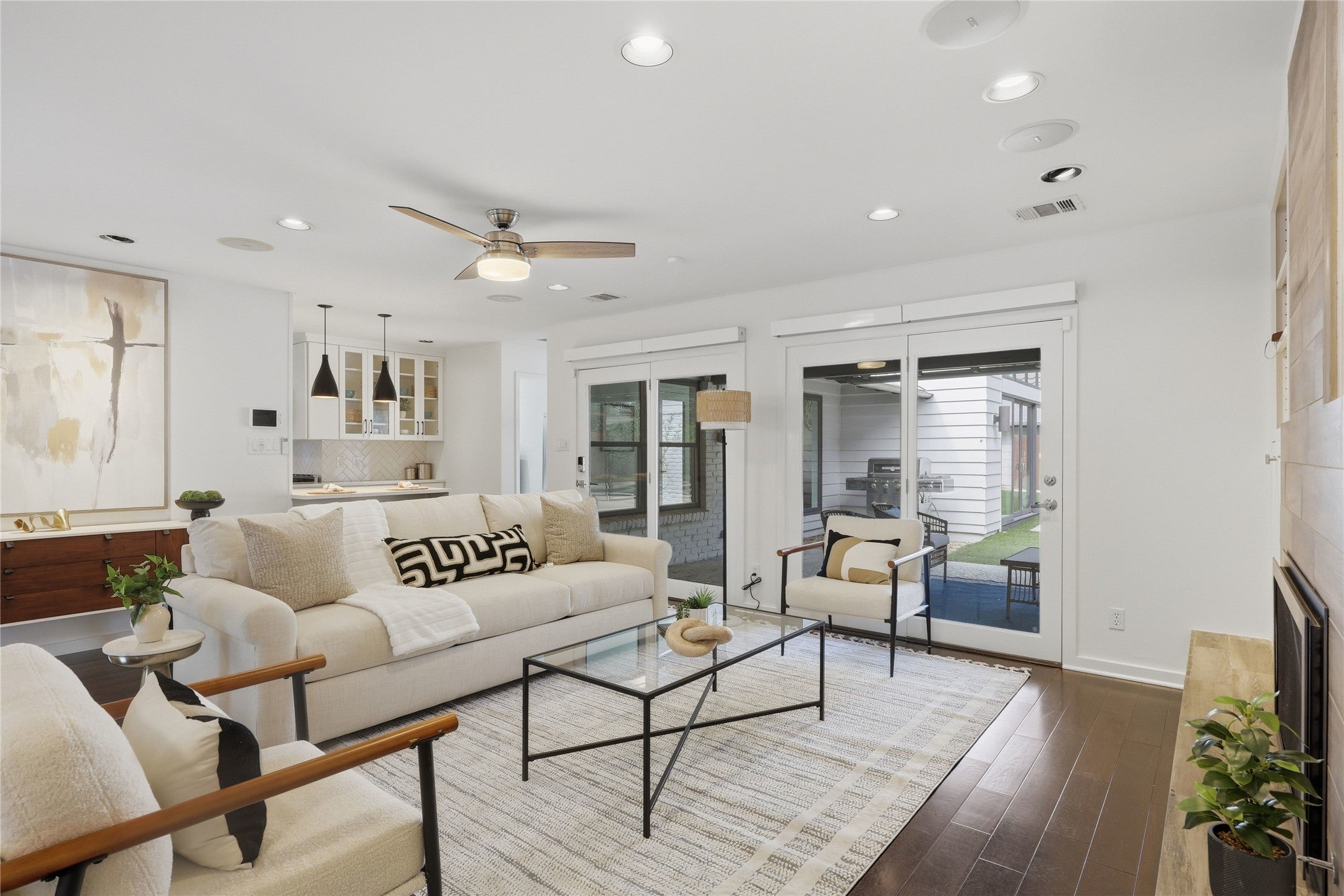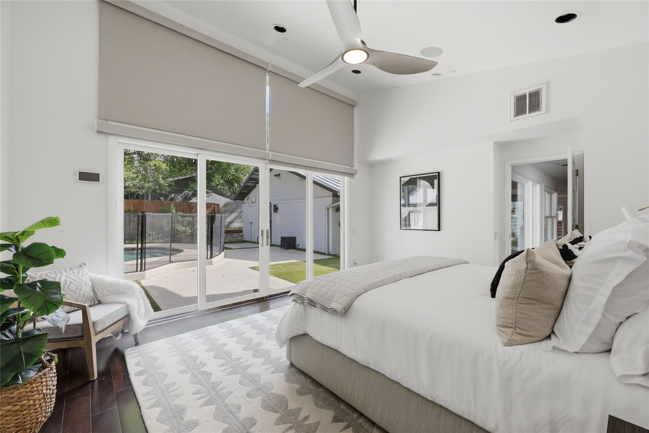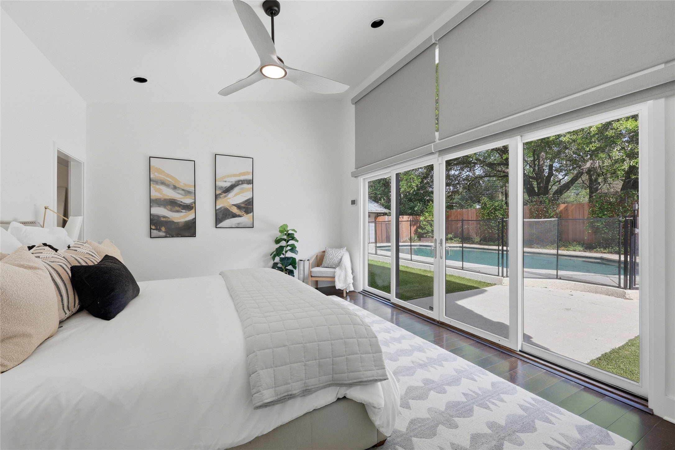 Experience the pinnacle of South Austin living in this stunning, updated single-story retreat in the heart of Barton Hills. Perfectly positioned for both relaxation and entertaining, the home welcomes you with a gated front courtyard and a bright, open interior that has been revitalized with fresh paint throughout. The seamless layout boasts hardwood floors, LED recessed lighting, a designer fireplace, and a remodeled chef’s kitchen featuring sleek countertops and premium stainless JennAir appliances. With four spacious bedrooms plus a dedicated home office, the floor plan is thoughtfully designed to include two primary suites. The main primary retreat is a true sanctuary, offering vaulted ceilings, custom walk-in closets, and a spa-style bath, all framed by a wall of sliding glass doors that overlook your private backyard oasis. The outdoor living space is a showstopper, centered around a sparkling pool with a child safety net and a generous deck for lounging under the shade of mature trees. Recent updates include professional landscaping and a low-maintenance turf lawn, ensuring a lush, green aesthetic year-round with minimal effort. Practicality meets peace of mind with a detached two-car garage, a natural gas backup generator, and smart home features including a Nest thermostat and exterior Wi-Fi security cameras. Located just steps from the Barton Creek Greenbelt and minutes from Downtown, this home combines modern convenience with the timeless charm of Austin's most sought-after zip code.