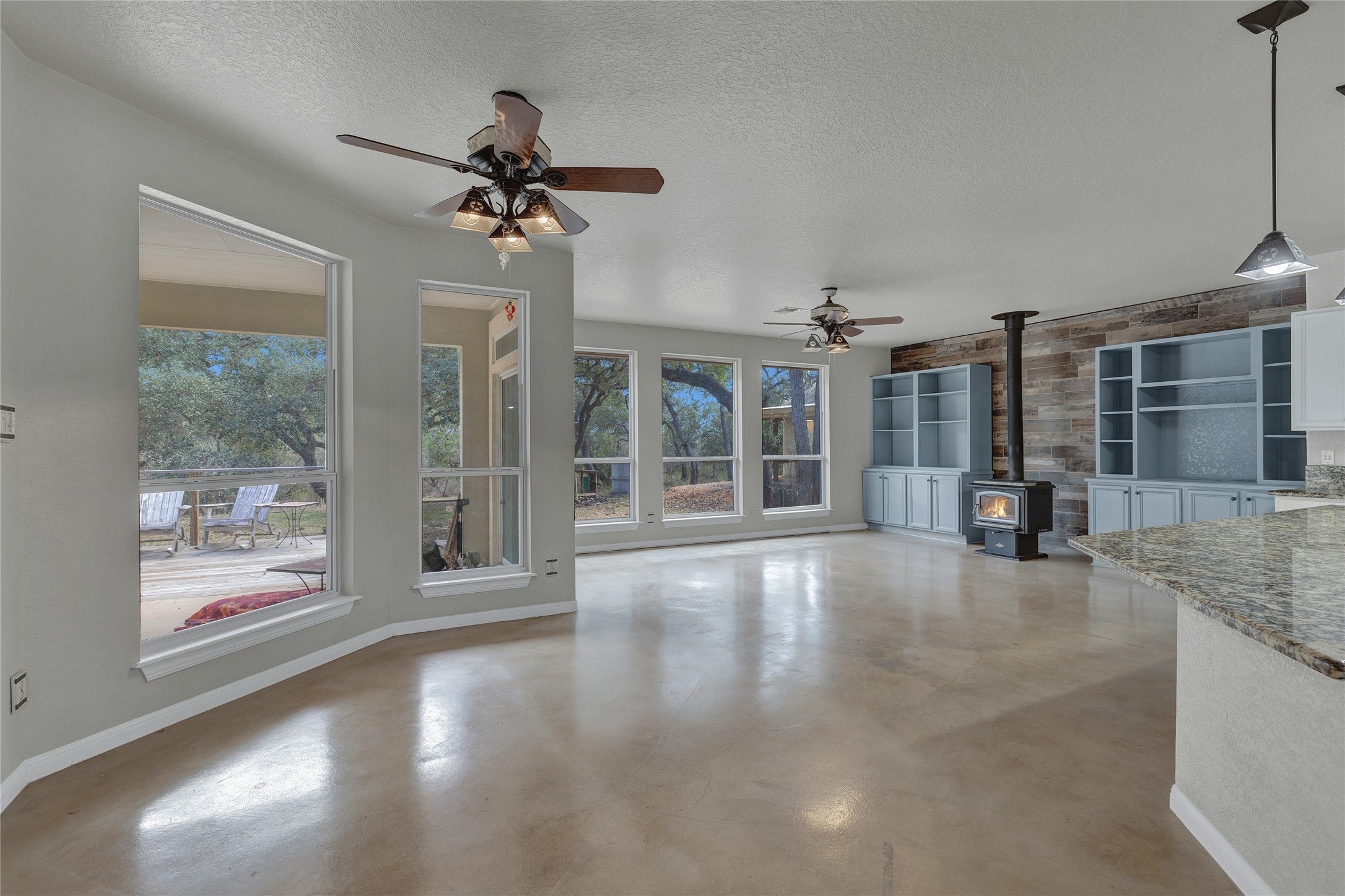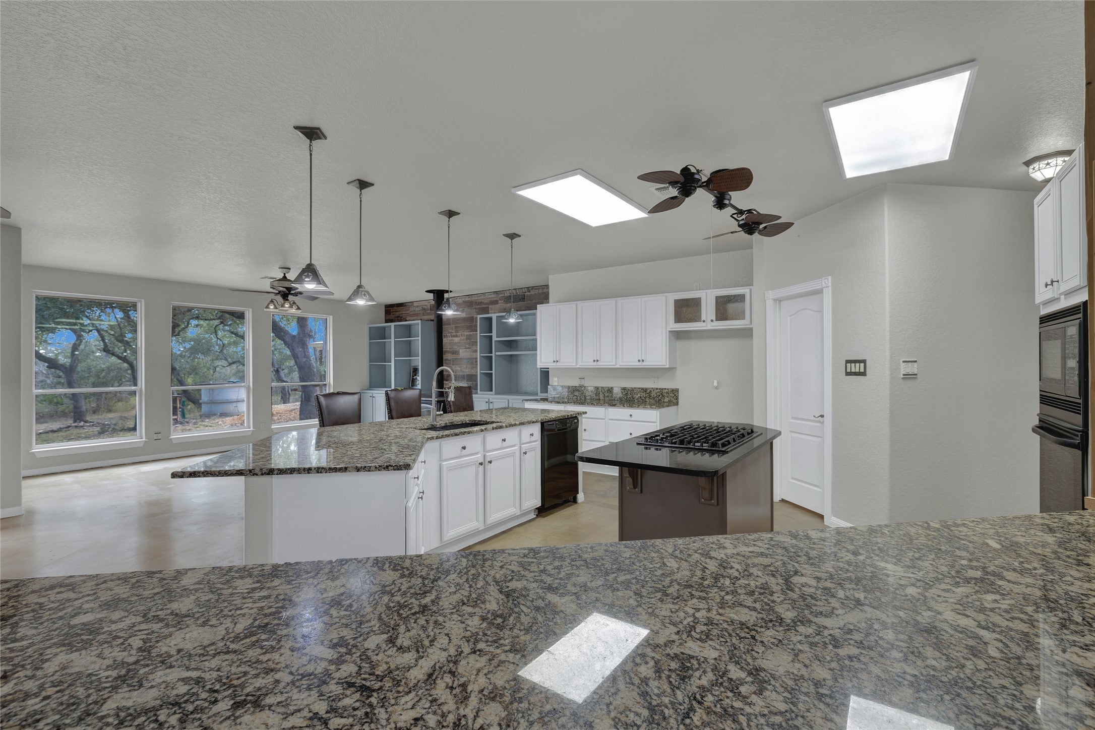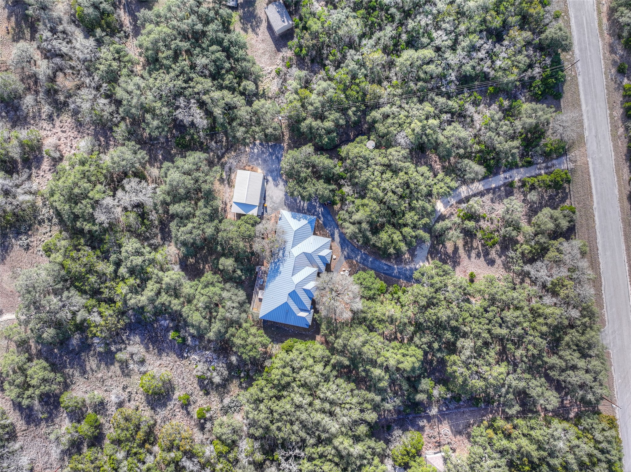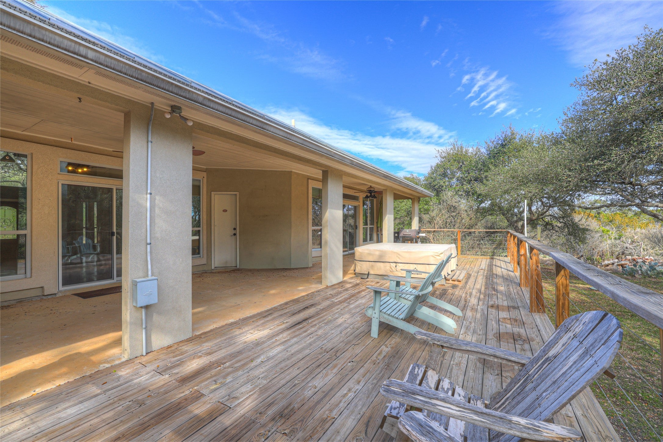 Don’t miss this stunning 4-bedroom, 2.5-bath, one-story home situated on 2.68 acres in the highly sought-after River Chase community, tucked away on a quiet cul-de-sac. Offering 3,024 square feet of thoughtfully designed living space, this open-concept home is filled with natural light, with every room enjoying picturesque views of the surrounding land. The spacious living area features stained concrete floors, built-in shelving, and a cozy wood-burning fireplace, all framing the beautiful outdoor scenery. Adjacent flexible spaces can be used as a breakfast room, formal dining area, or additional living space to suit your needs. A convenient half bath provides direct access from the expansive deck overlooking the beautiful land—perfect for indoor-outdoor entertaining. The kitchen boasts granite countertops with bar seating, gas cooking, open sightlines to the living area, and a generous pantry. The private primary suite offers serene greenbelt views from every window and features dual vanities, a claw-foot soaking tub, a separate shower with dual shower heads, large dual closets, and a spacious linen cabinet. Step directly from the primary suite onto a private deck with a hot tub, creating a true retreat. Two additional bedrooms share a Jack-and-Jill bathroom with privacy glass, allowing natural light while maintaining privacy. The attached oversized garage includes stairs to an attic space with potential for future conversion. In addition, a separate garage/shop provides extra vehicle parking, workshop space, and ample storage. This exceptional property offers privacy, versatility, and Hill Country charm—an ideal place to call home.